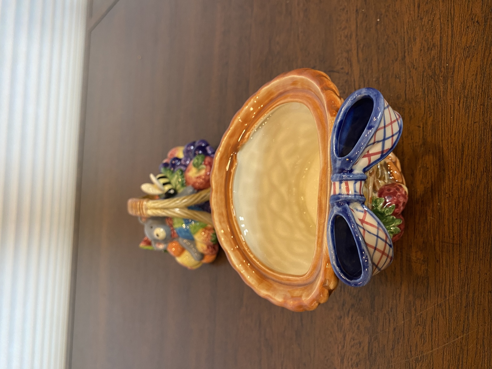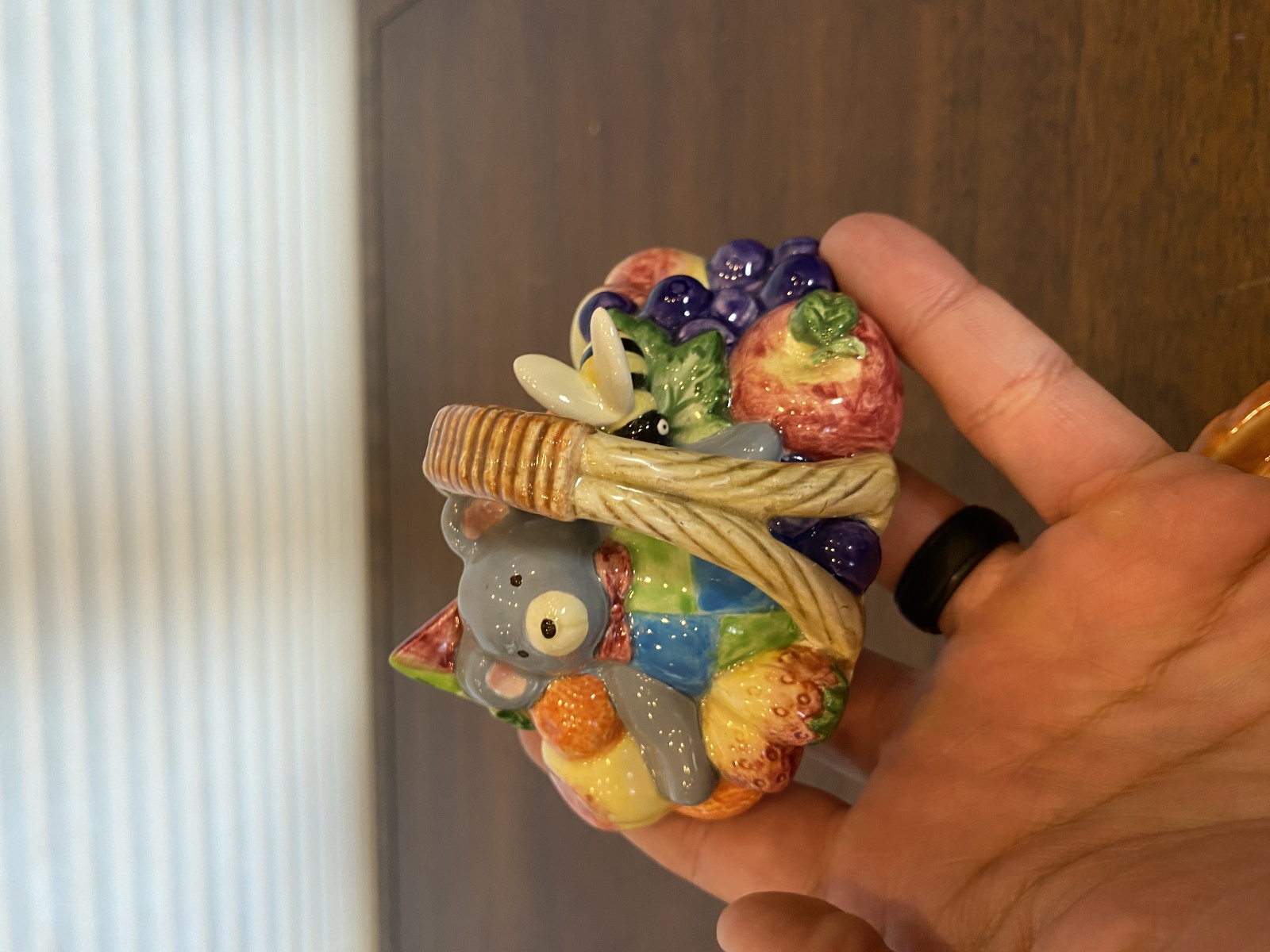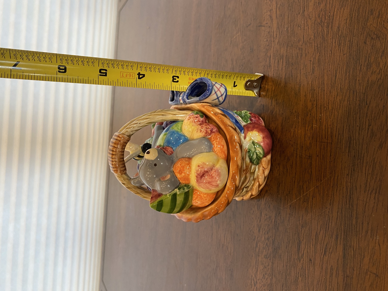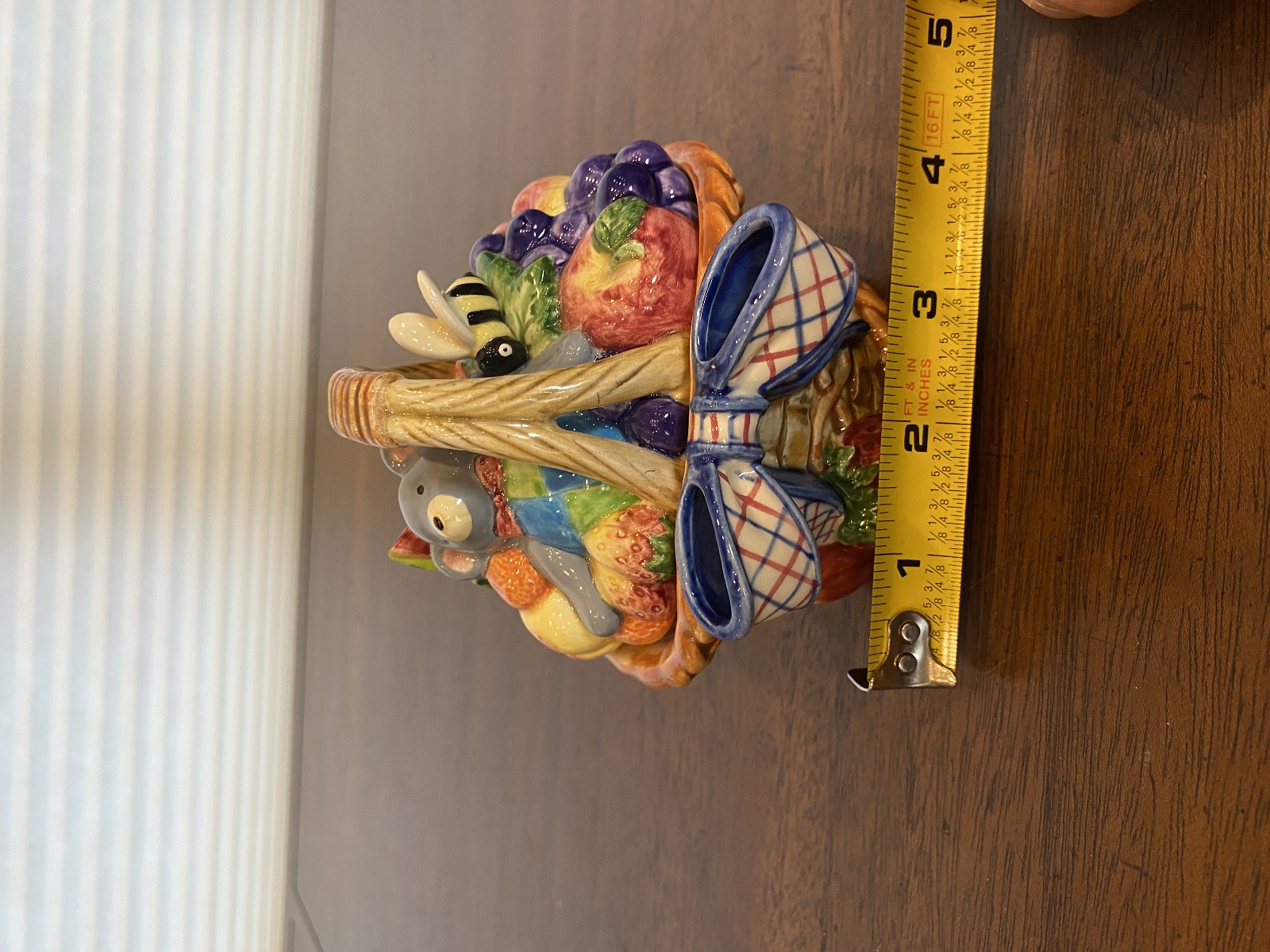 1996 HAND PAINTED Fitz & Floyd Bear/Fruit/Bee Ceramic Lidded Candy Dish 4.5"H