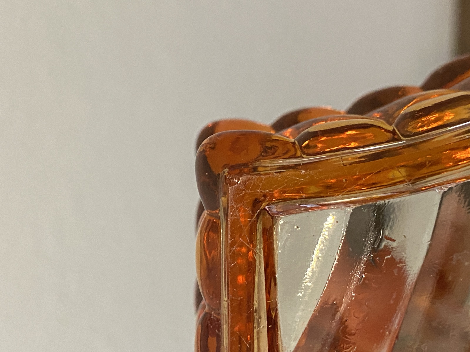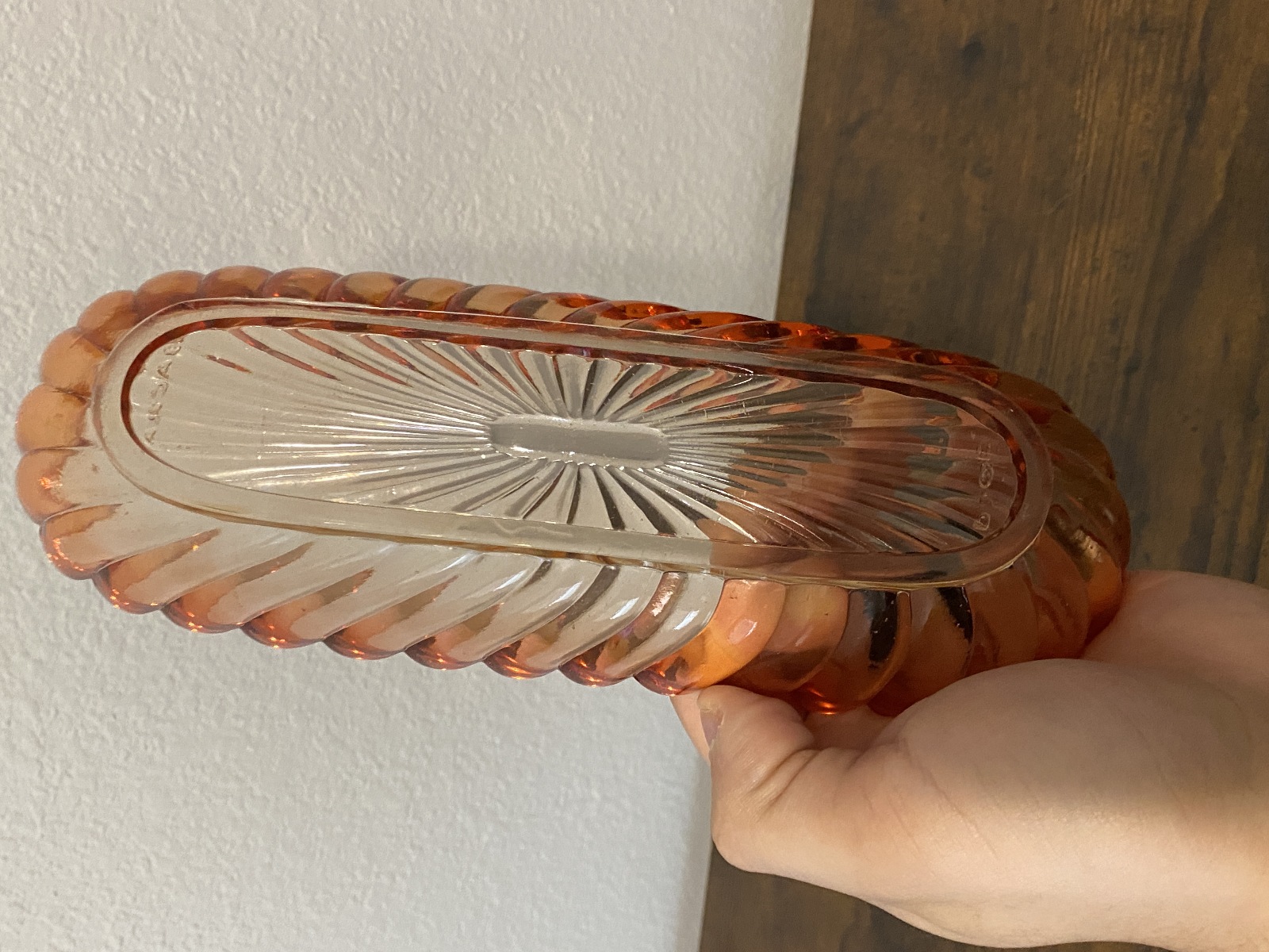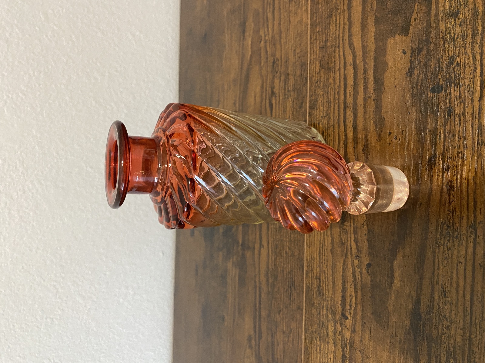 PLEASE NOTE THE BOTTLE AND STOPPER HAS SOME DAMAGE TO THEM(NOTED IN THE PHOTOS, Stopper has some chips and the side of the bottle has a chip too, the curved dish has a very tiny bite mark on the bottom, noted in the photos, and they all have some scratching from their many years of love, but overall this set is in really good shape for its age. (Please refer back to the photos for condition and feel free to message me if you have any questions. Thank you)!