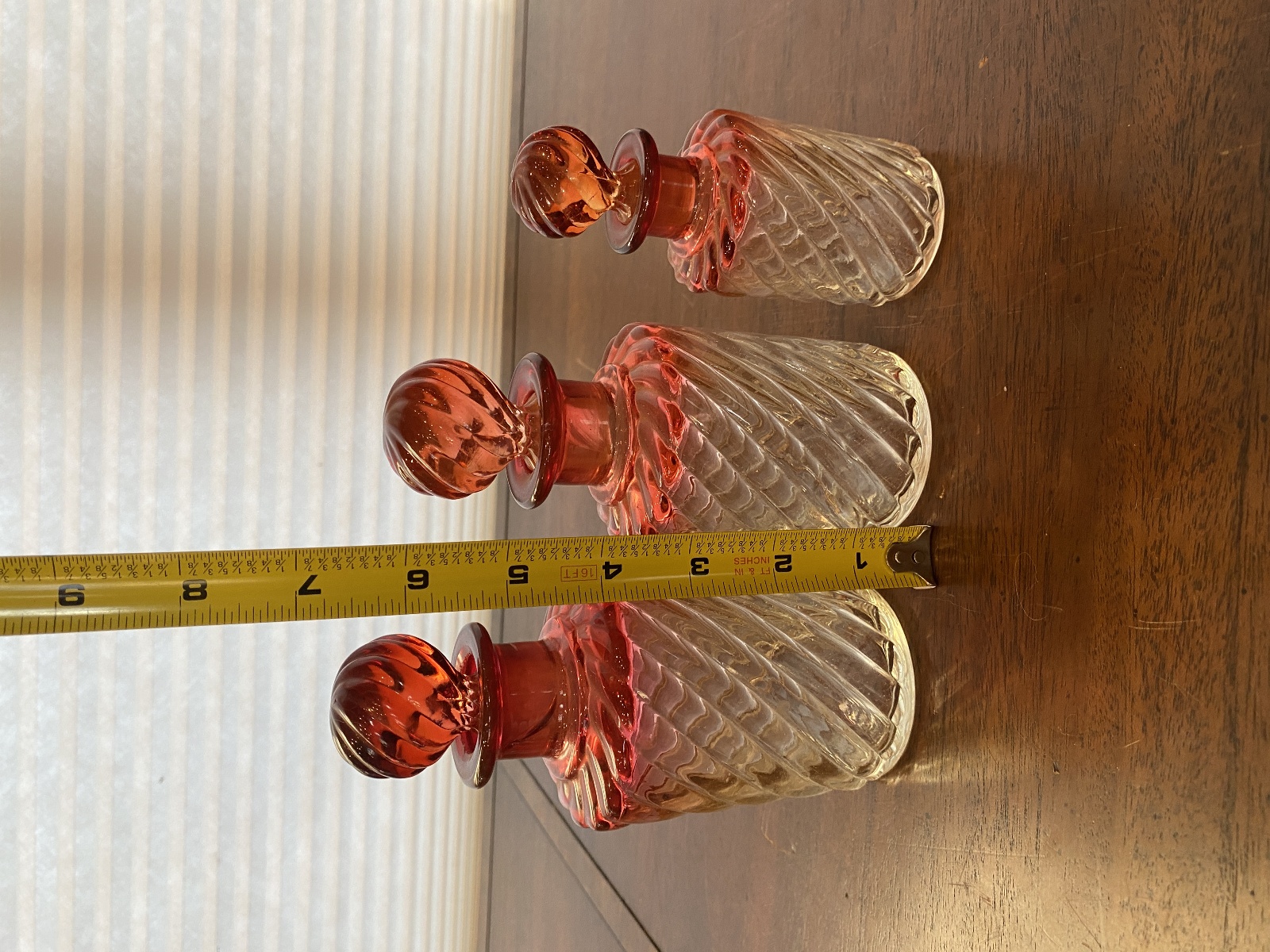 Approximate measurements 3"W x 6.5"H(Tallest bottle) 5 1/8"H(Without Stopper), 2.5"W x 6"H(Medium height one) 4.5"H(Without Stopper), 2"W x 4.75"H(Smallest One) 3.75"H(Without stopper) 100% of the proceeds go to the registered non profit Cards of Love Inc. and with your purchase you are helping raise money to fund scholarships for at risk youth. Thank you!