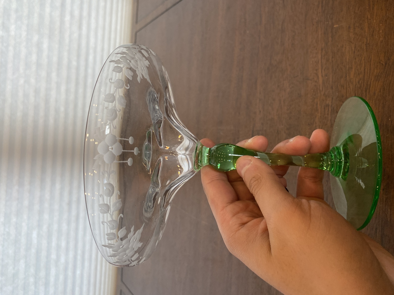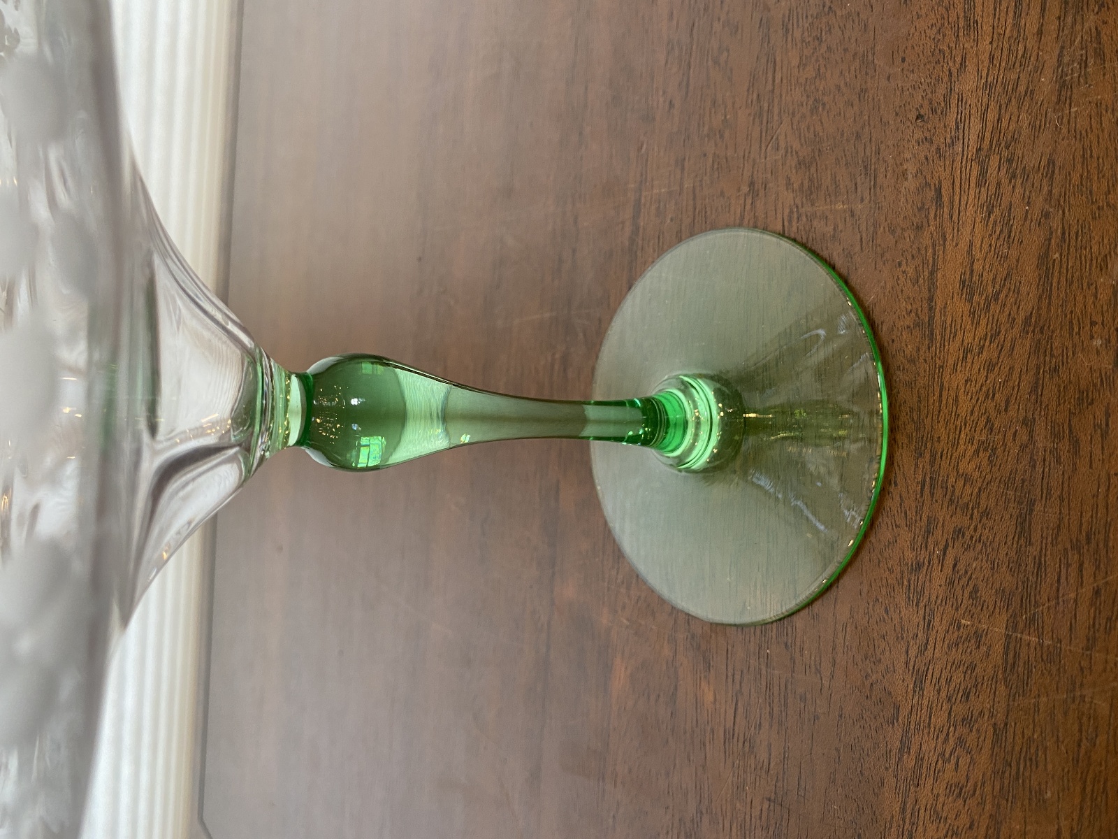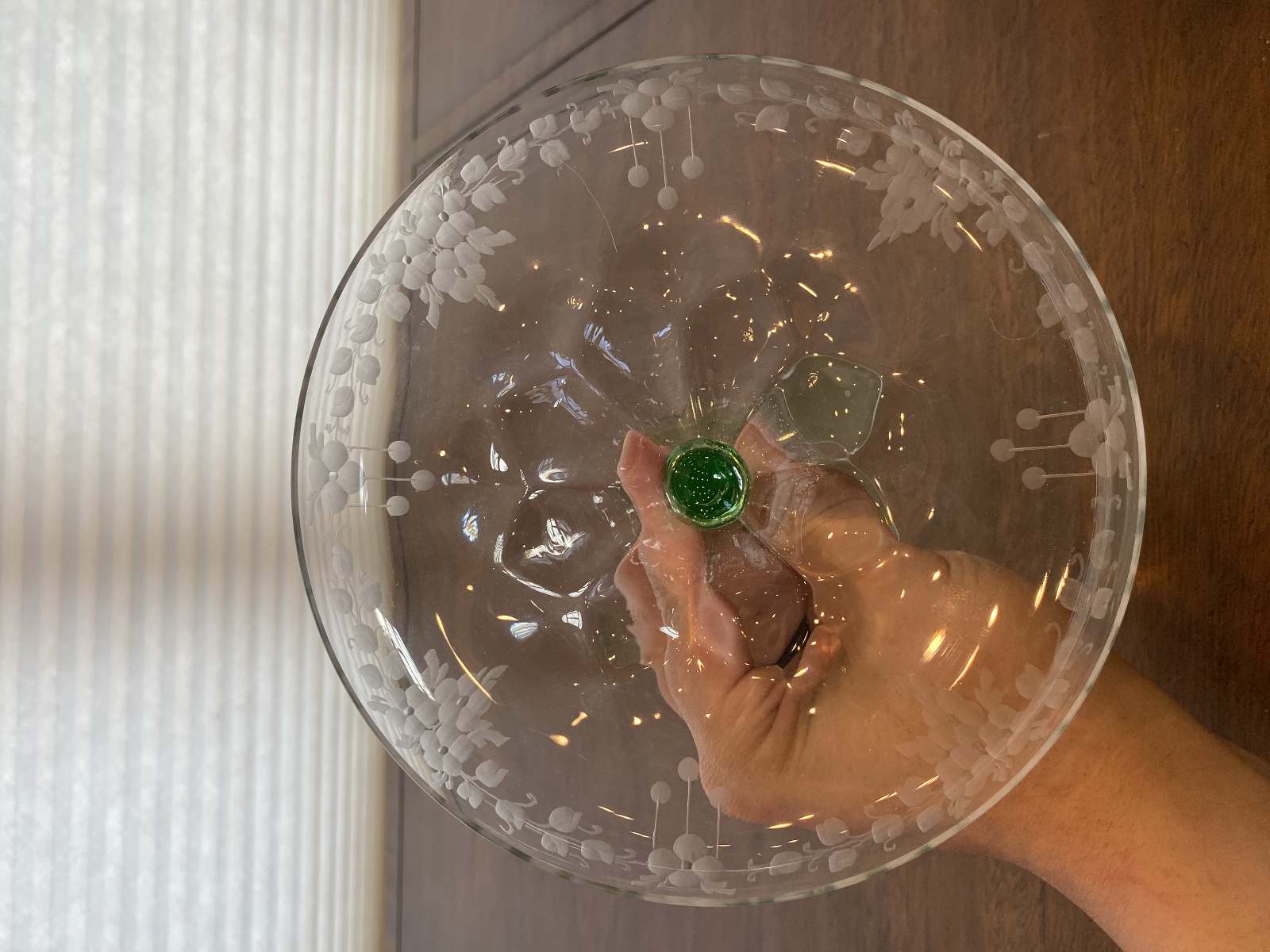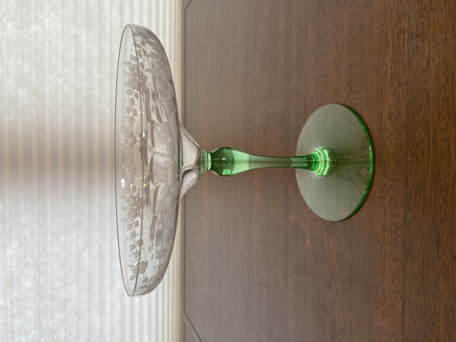 VTG UV REACTIVE Clear/Green Floral Etched Glass Compote 6.75"H