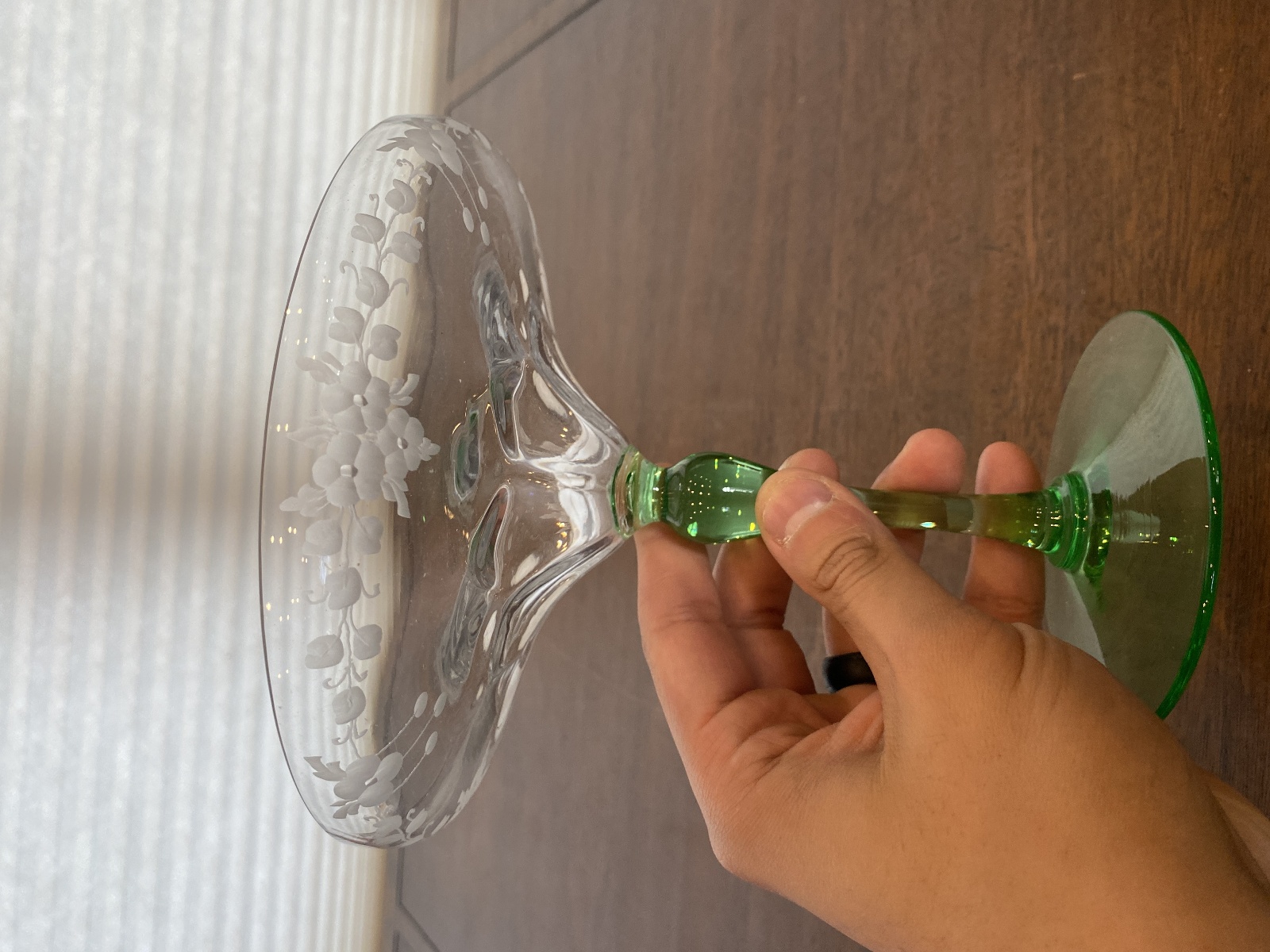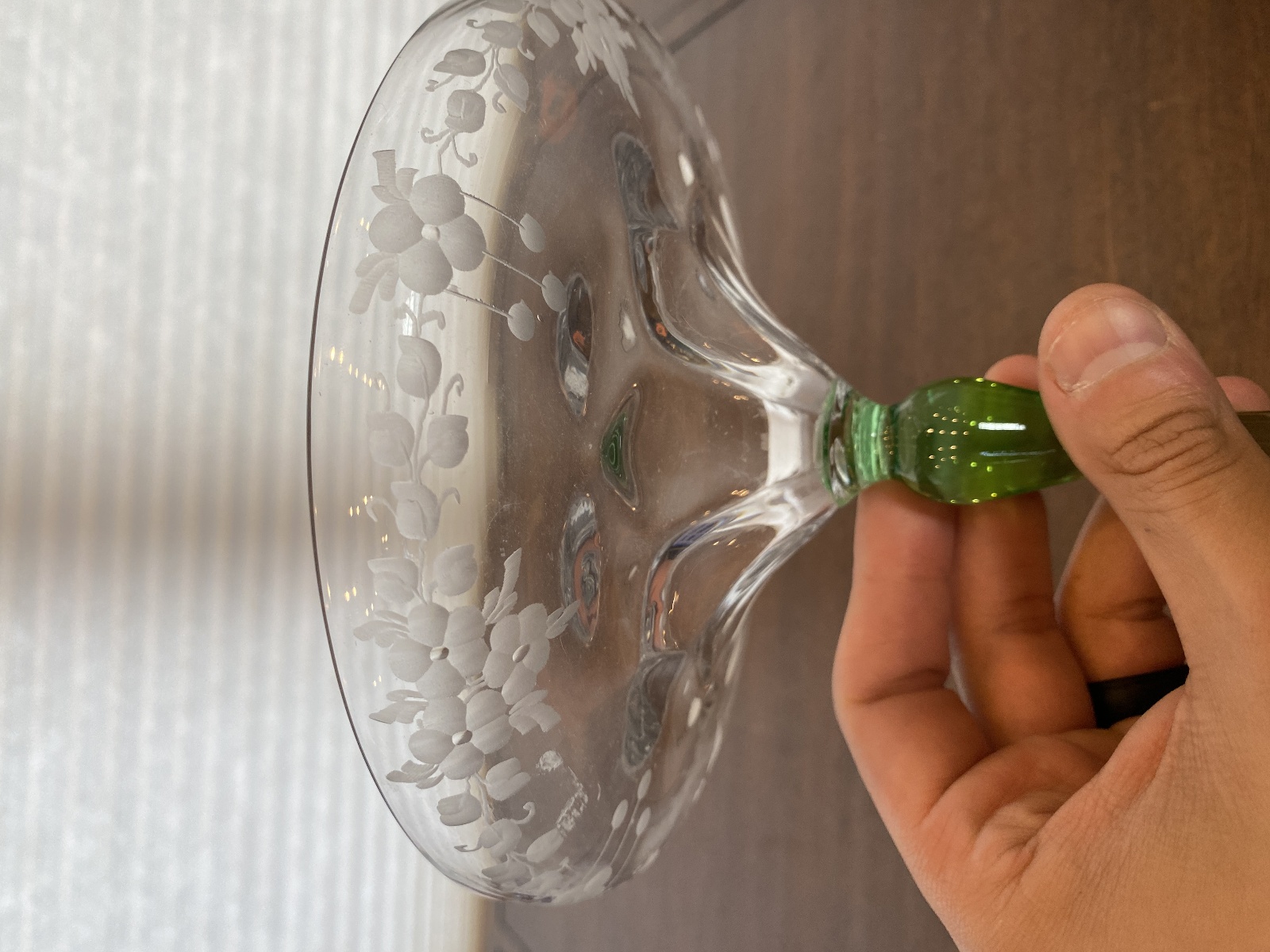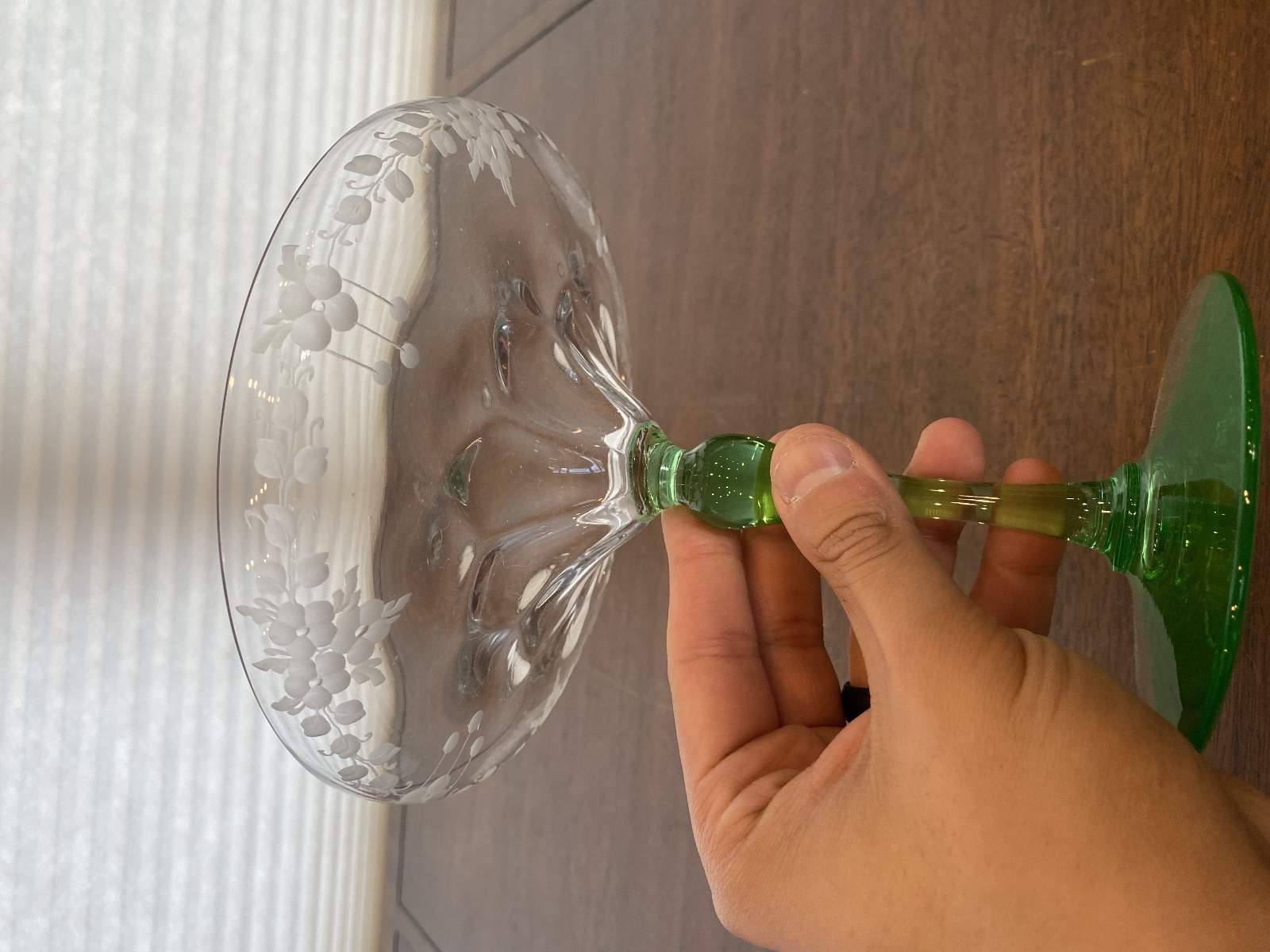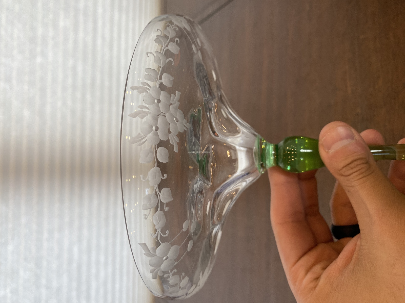 VTG UV REACTIVE Clear/Green Floral Etched Glass Compote 6.75"H