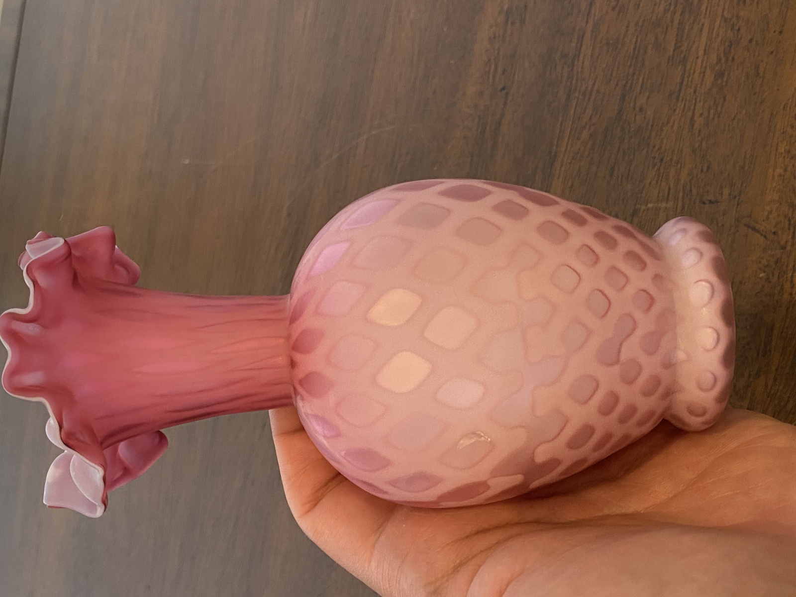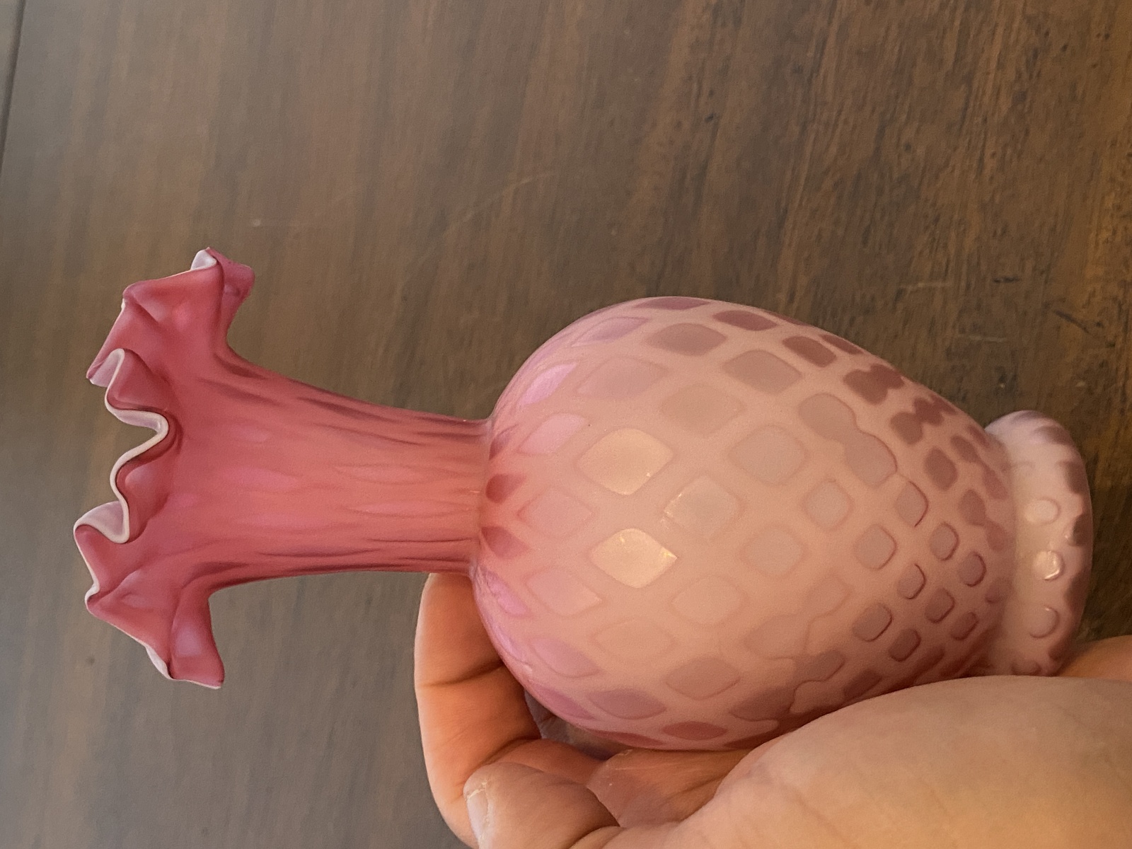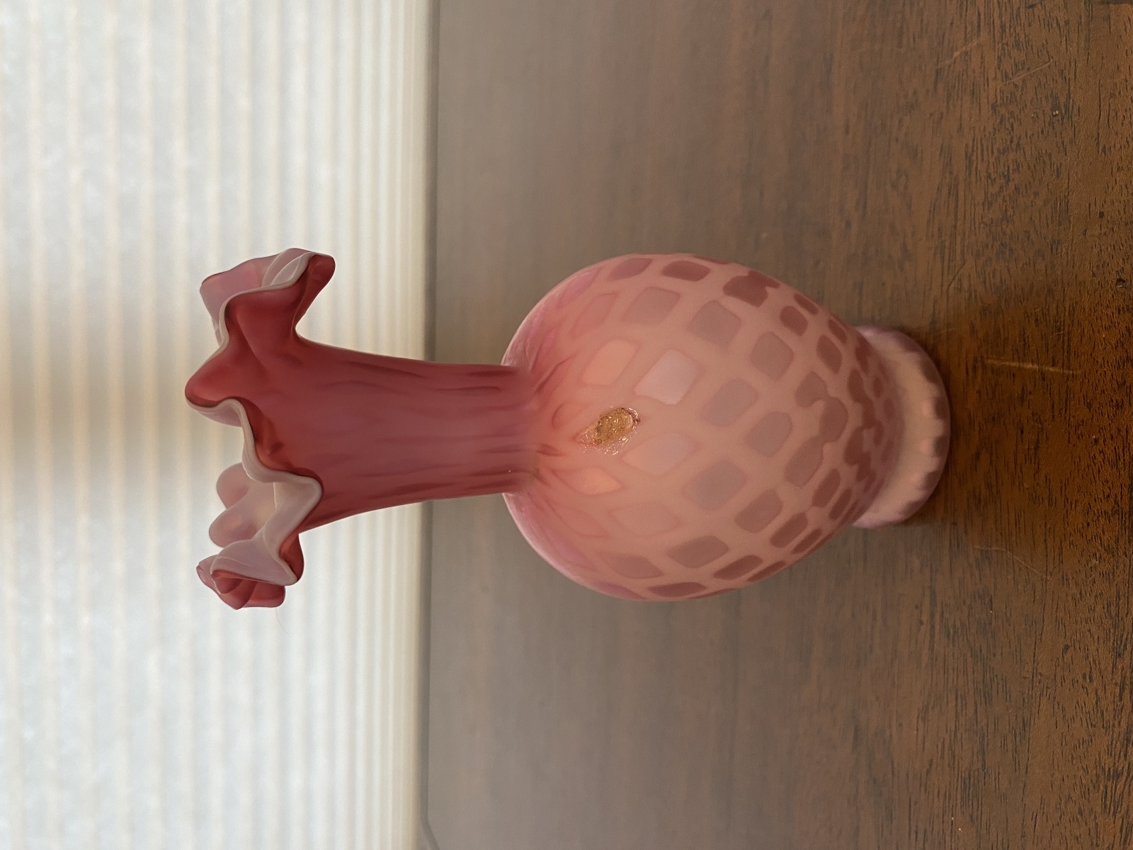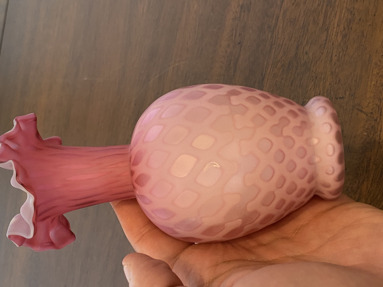 ANTIQUE Pink Satin MOTHER OF PEARL Quilted Ruffled Rim Art Glass Vase 6.25"H