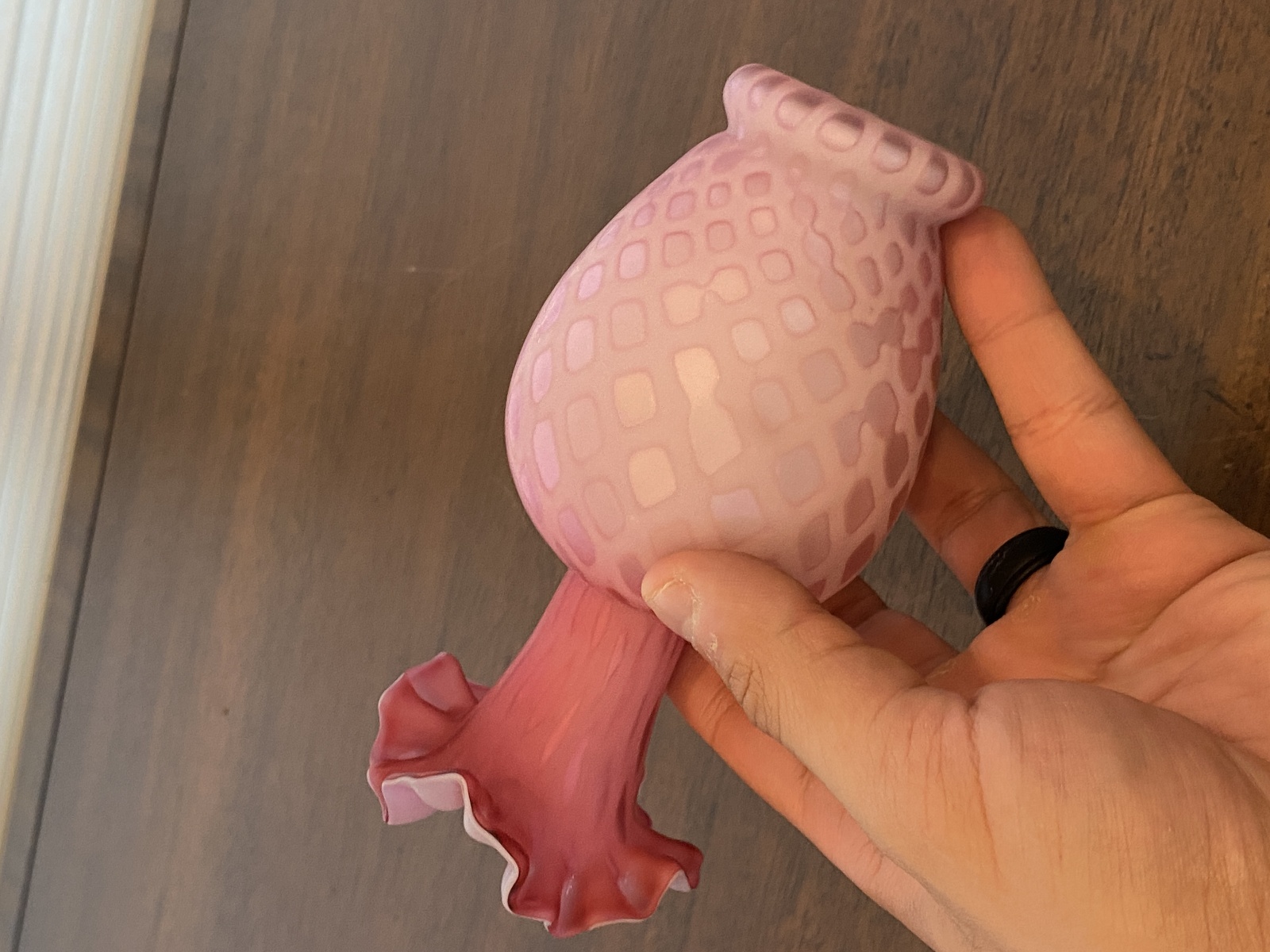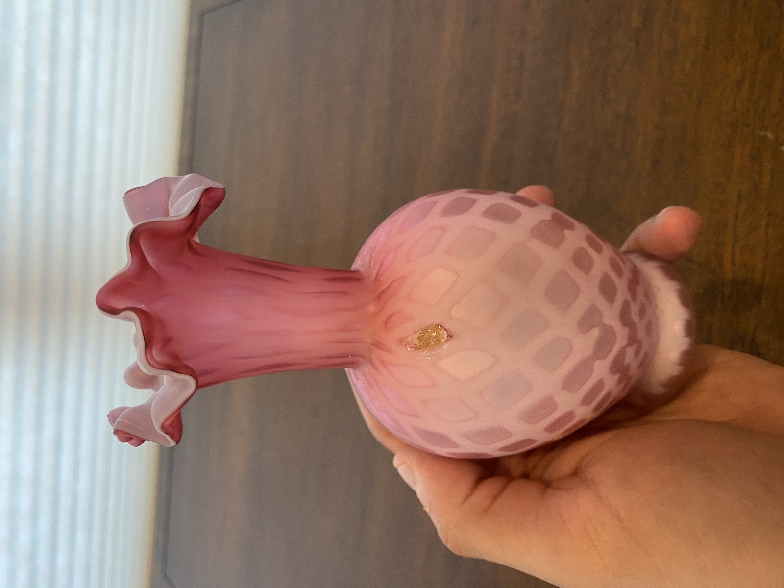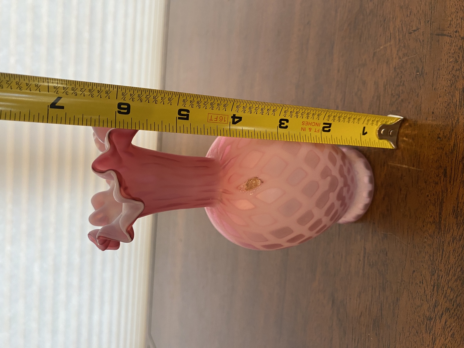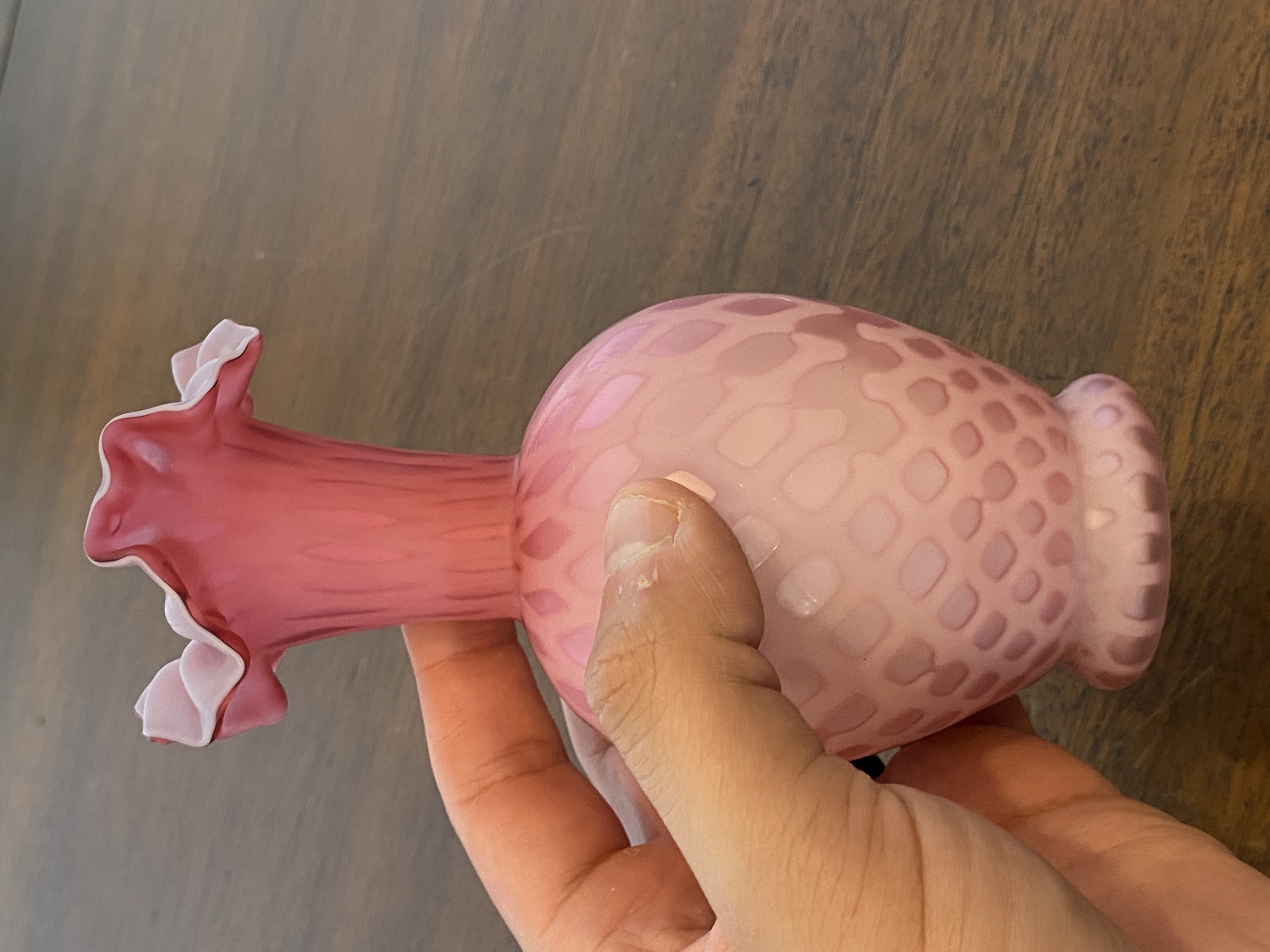ANTIQUE Pink Satin MOTHER OF PEARL Quilted Ruffled Rim Art Glass Vase 6.25"H