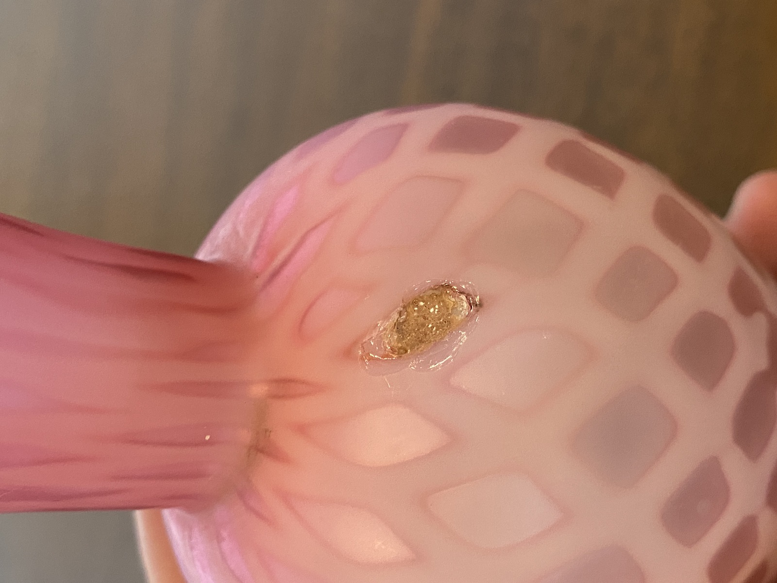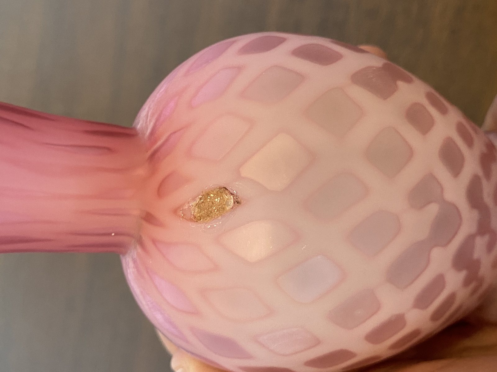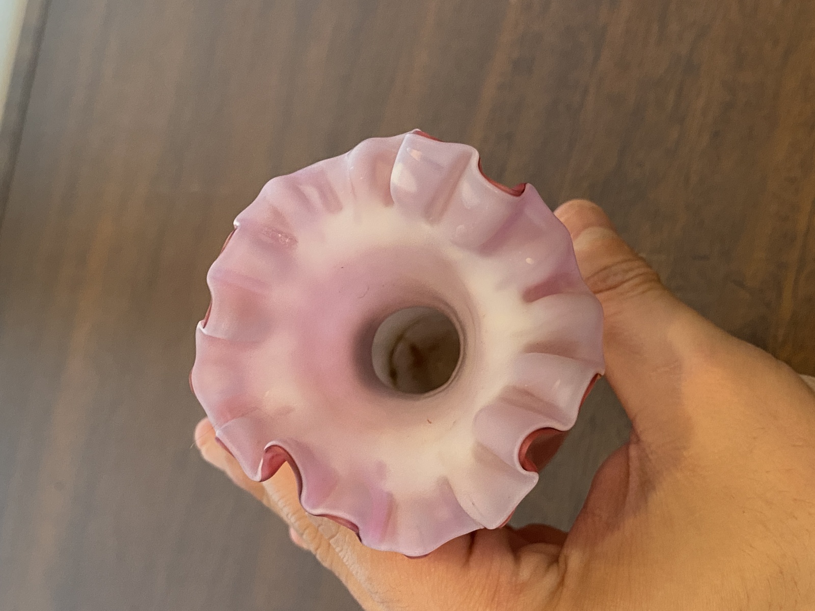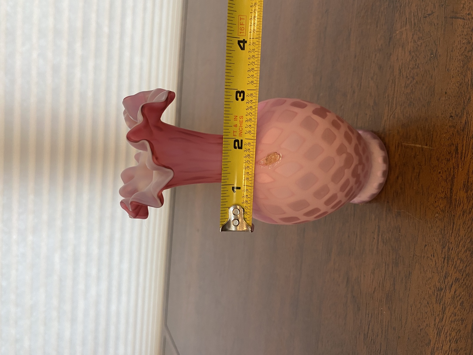 ANTIQUE Pink Satin MOTHER OF PEARL Quilted Ruffled Rim Art Glass Vase 6.25"H