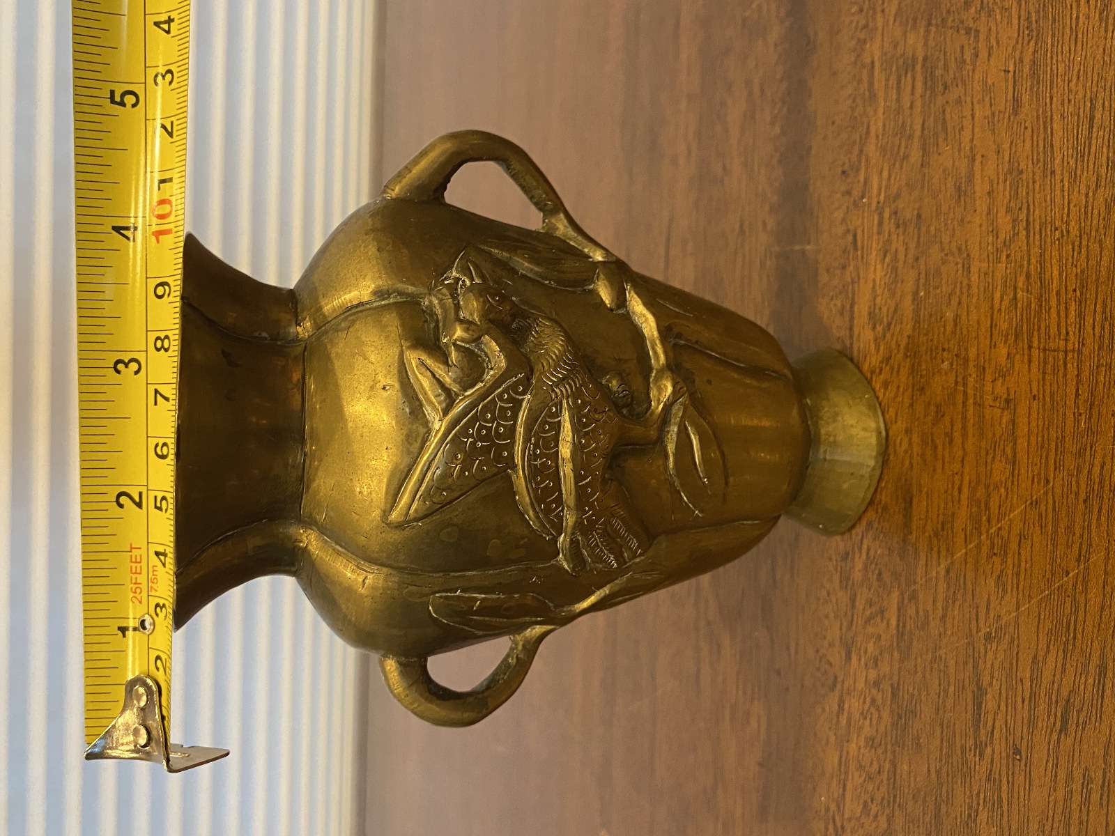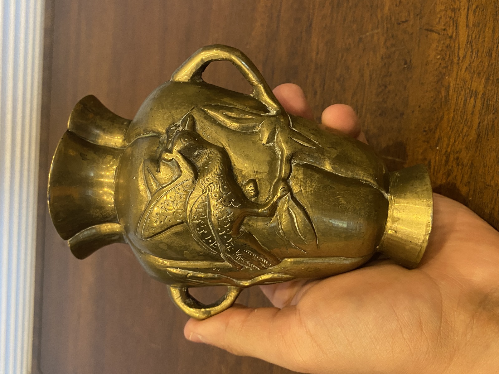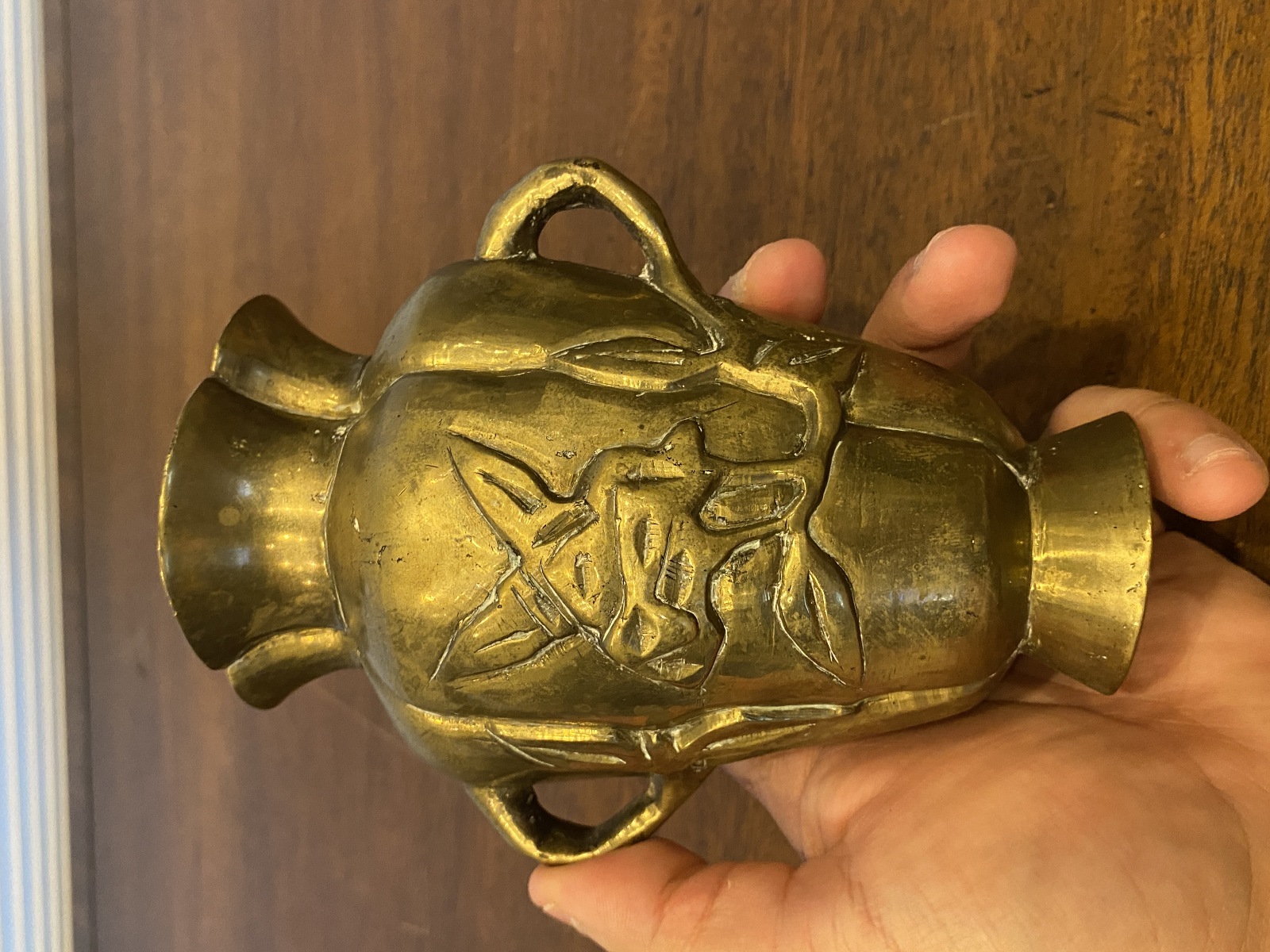 VTG CHINESE Raised Relief Bird On Branch Design Double Handled Brass Vase 6"H