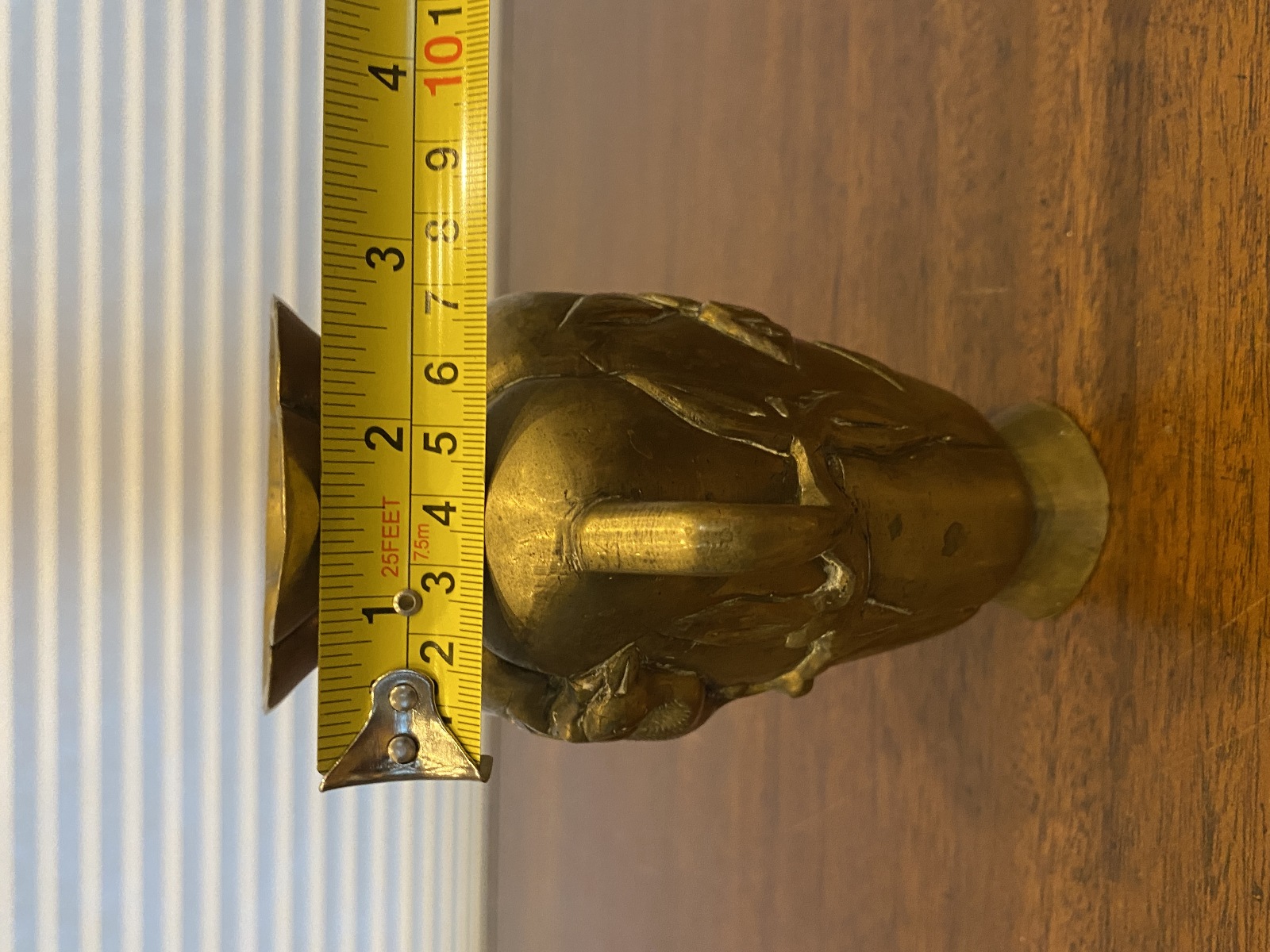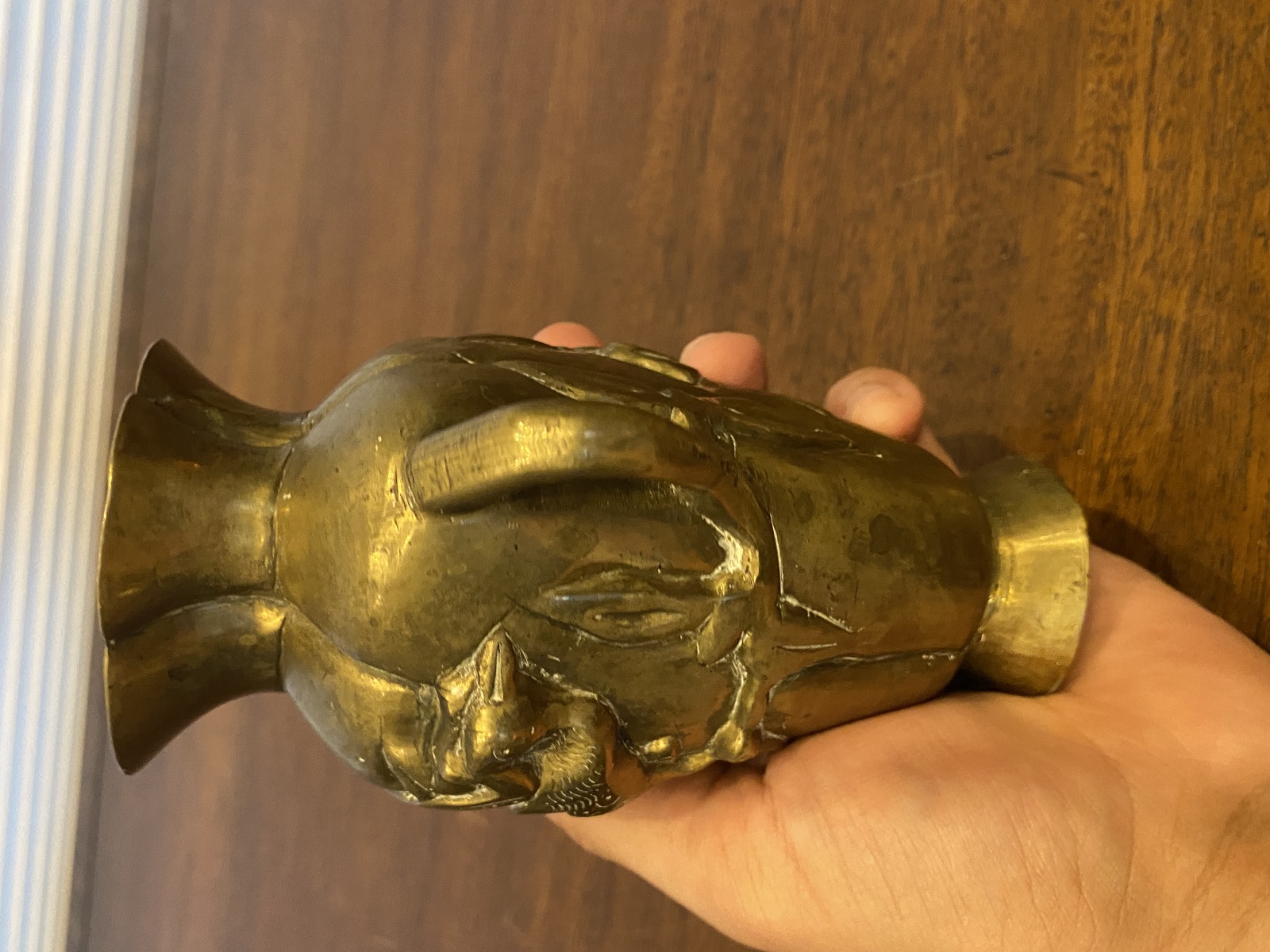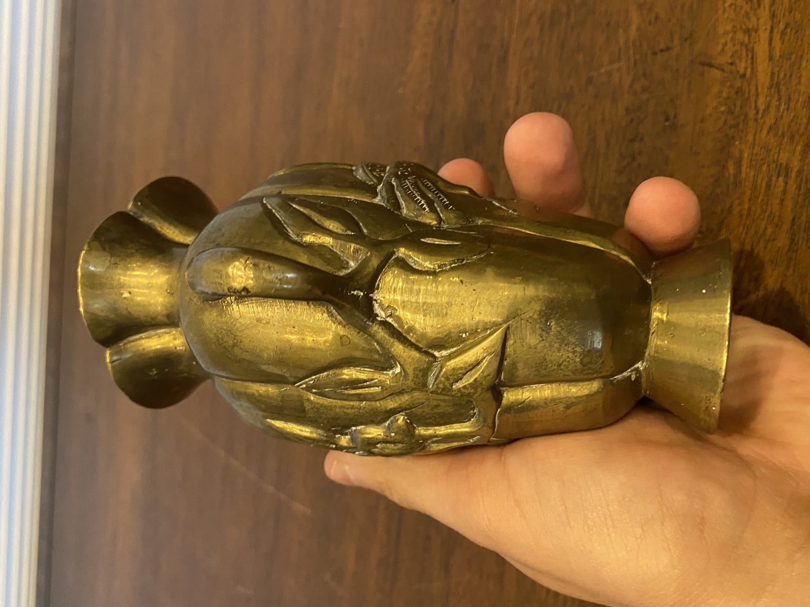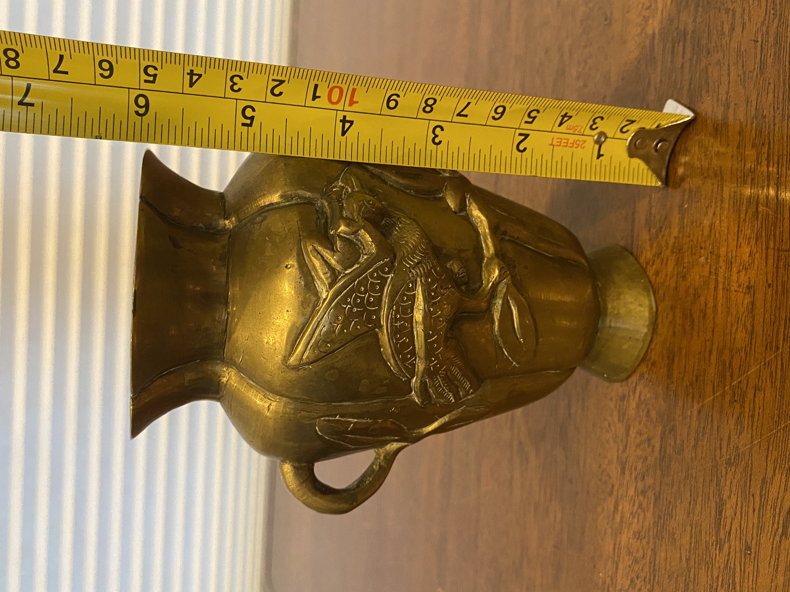 VTG CHINESE Raised Relief Bird On Branch Design Double Handled Brass Vase 6"H