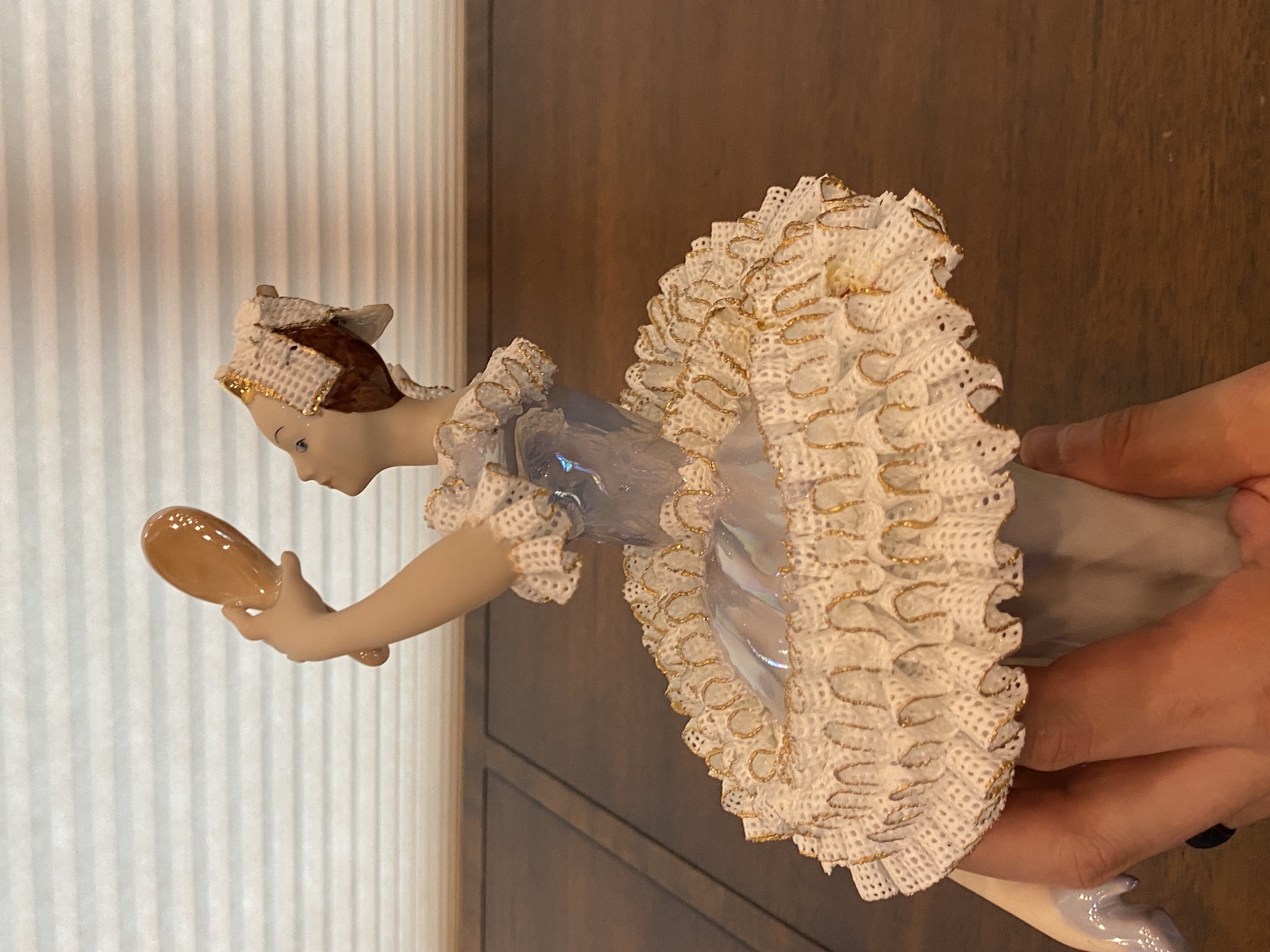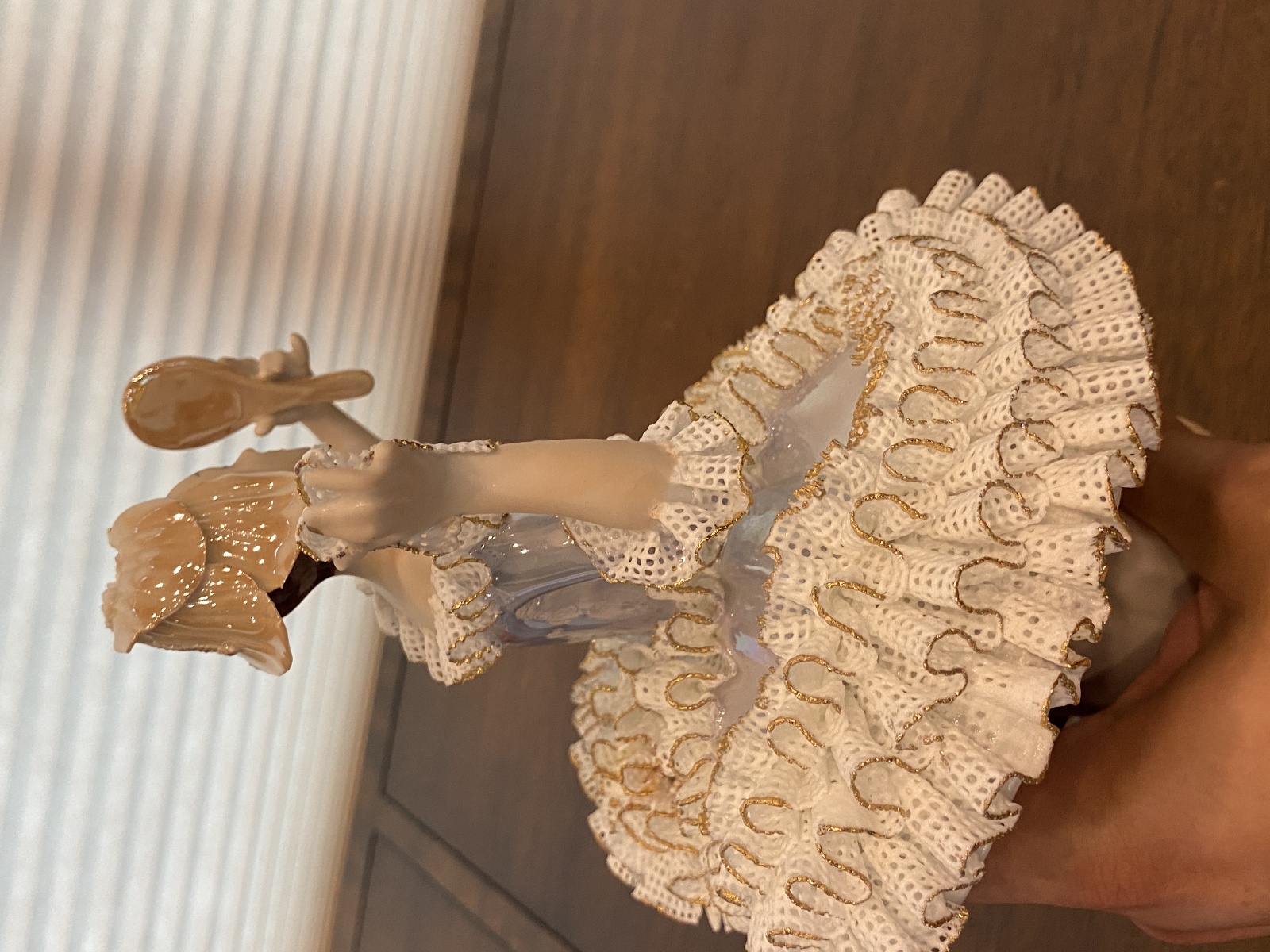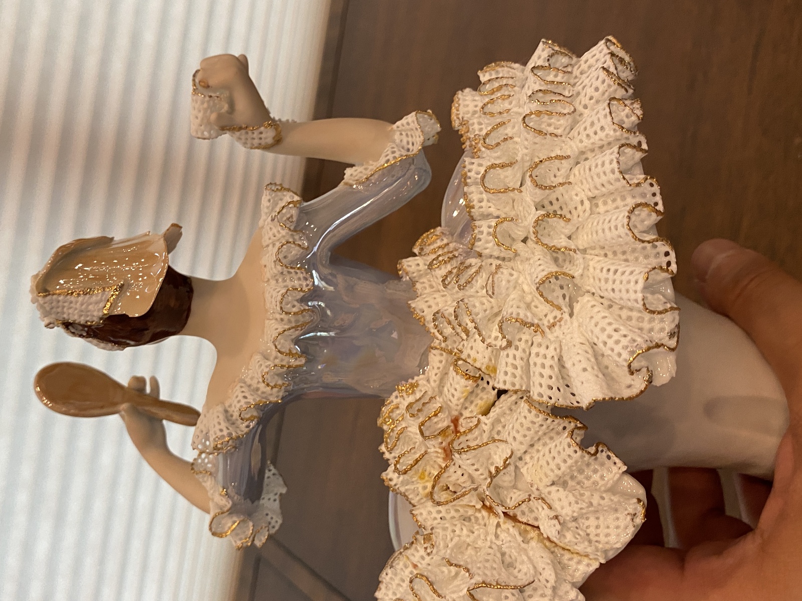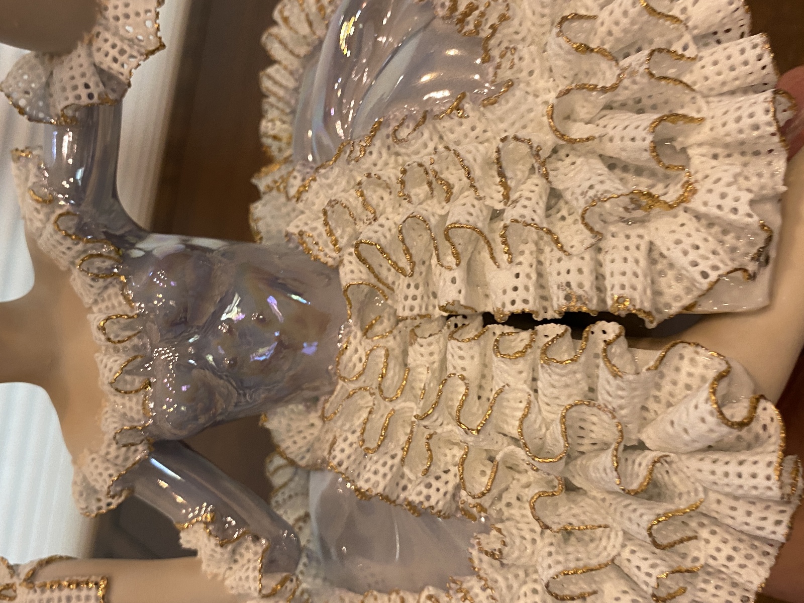 DAMAGED/REPAIRED CONDITION PLEASE NOTE THAT THE DRESS HAS BEEN DAMAGED AND PARTS HAVE BEEN GLUED BACK TOGETHER NOTED IN THE PHOTOS (THERE ARE ALSO SOME WEAR MARKS FROM AGE, WOULD STILL MAKE FOR A NICE DISPLAY PIECE). Please refer back to the photos for condition and feel free to message me if you have any questions. Thank you)!