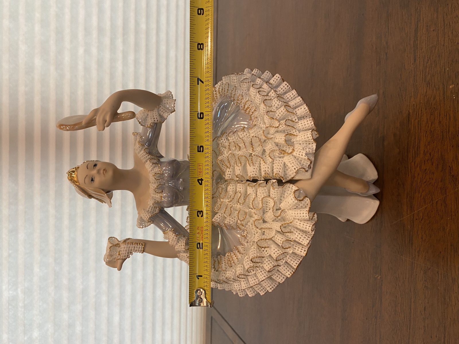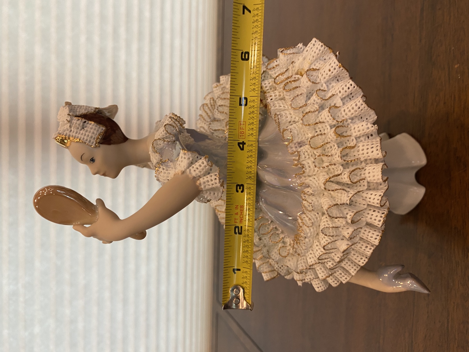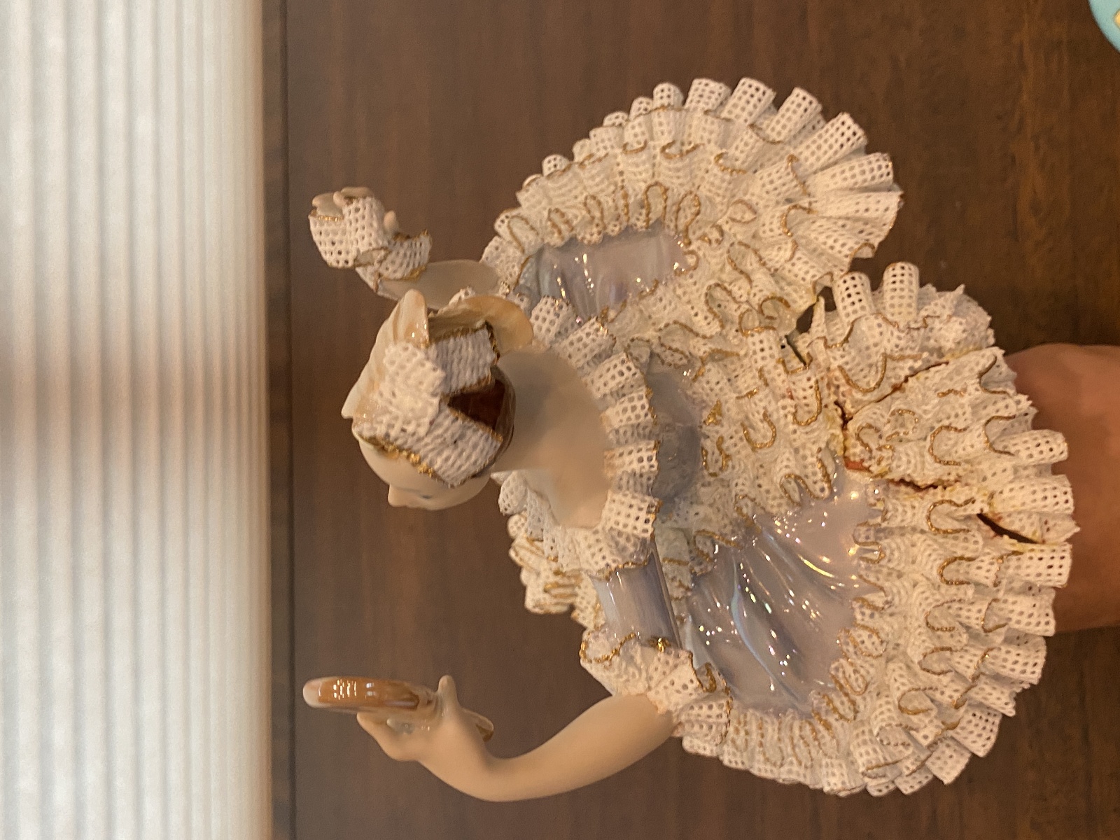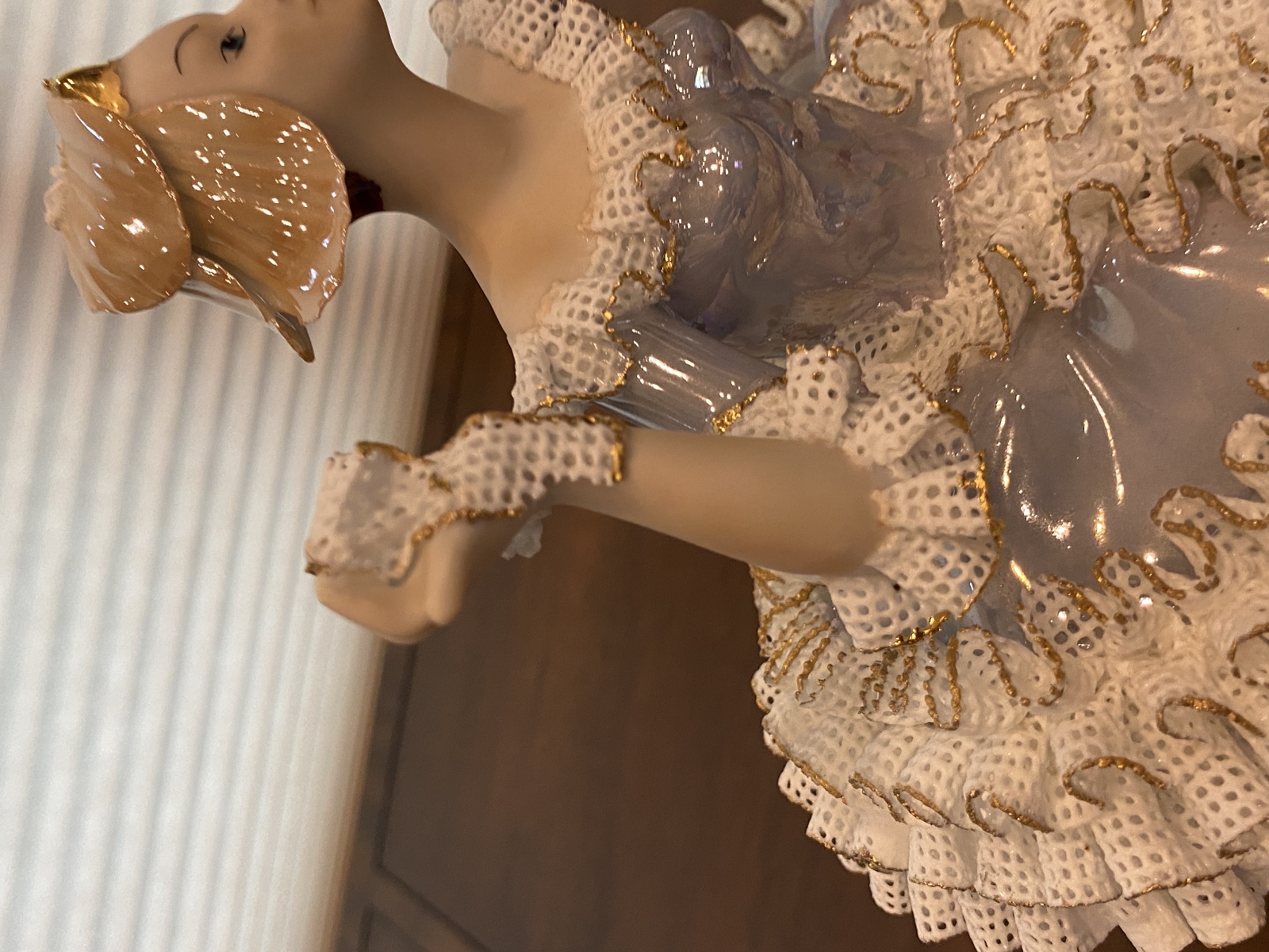 DAMAGED/REPAIRED CONDITION PLEASE NOTE THAT THE DRESS HAS BEEN DAMAGED AND PARTS HAVE BEEN GLUED BACK TOGETHER NOTED IN THE PHOTOS (THERE ARE ALSO SOME WEAR MARKS FROM AGE, WOULD STILL MAKE FOR A NICE DISPLAY PIECE). Please refer back to the photos for condition and feel free to message me if you have any questions. Thank you)!