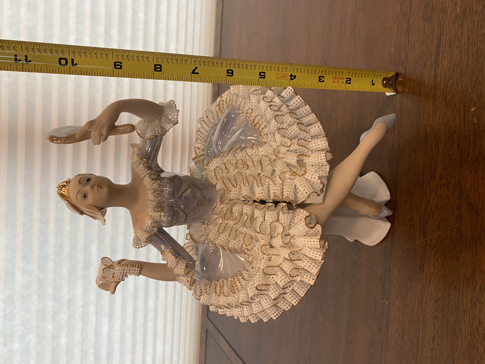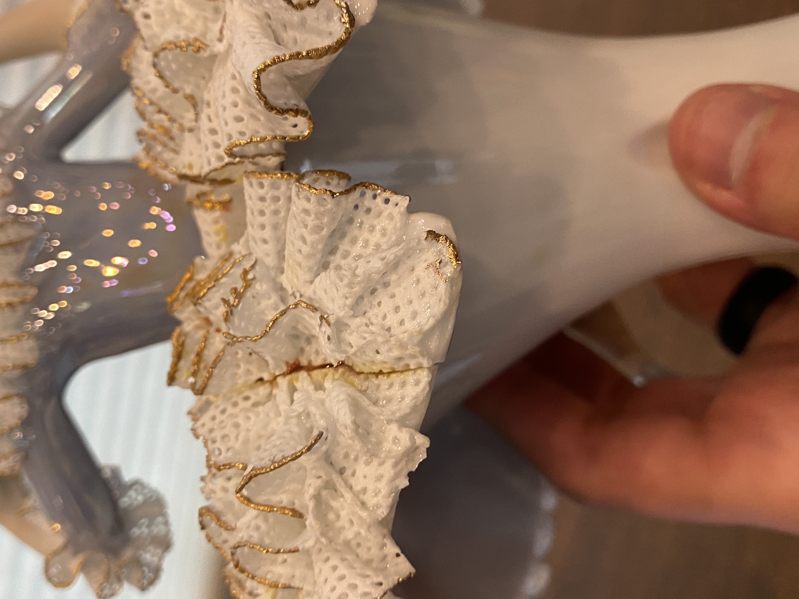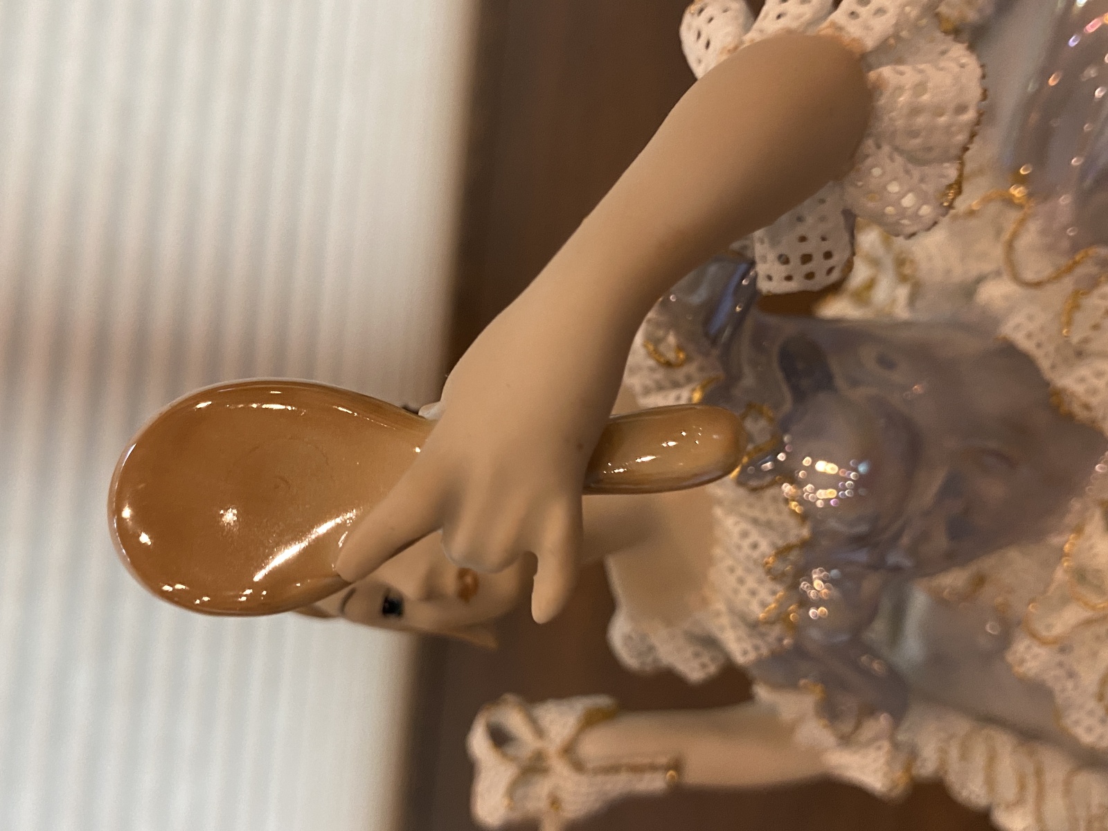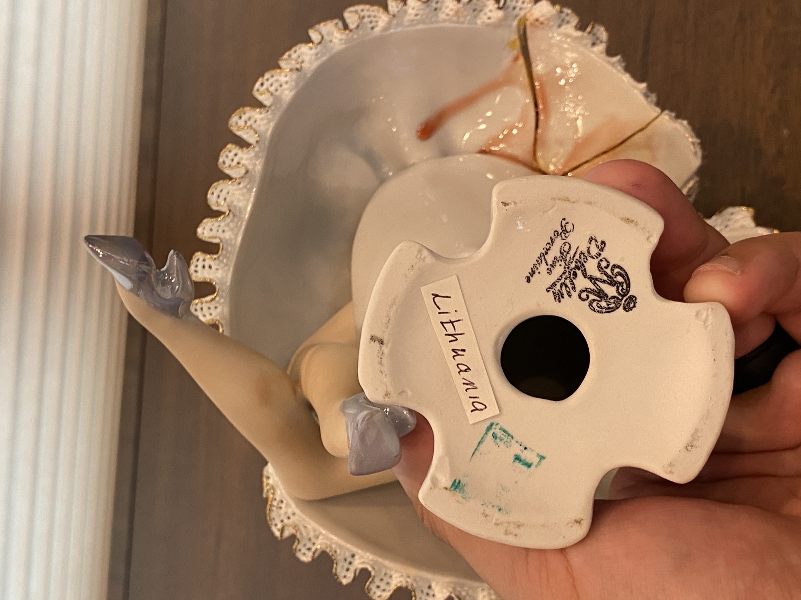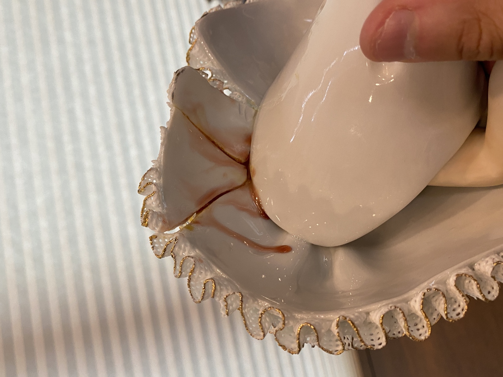 DAMAGED/REPAIRED CONDITION PLEASE NOTE THAT THE DRESS HAS BEEN DAMAGED AND PARTS HAVE BEEN GLUED BACK TOGETHER NOTED IN THE PHOTOS (THERE ARE ALSO SOME WEAR MARKS FROM AGE, WOULD STILL MAKE FOR A NICE DISPLAY PIECE). Please refer back to the photos for condition and feel free to message me if you have any questions. Thank you)!
