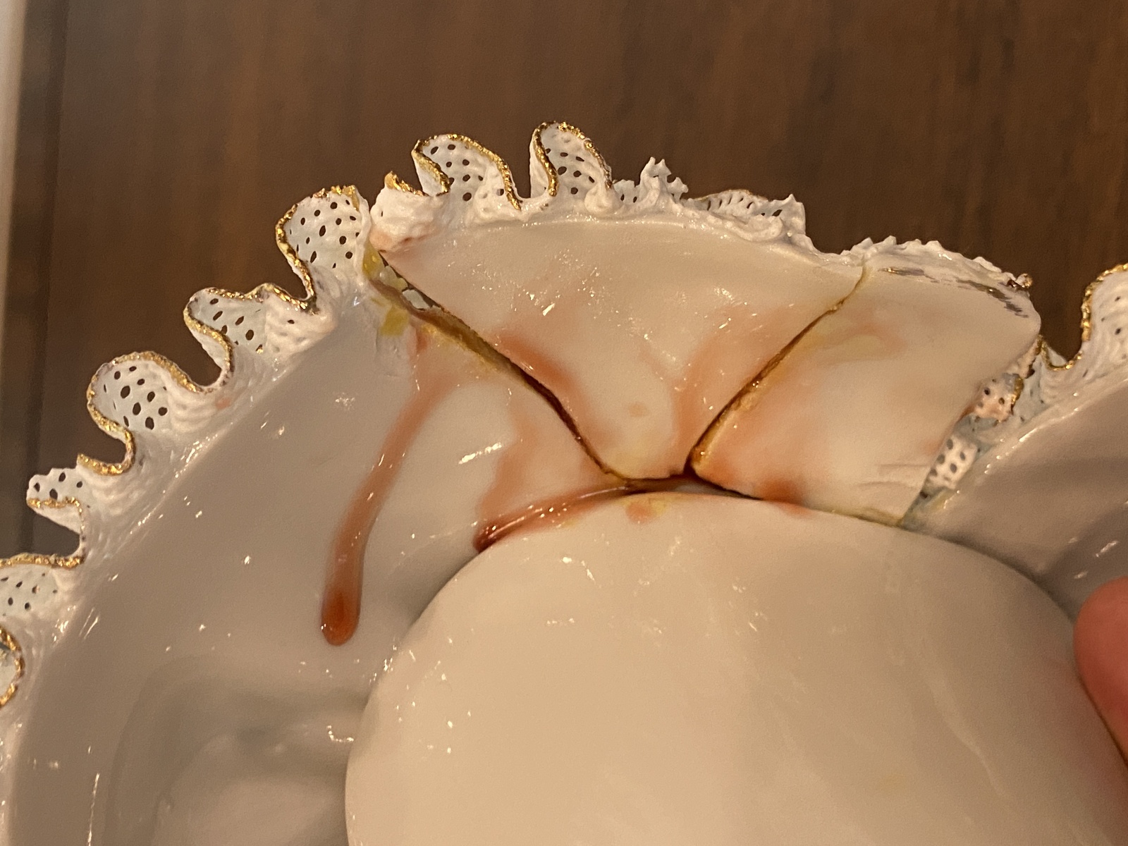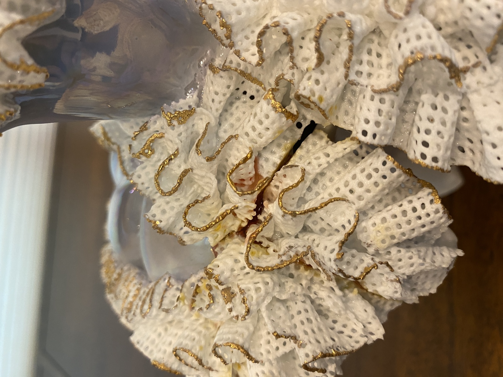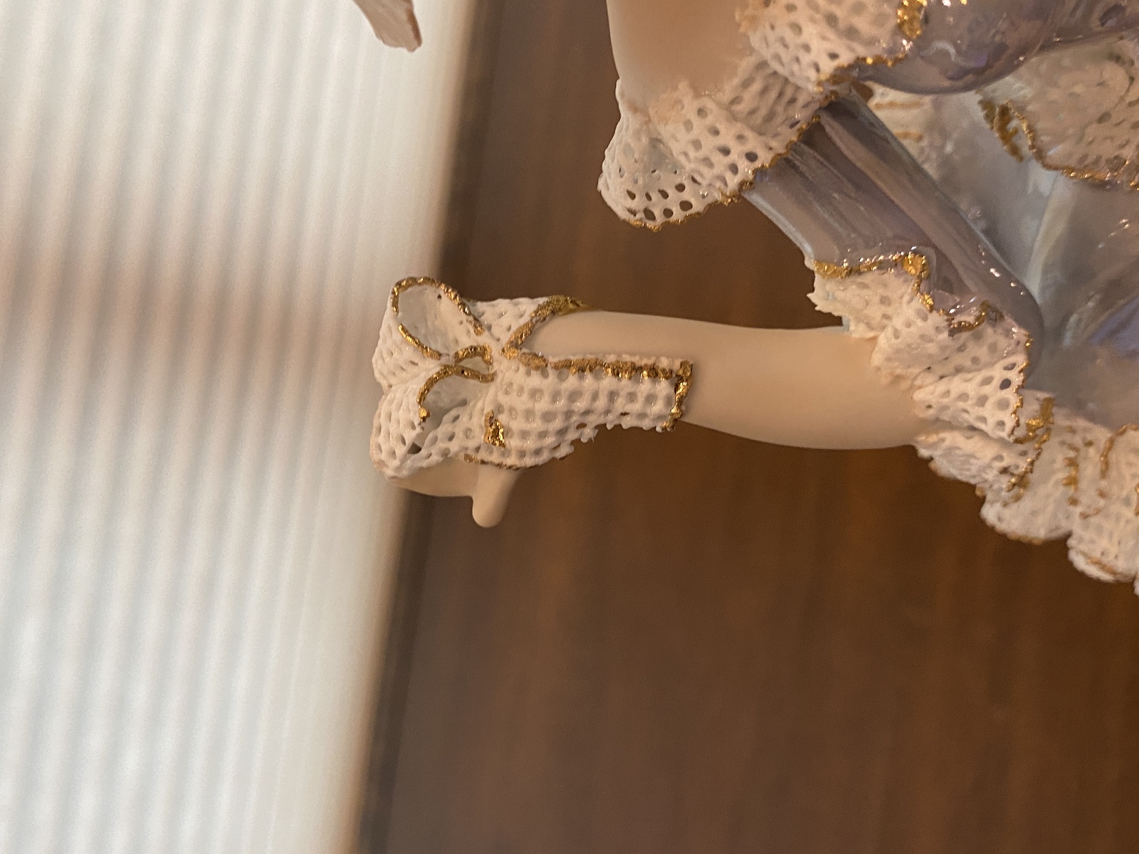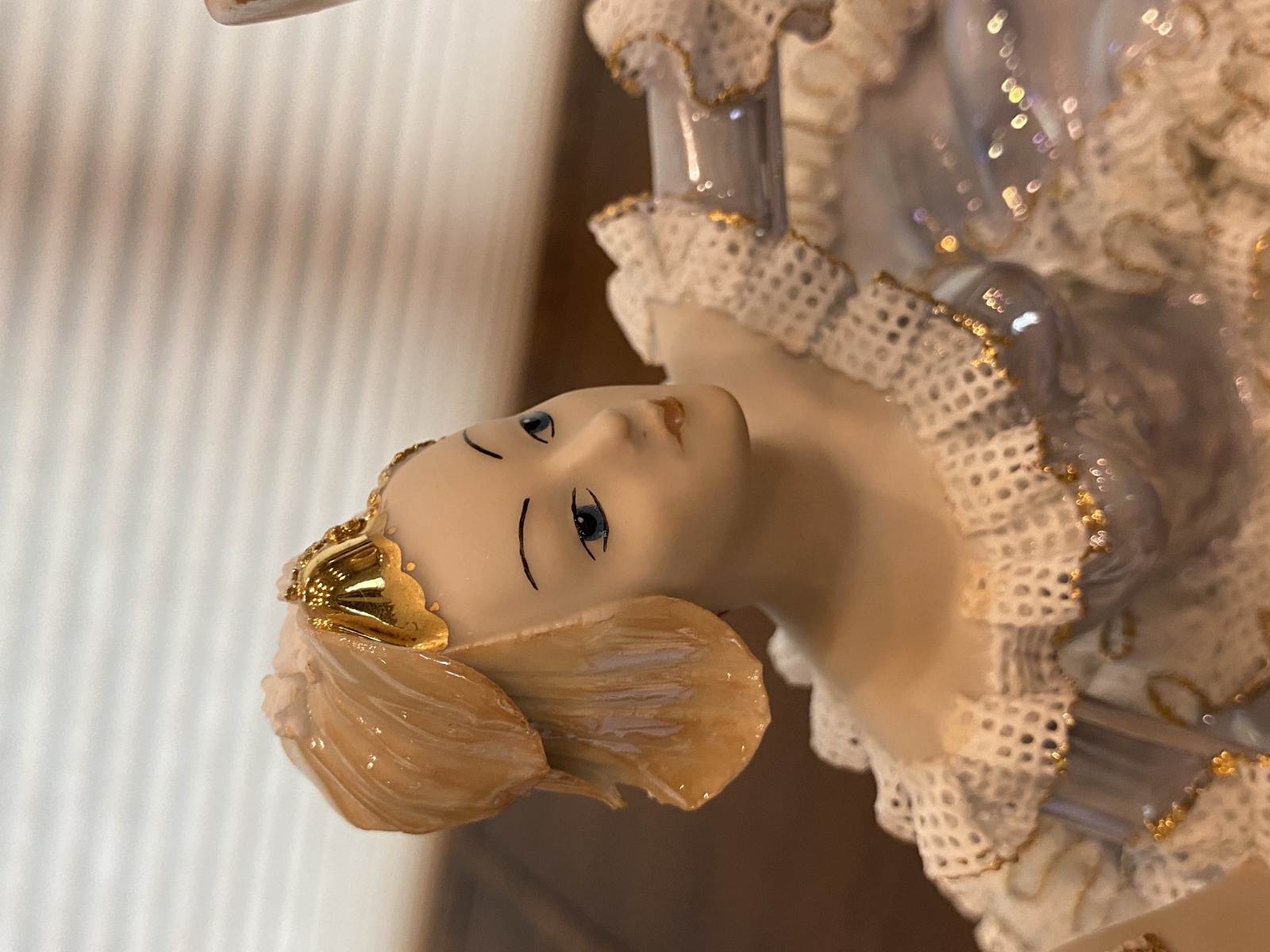 DAMAGED/REPAIRED CONDITION PLEASE NOTE THAT THE DRESS HAS BEEN DAMAGED AND PARTS HAVE BEEN GLUED BACK TOGETHER NOTED IN THE PHOTOS (THERE ARE ALSO SOME WEAR MARKS FROM AGE, WOULD STILL MAKE FOR A NICE DISPLAY PIECE). Please refer back to the photos for condition and feel free to message me if you have any questions. Thank you)!
