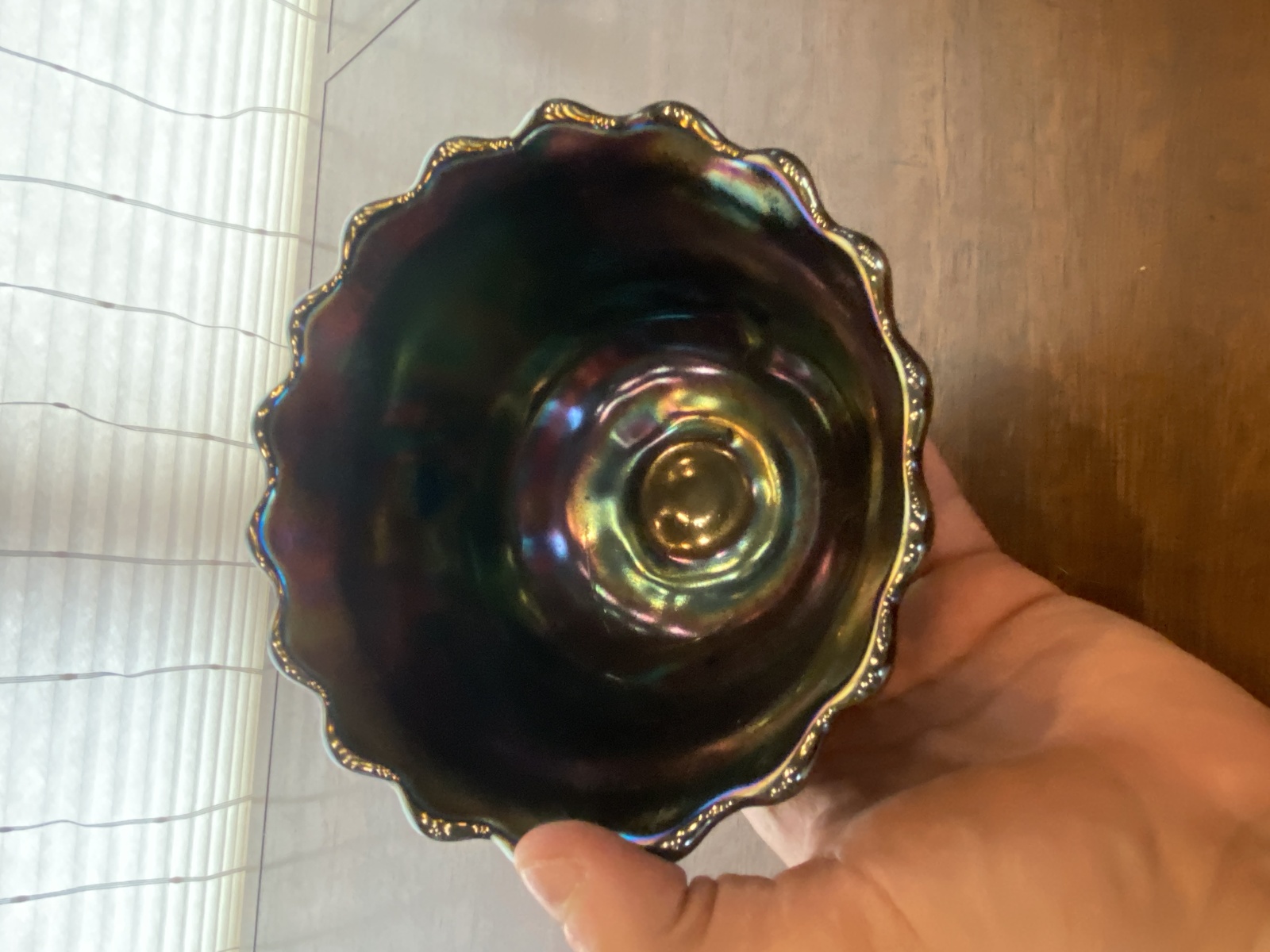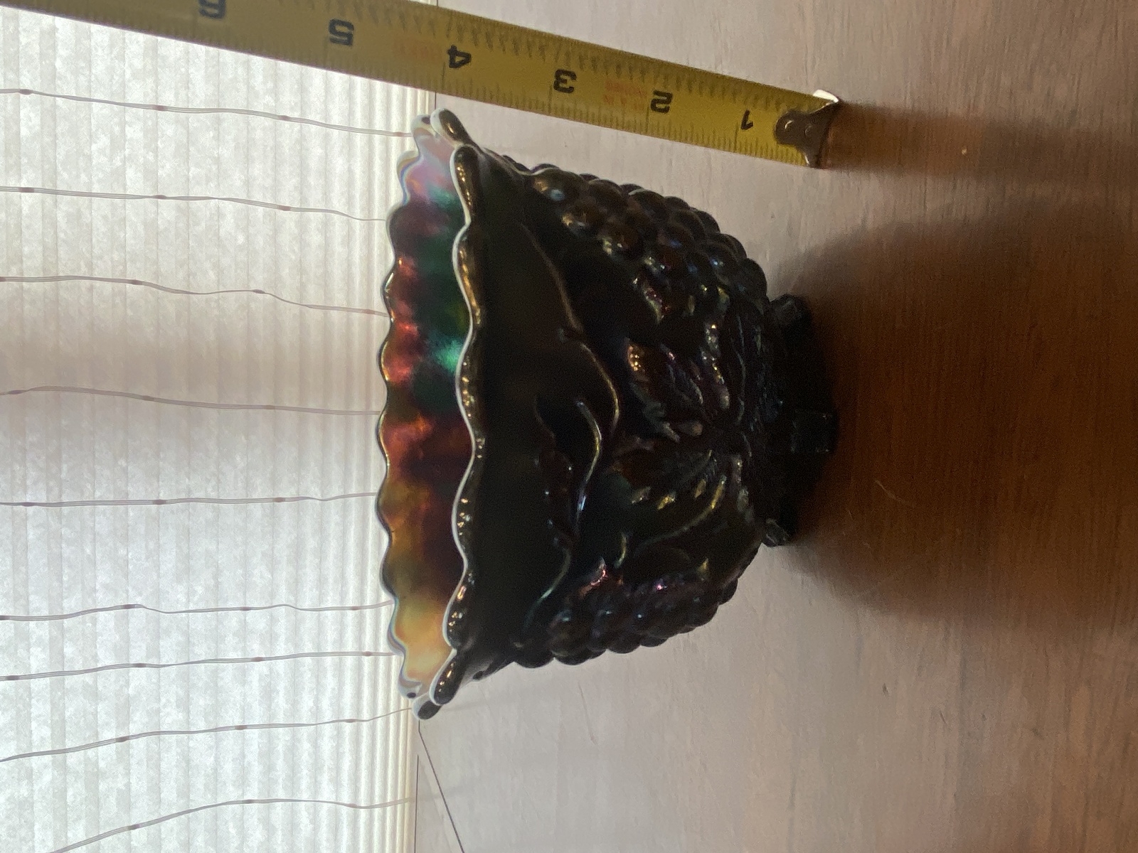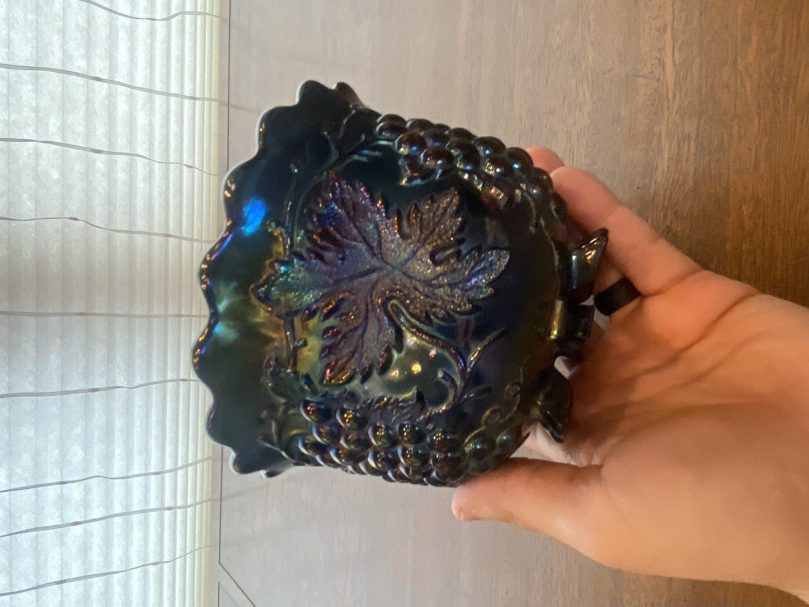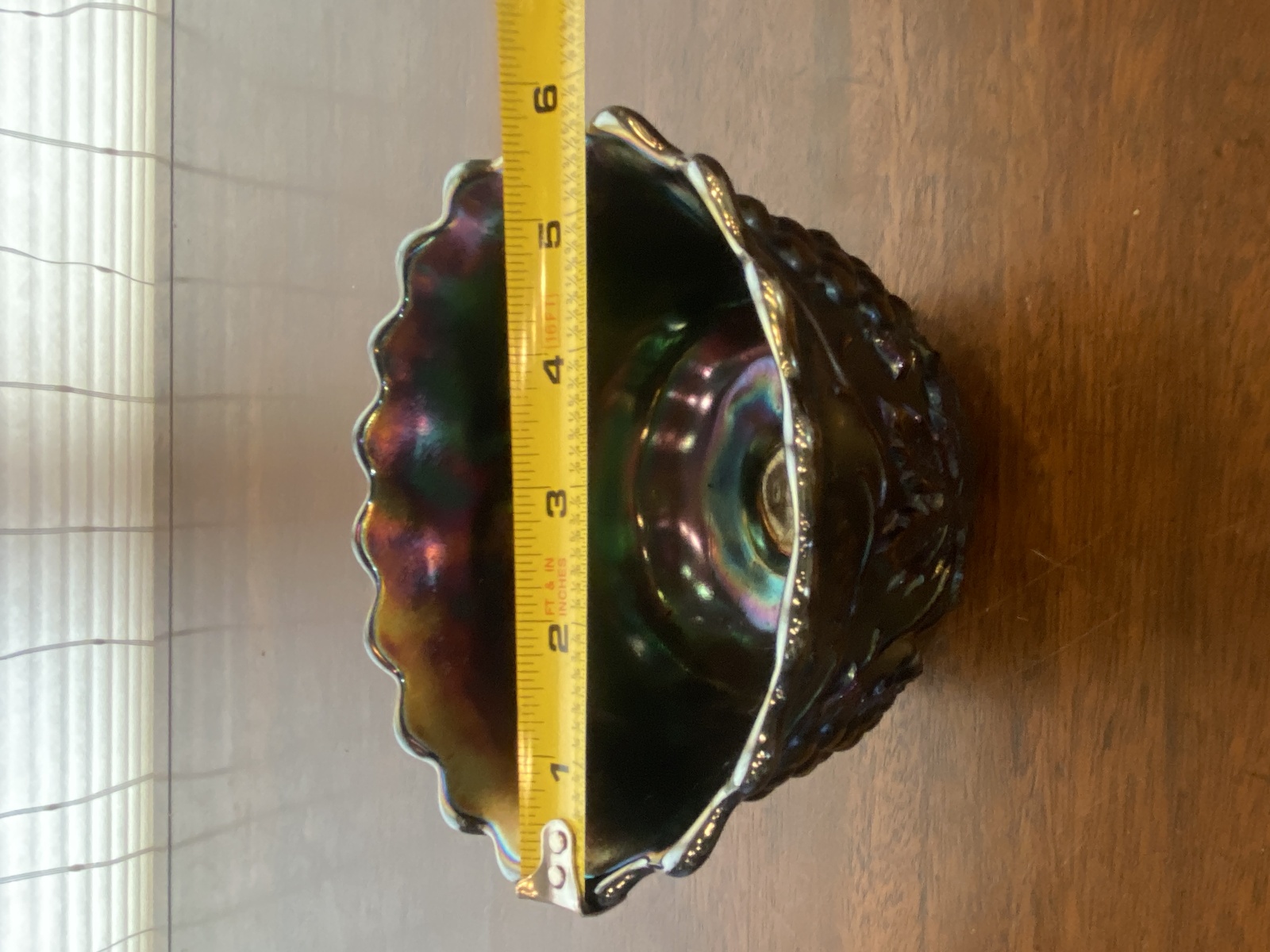 VTG Dugan Blue/Purple Iridescent GRAPE DELIGHT Footed Carnival Nut Bowl 6"W