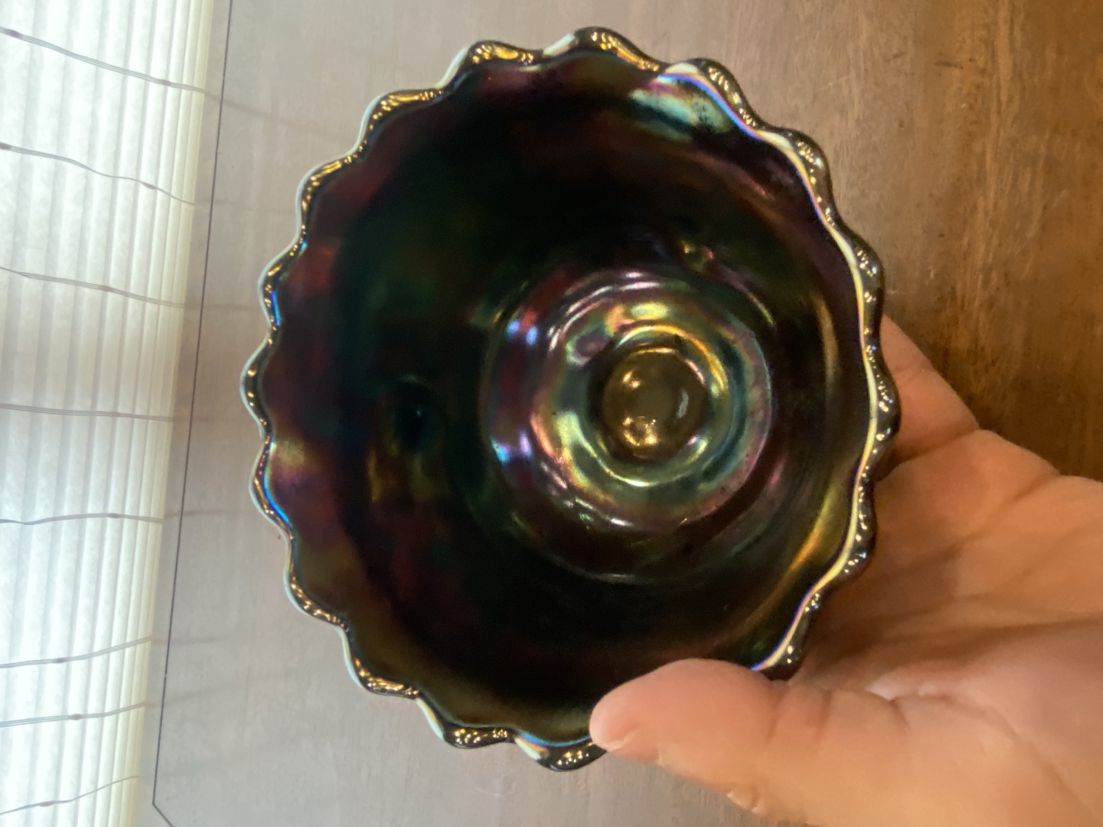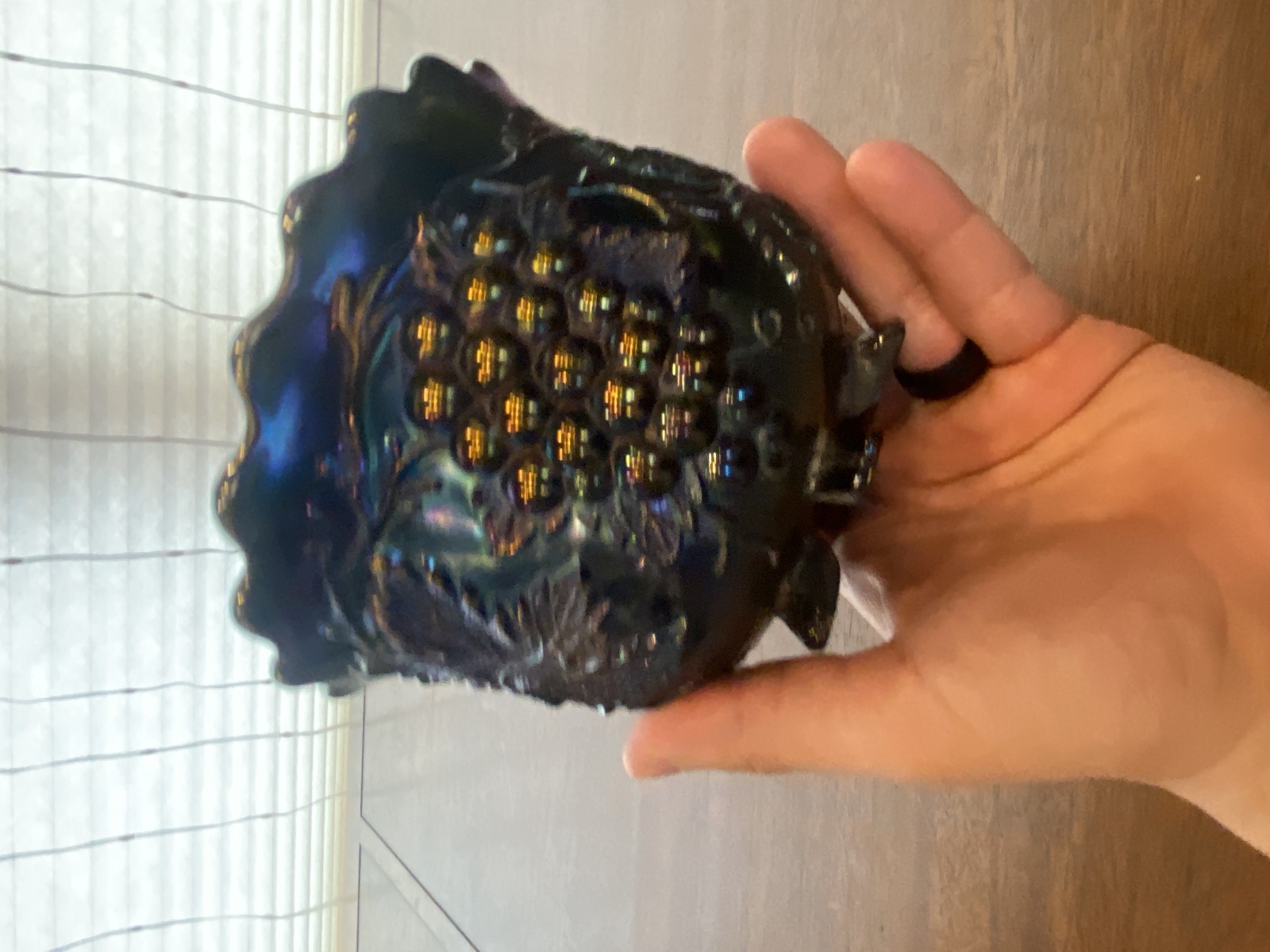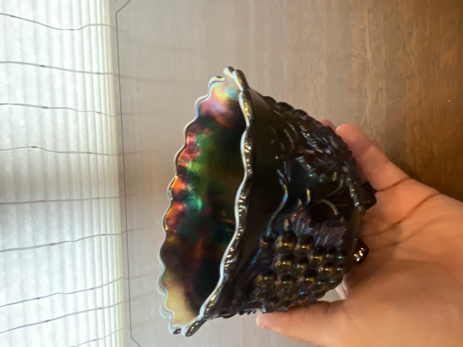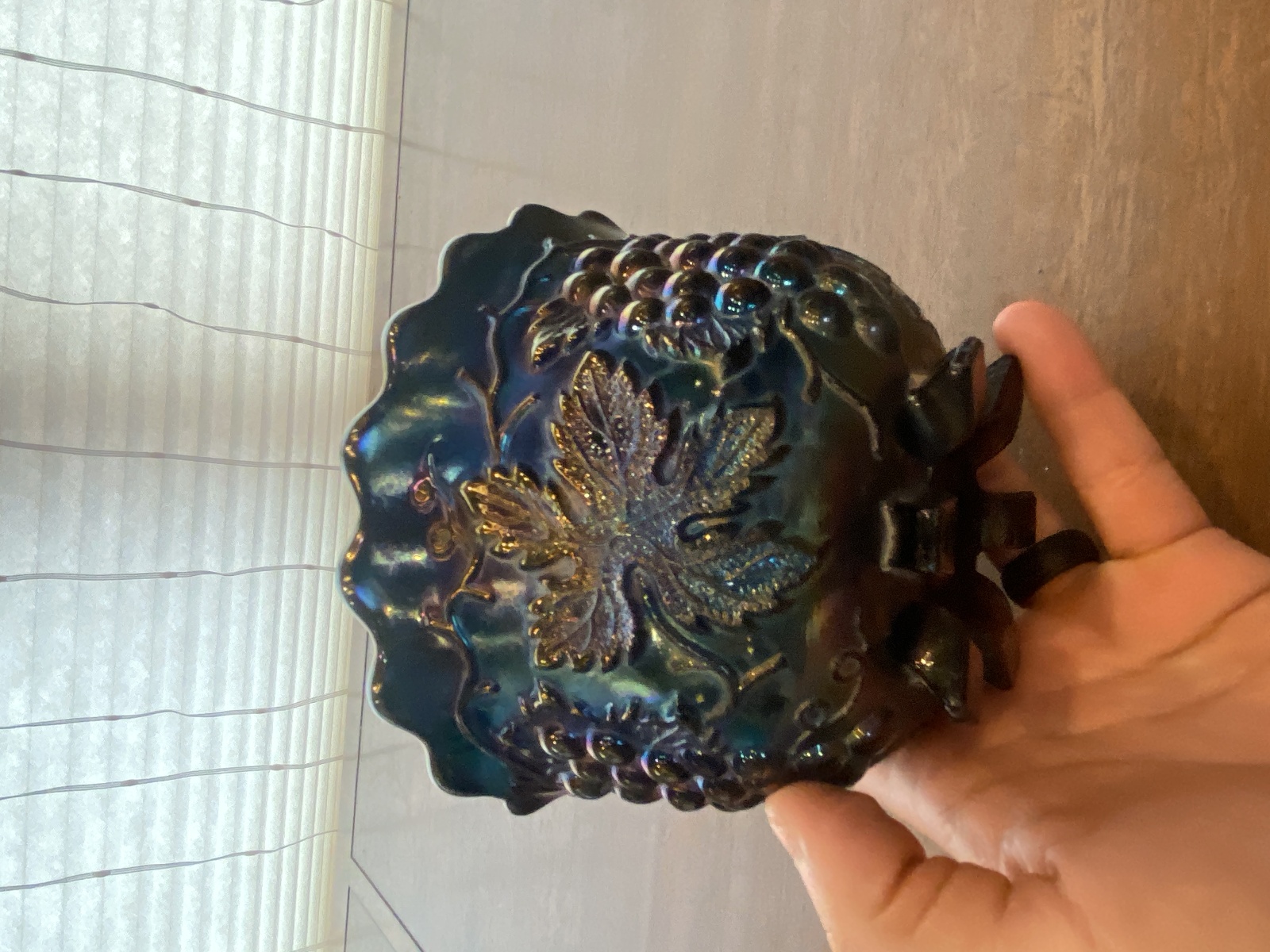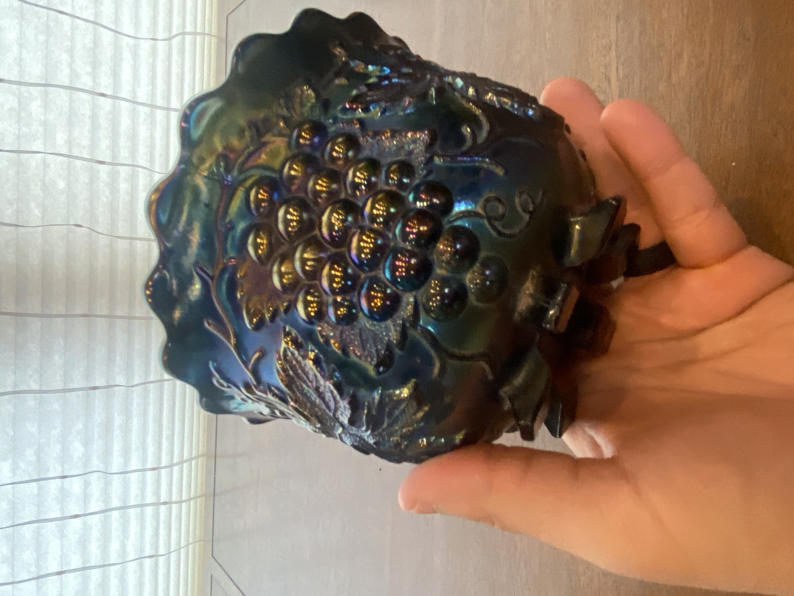 VTG Dugan Blue/Purple Iridescent GRAPE DELIGHT Footed Carnival Nut Bowl 6"W