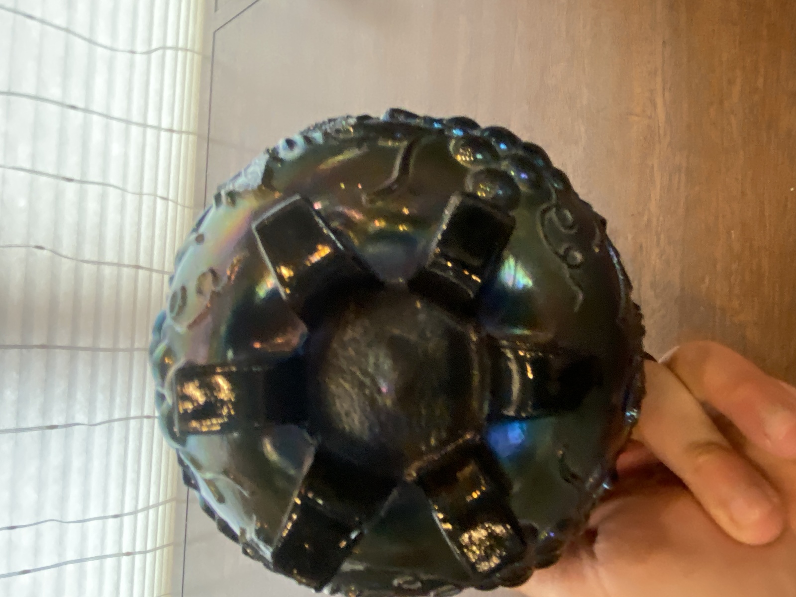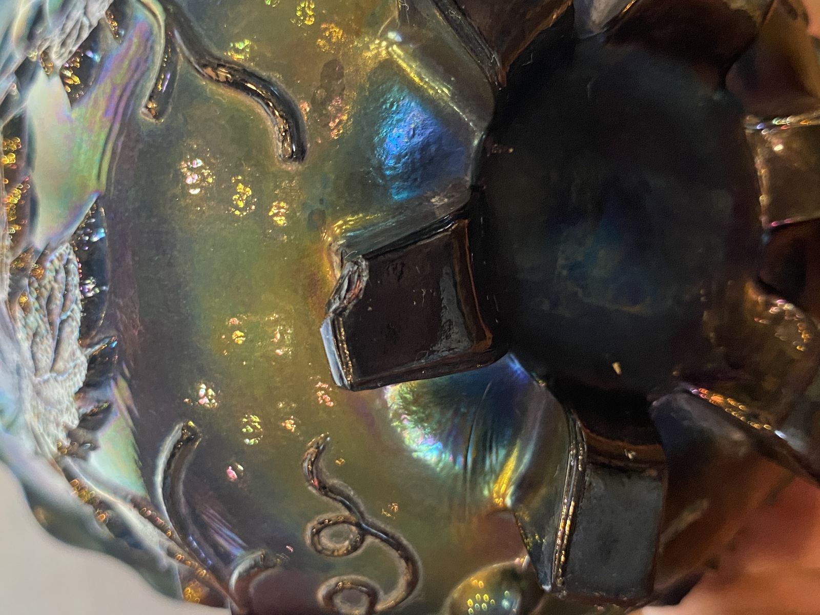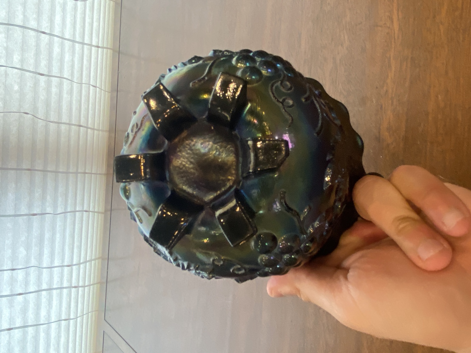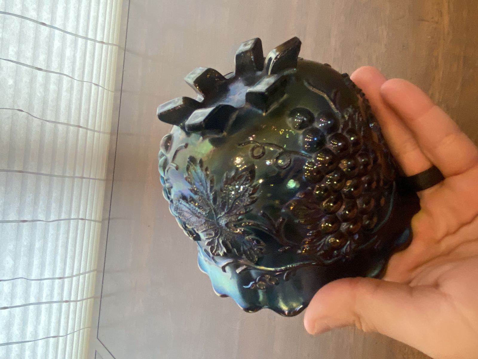VTG Dugan Blue/Purple Iridescent GRAPE DELIGHT Footed Carnival Nut Bowl 6"W
