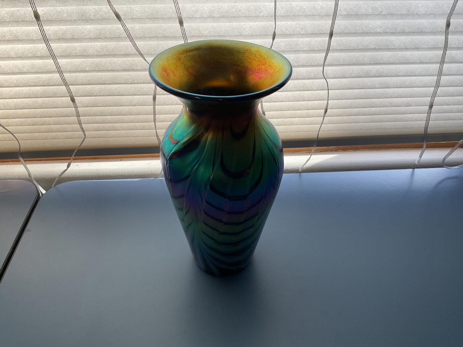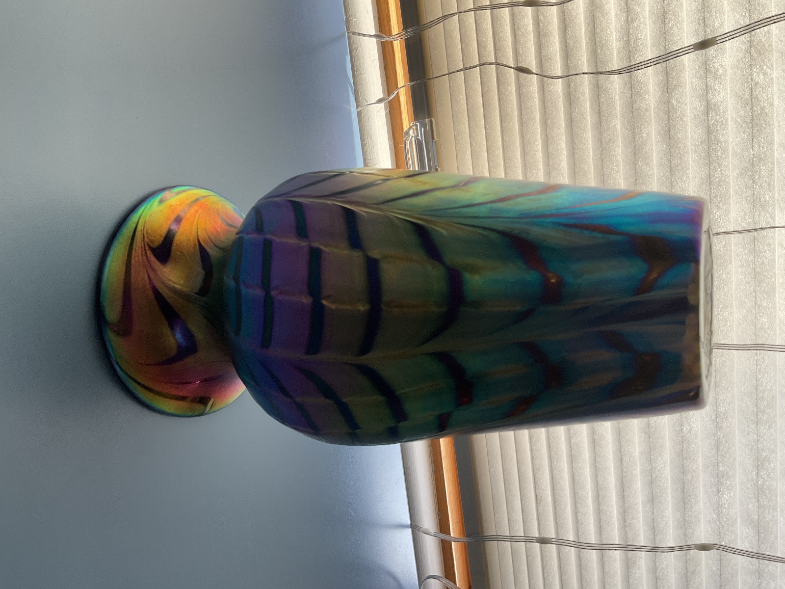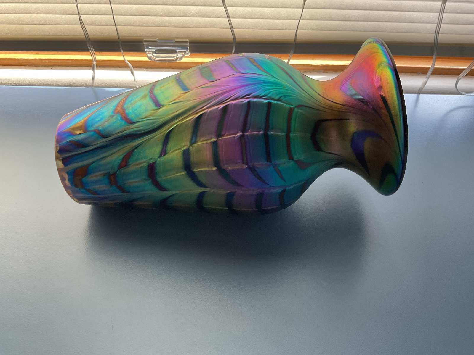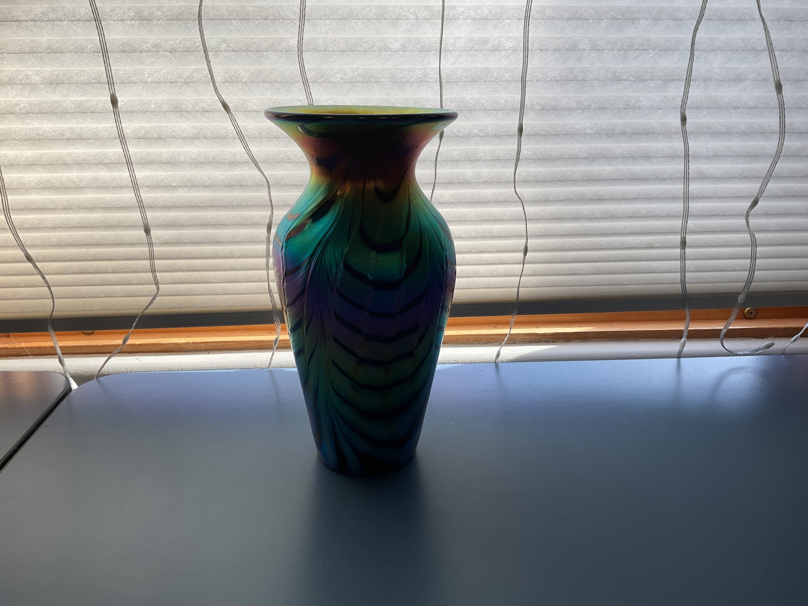 BEAUTIFUL Iridescent Pulled Feather Design Art Glass Vase
