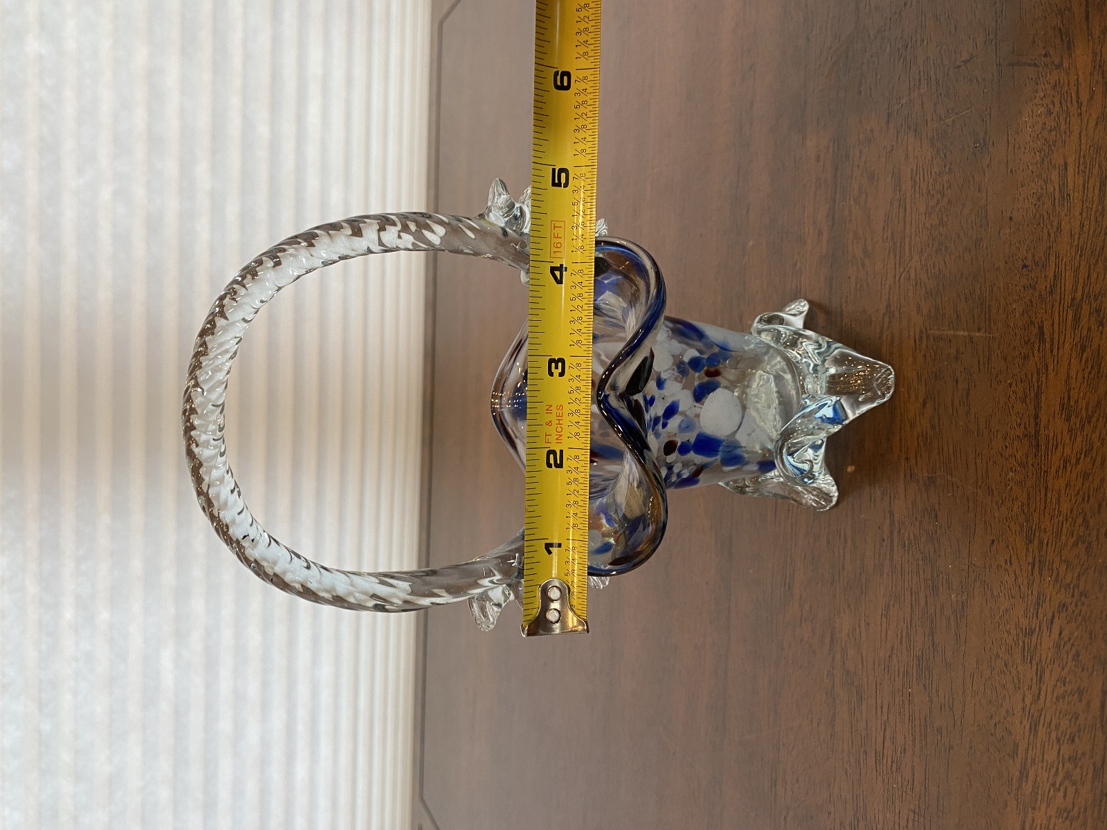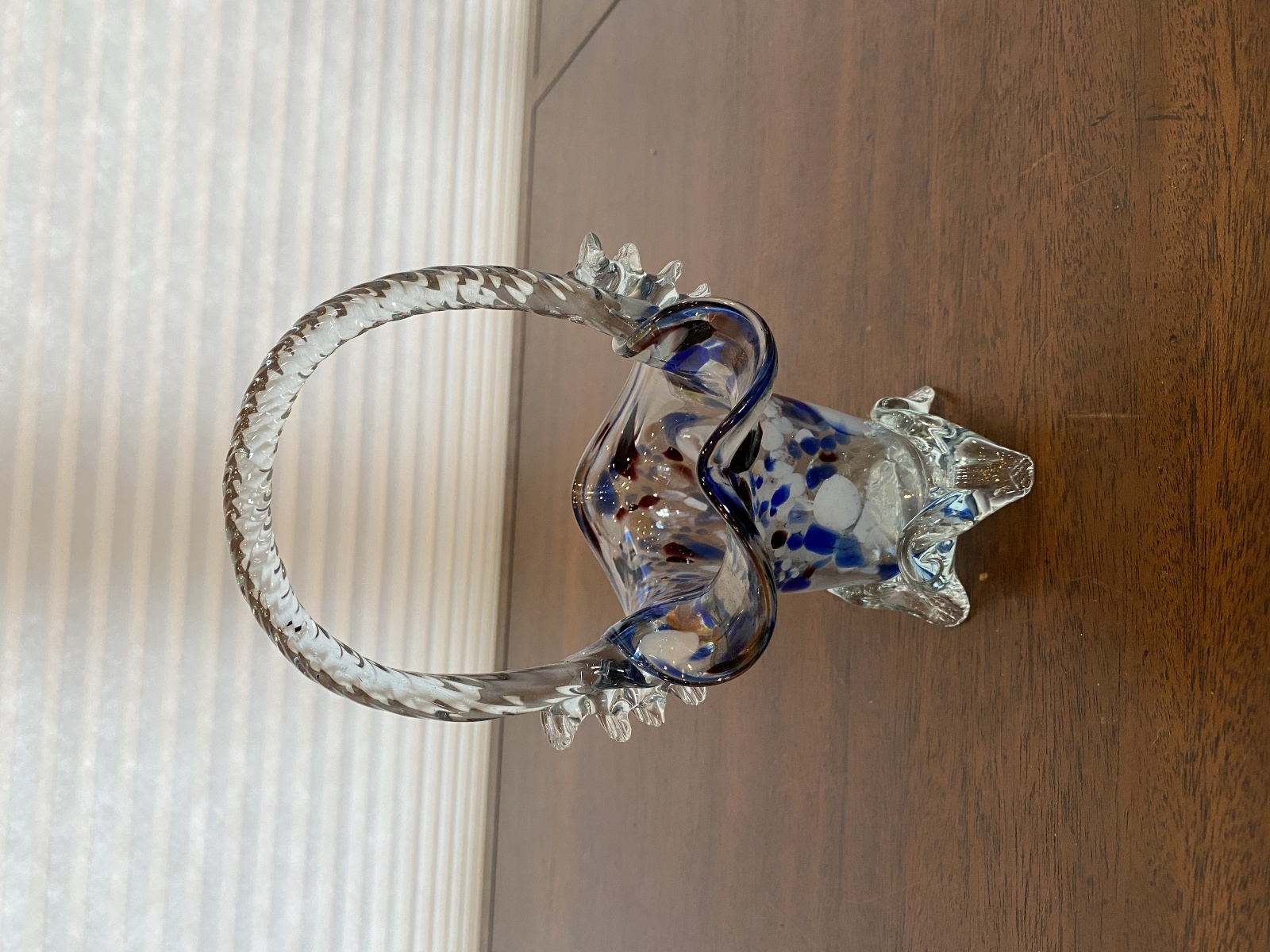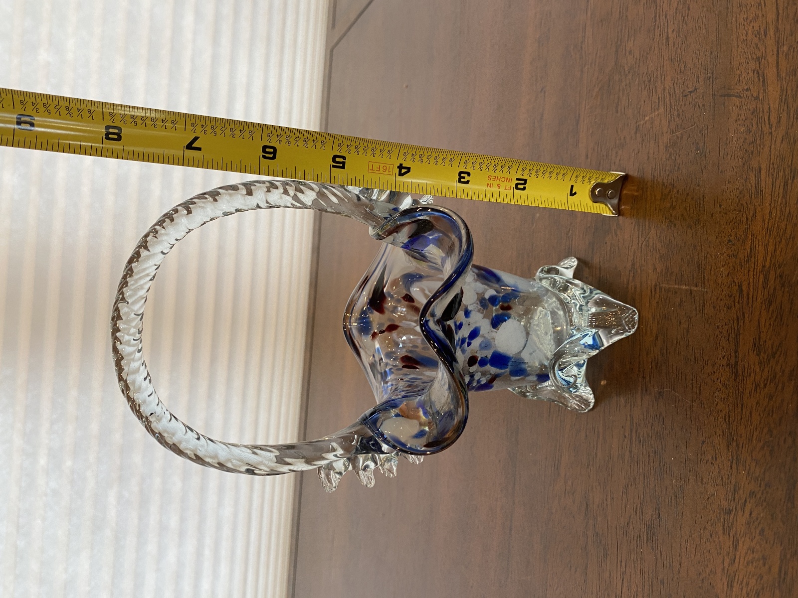VTG HAND BLOWN Multicolored Splatter Art Glass Basket W/Twisted Handle 7.75"H