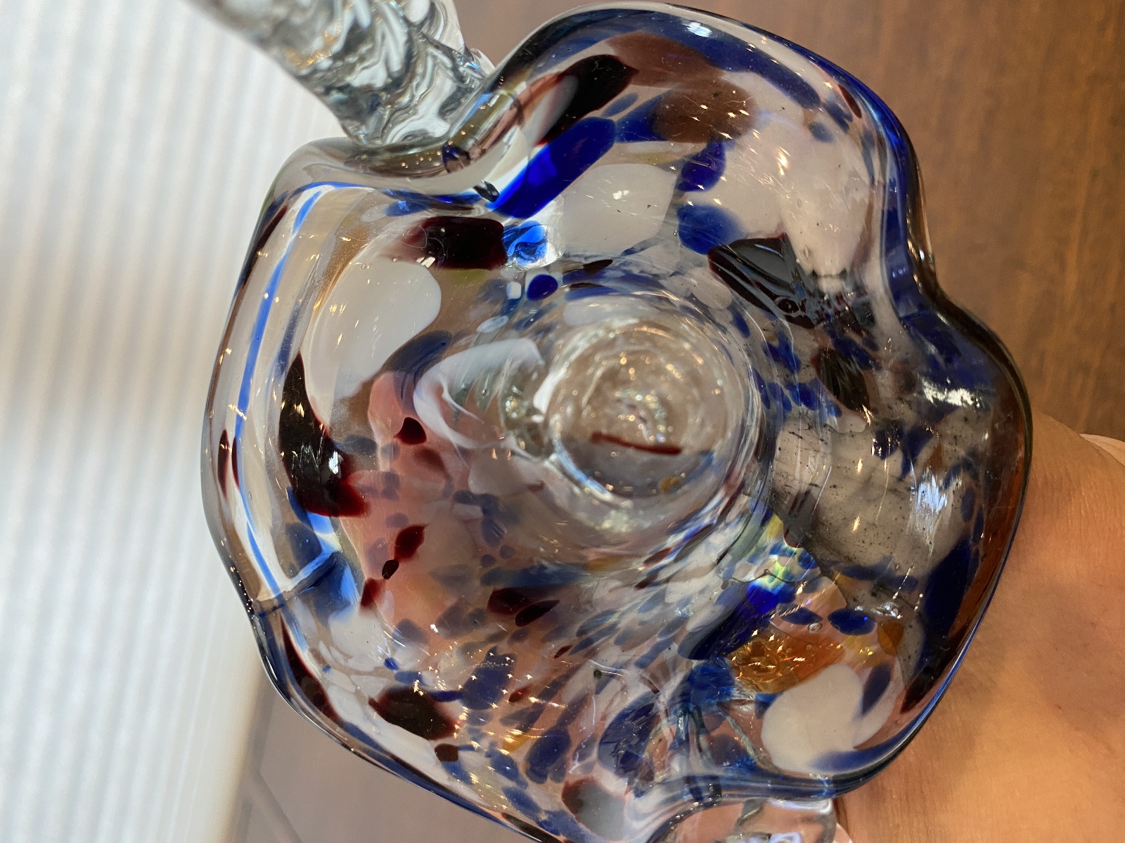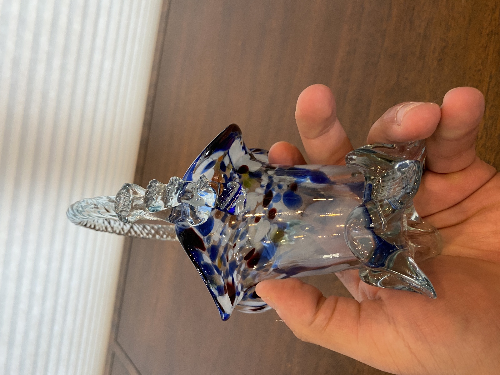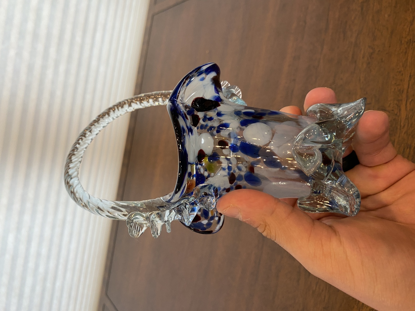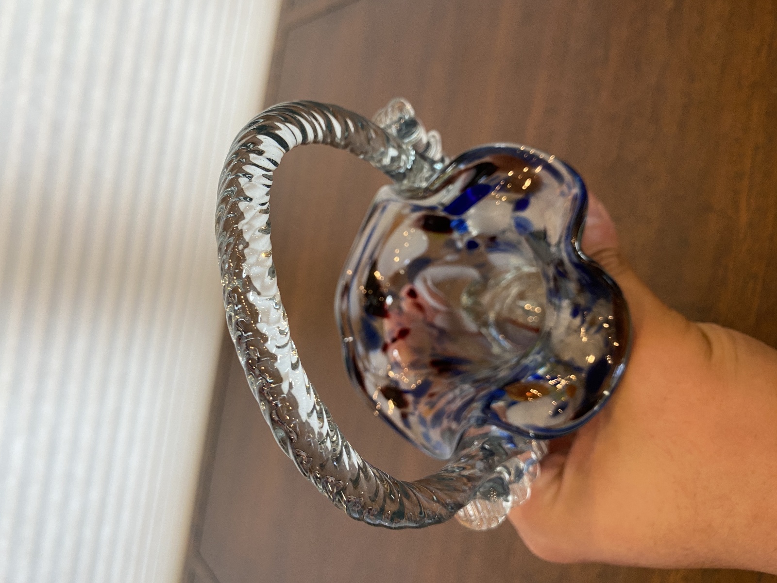 VTG HAND BLOWN Multicolored Splatter Art Glass Basket W/Twisted Handle 7.75"H
