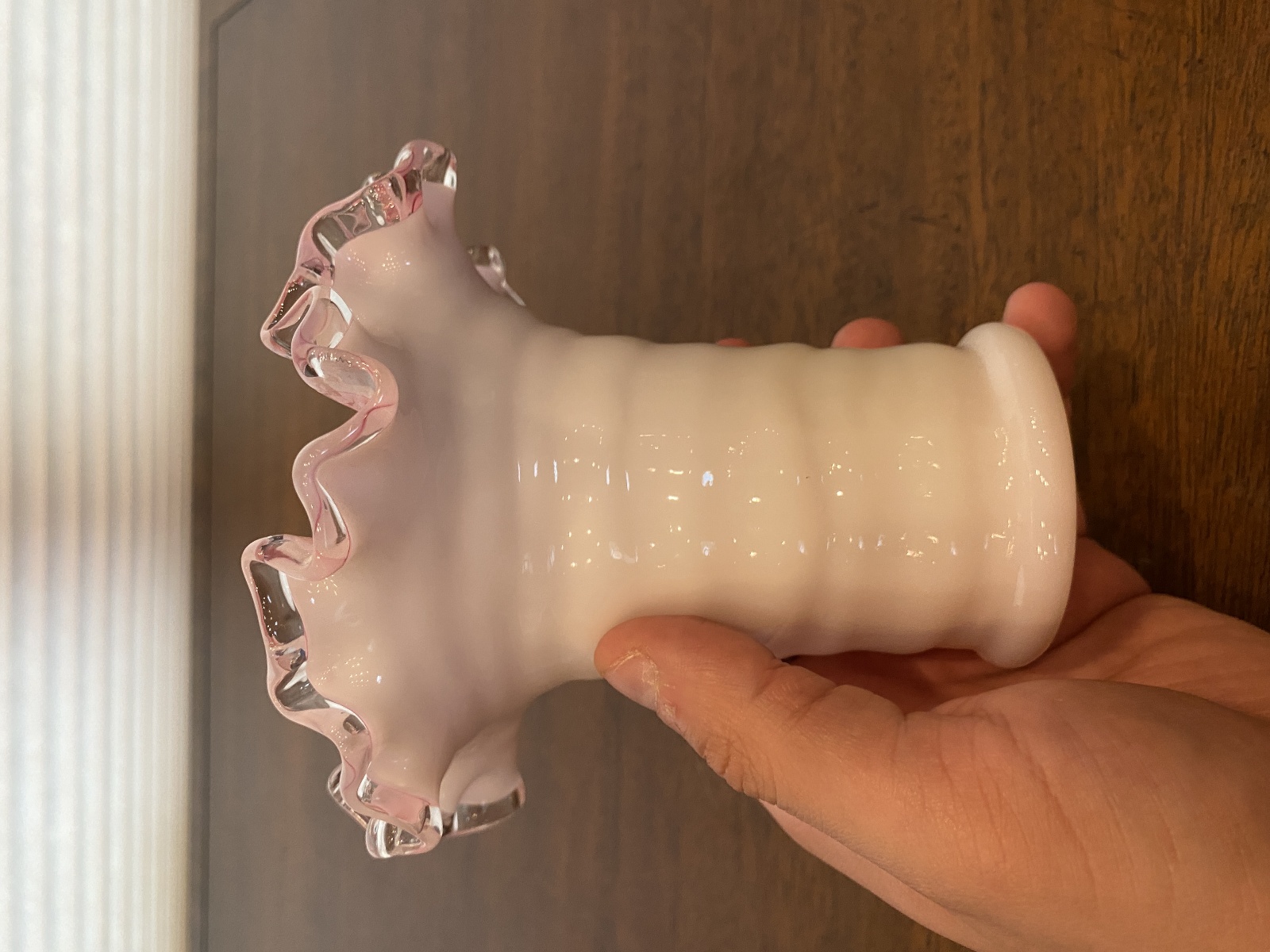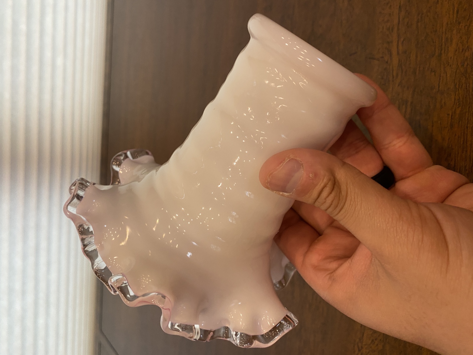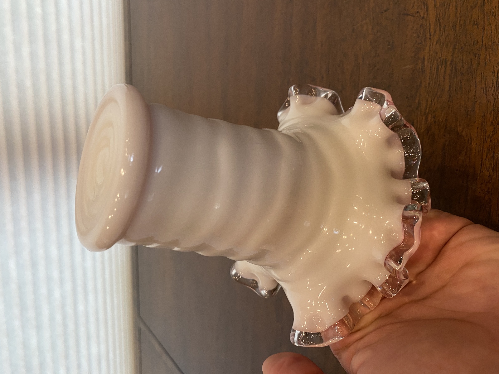 VTG FENTON PEACH BLOW Ruffled Rim Hat Art Glass Vase 5.25"H