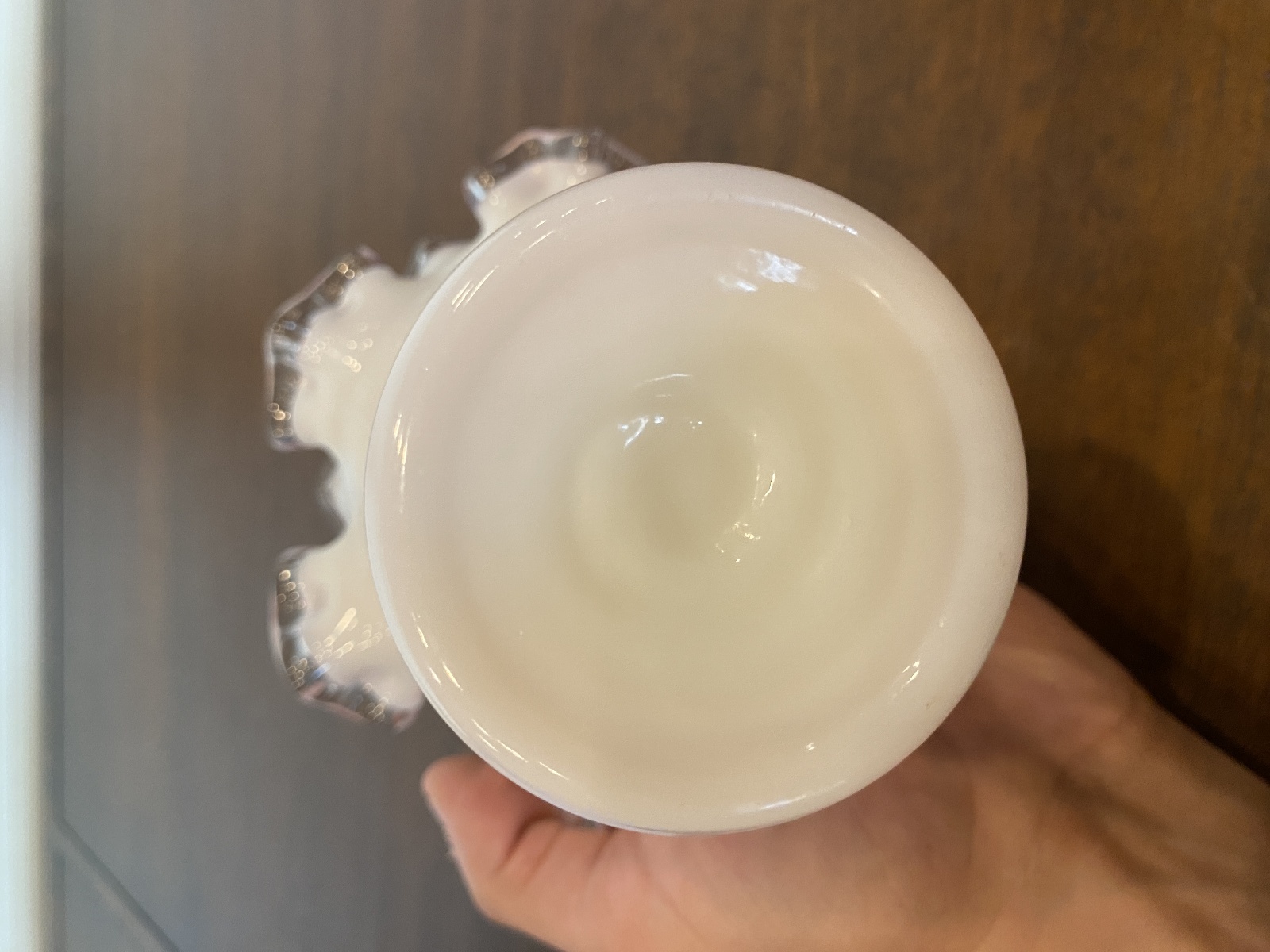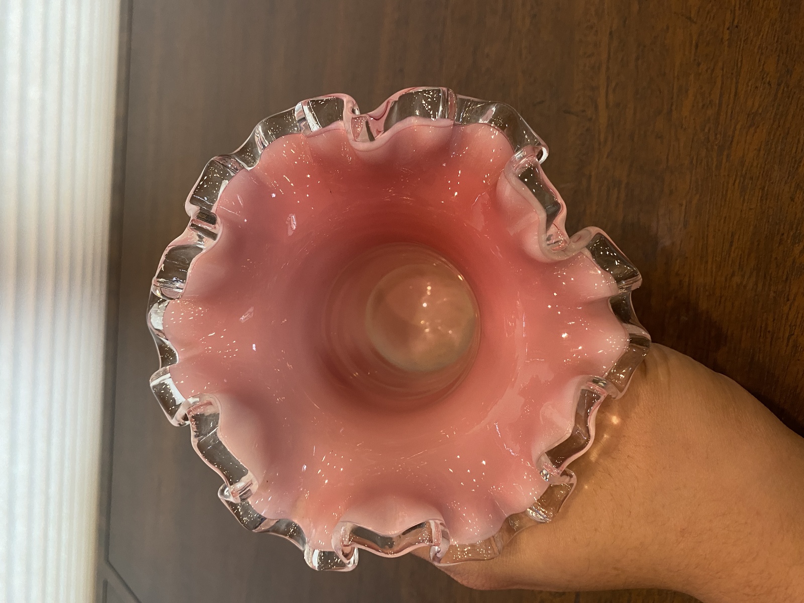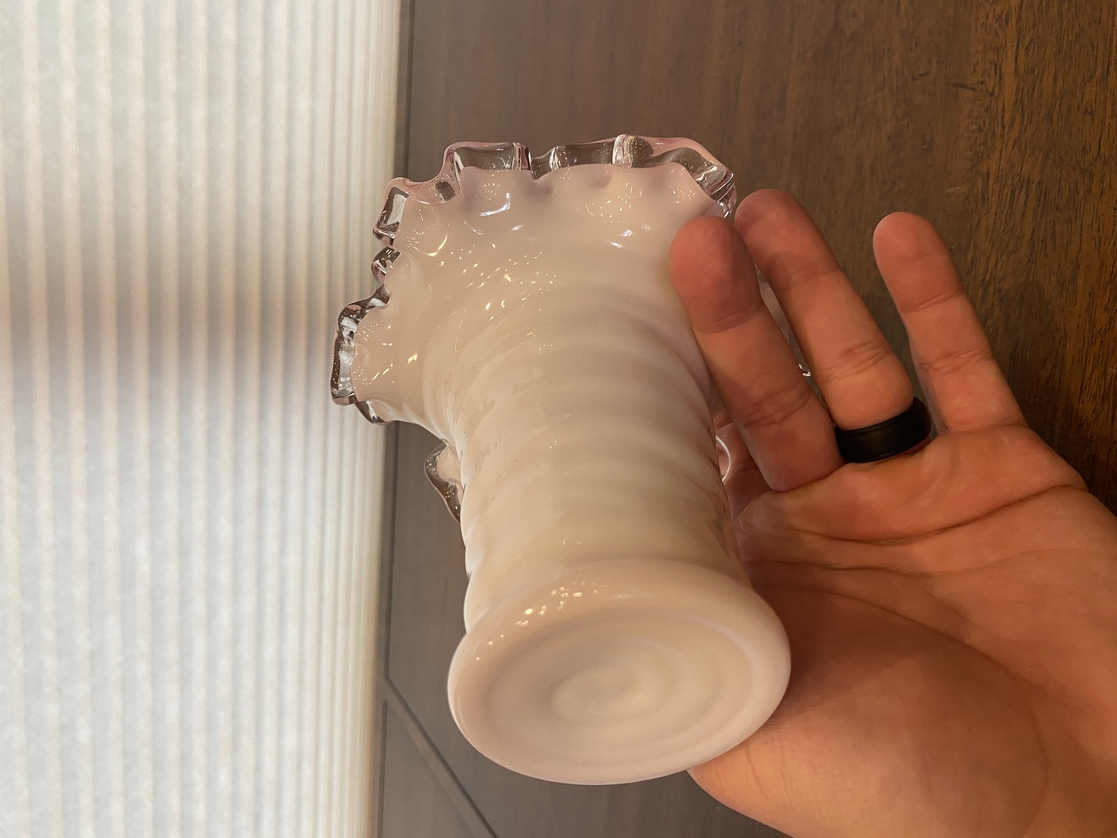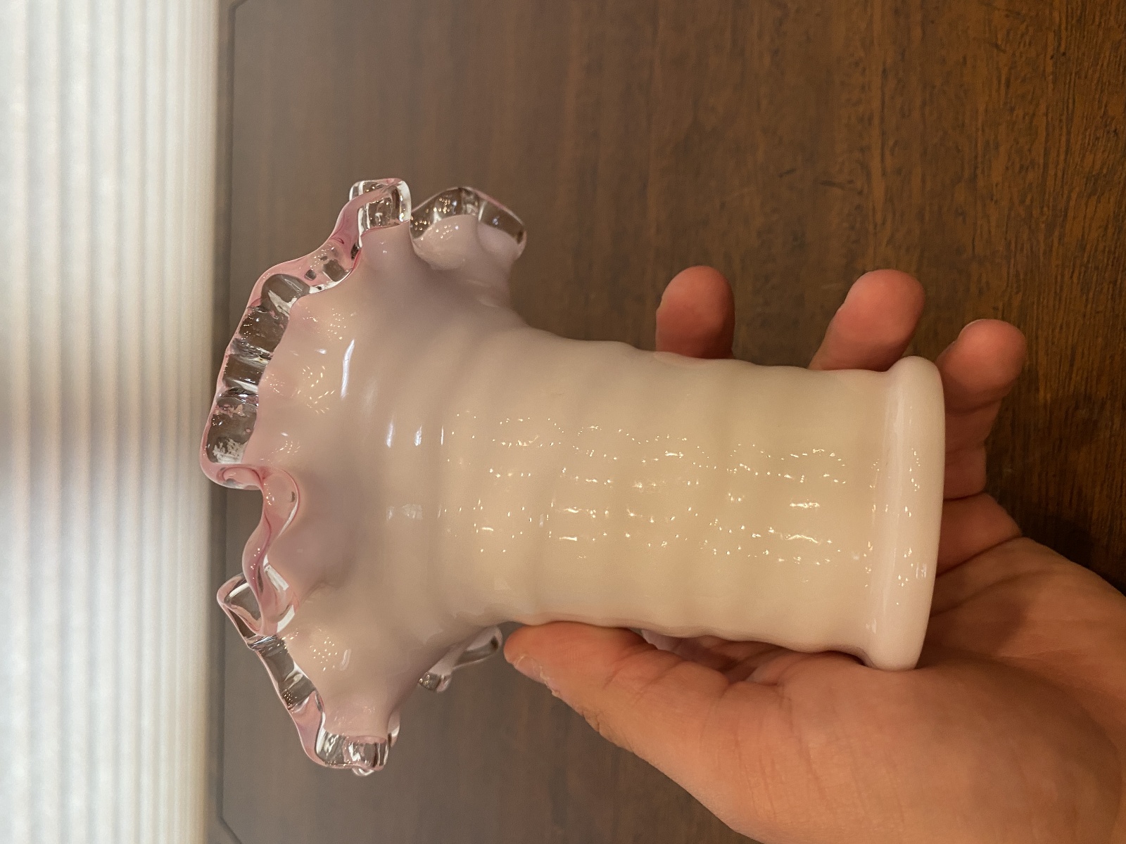 VTG FENTON PEACH BLOW Ruffled Rim Hat Art Glass Vase 5.25"H
