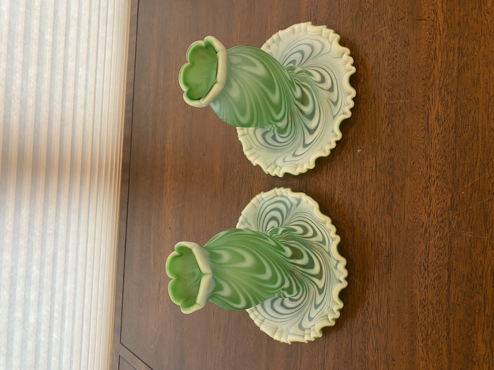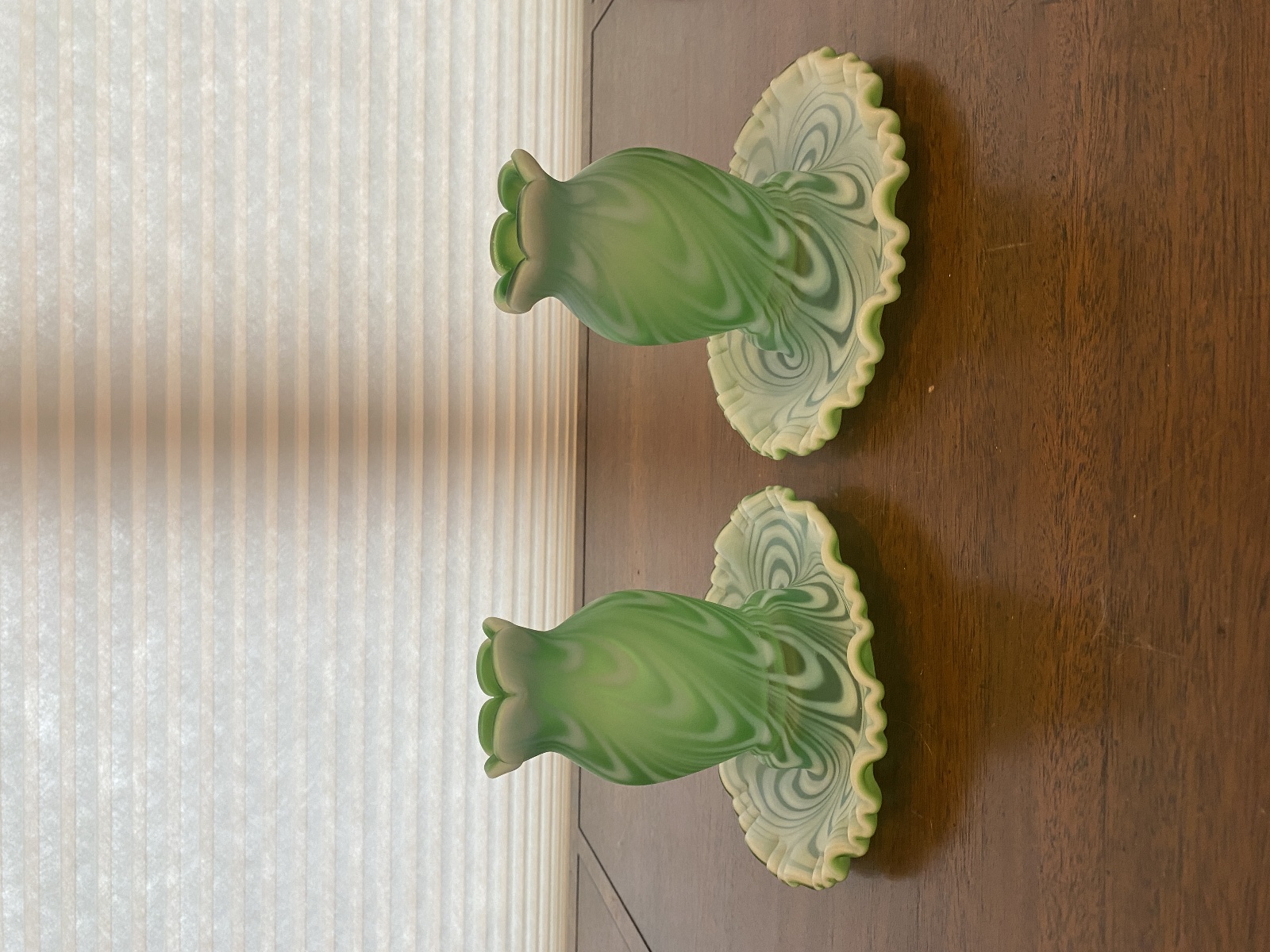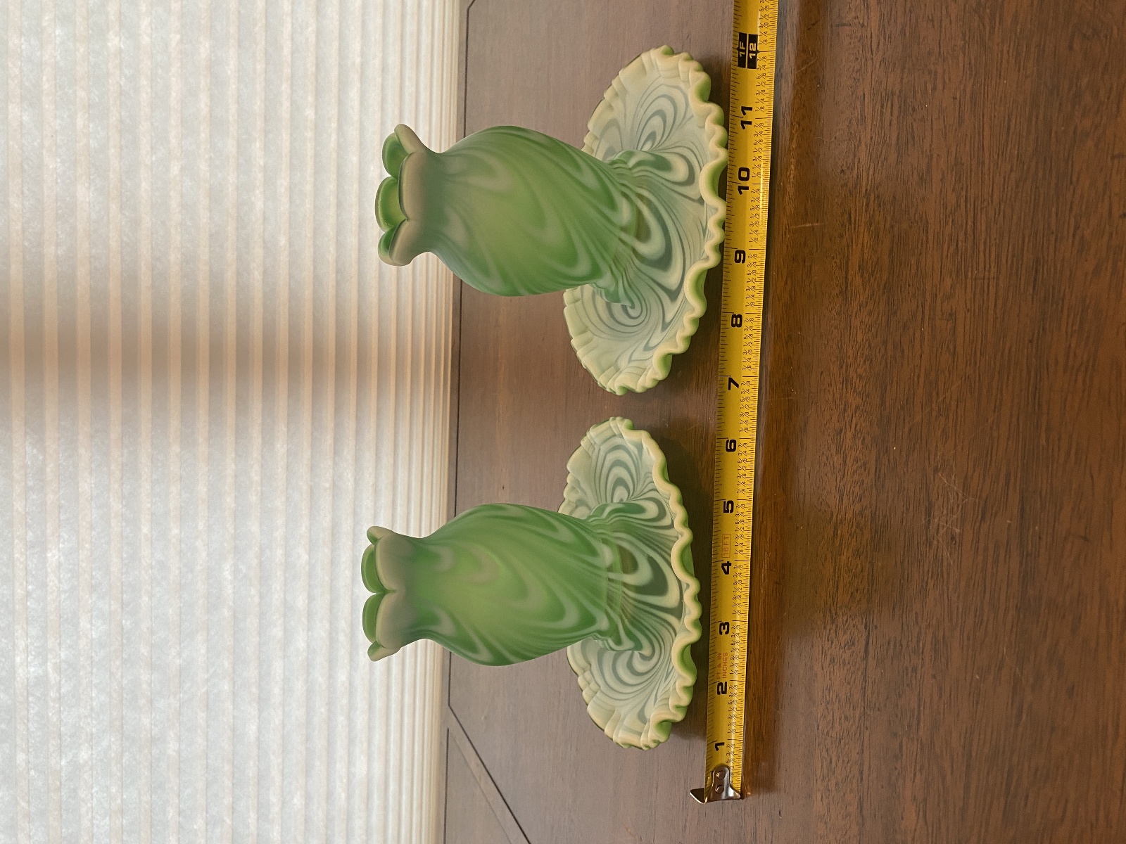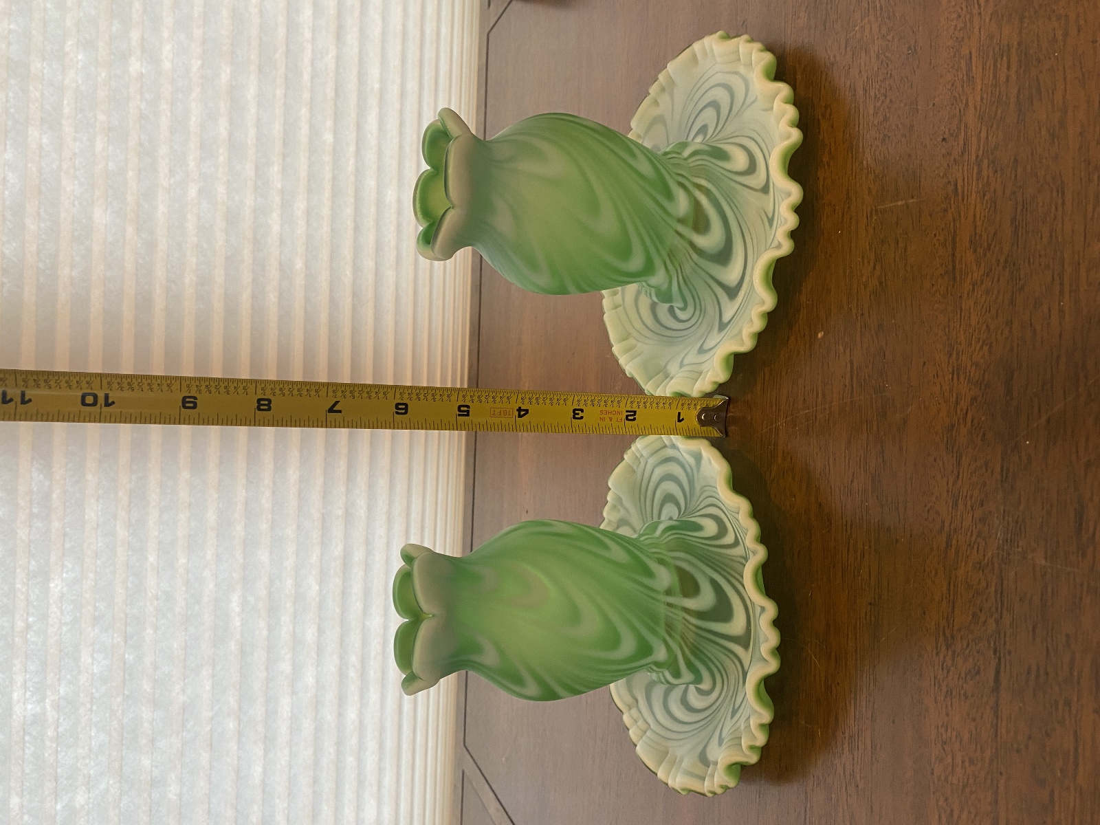 RARE VTG FENTON Green Opalescent Satin SWIRLED FEATHER Fairy Lamps PAIR 5.75"H