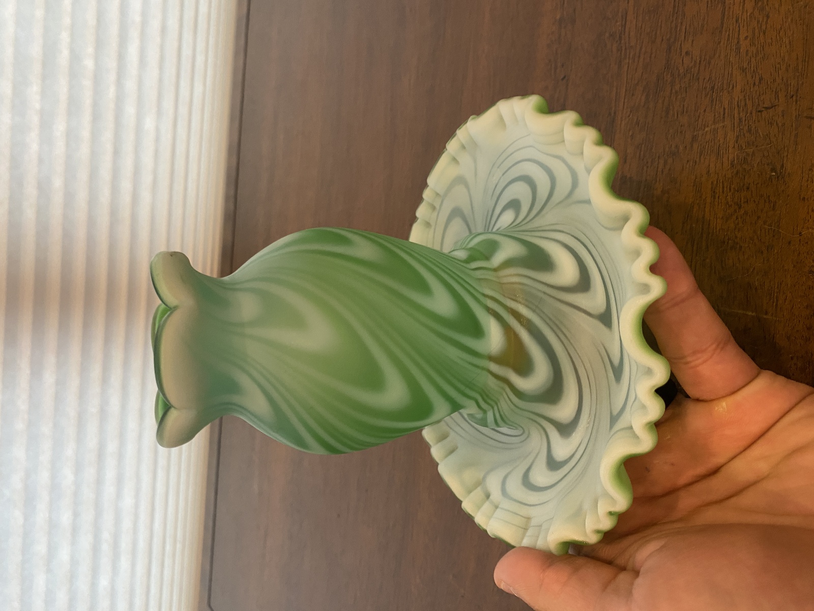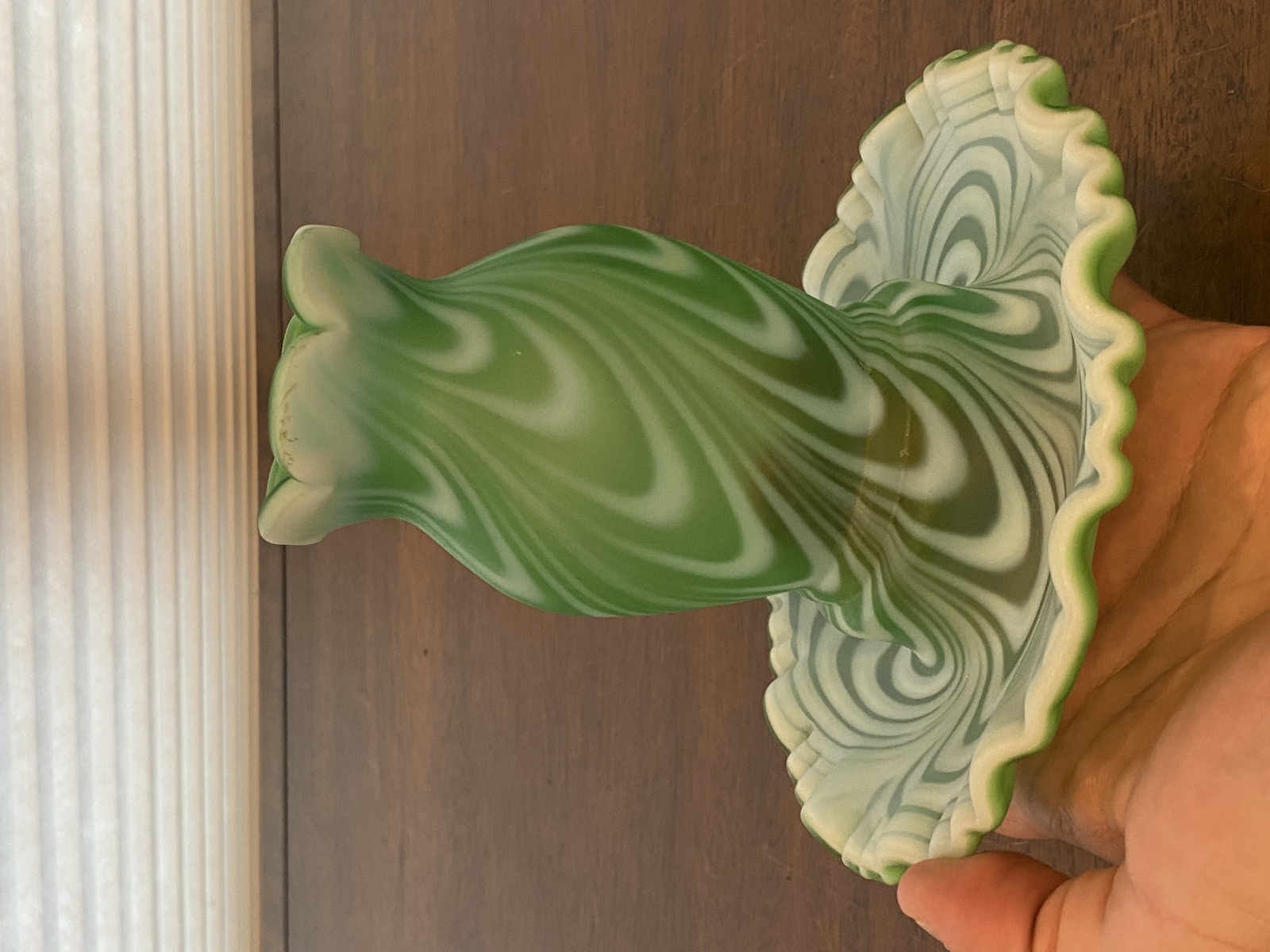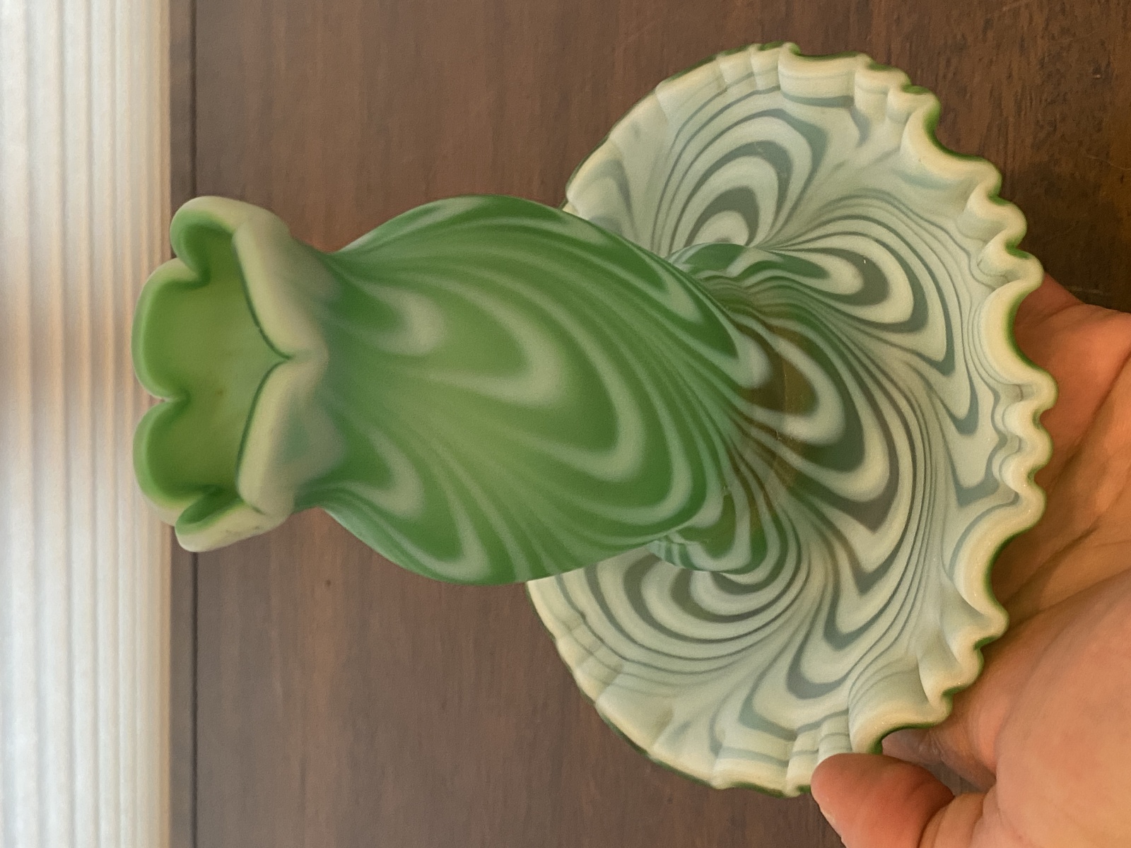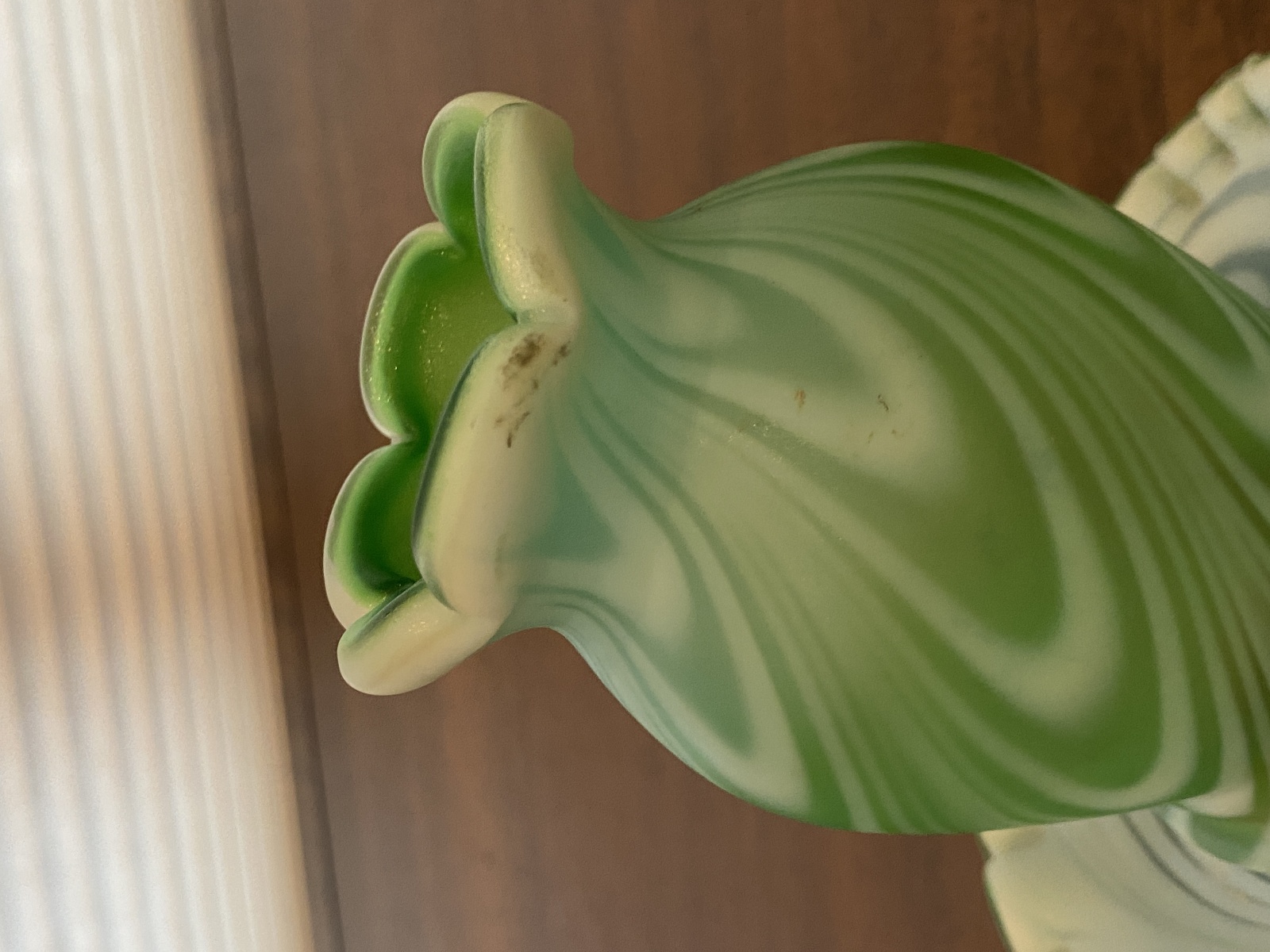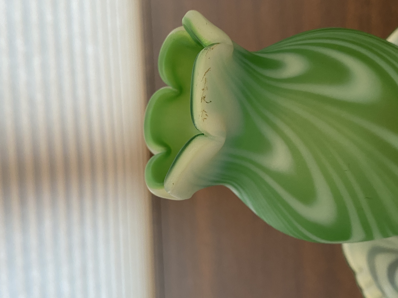 RARE VTG FENTON Green Opalescent Satin SWIRLED FEATHER Fairy Lamps PAIR 5.75"H