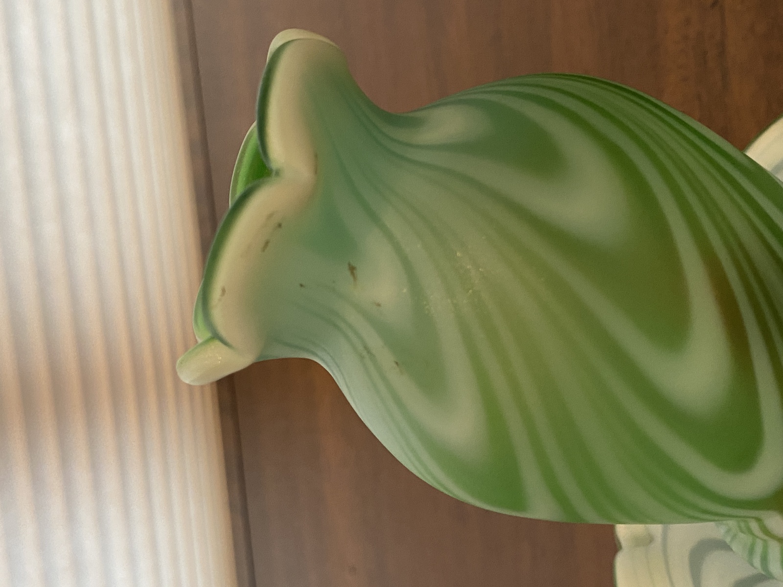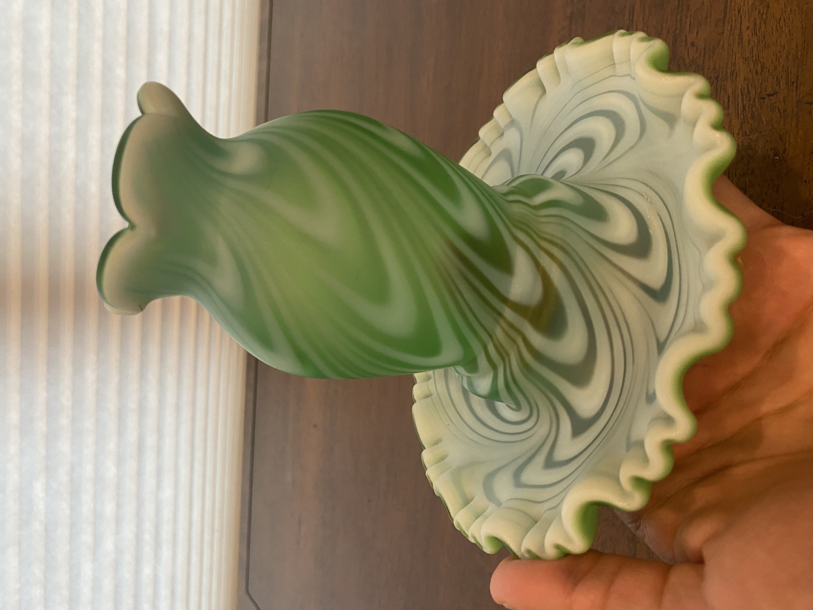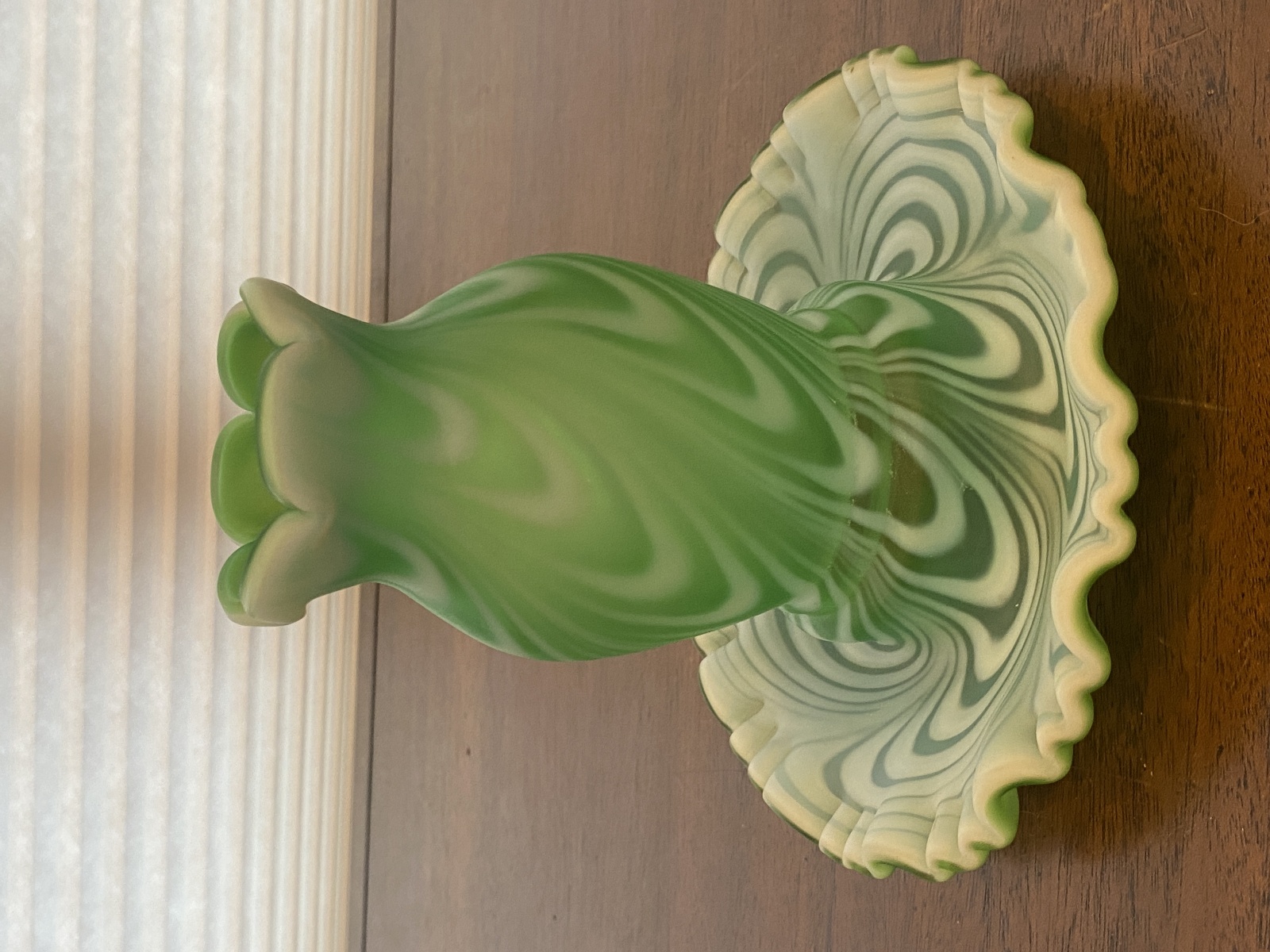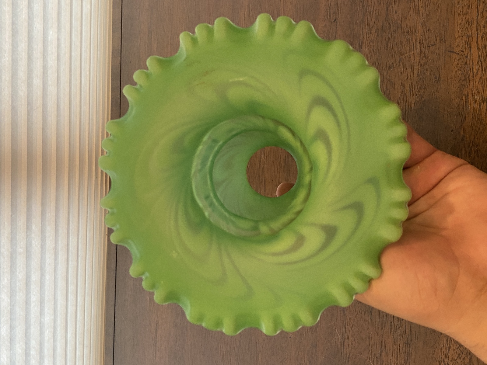 RARE VTG FENTON Green Opalescent Satin SWIRLED FEATHER Fairy Lamps PAIR 5.75"H