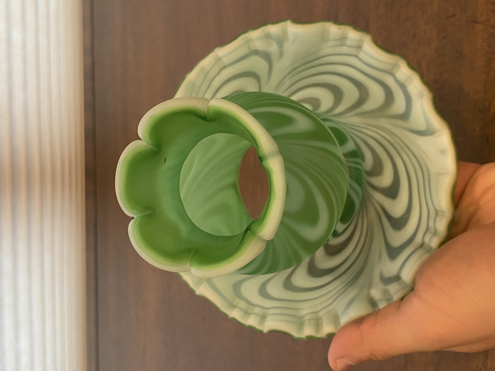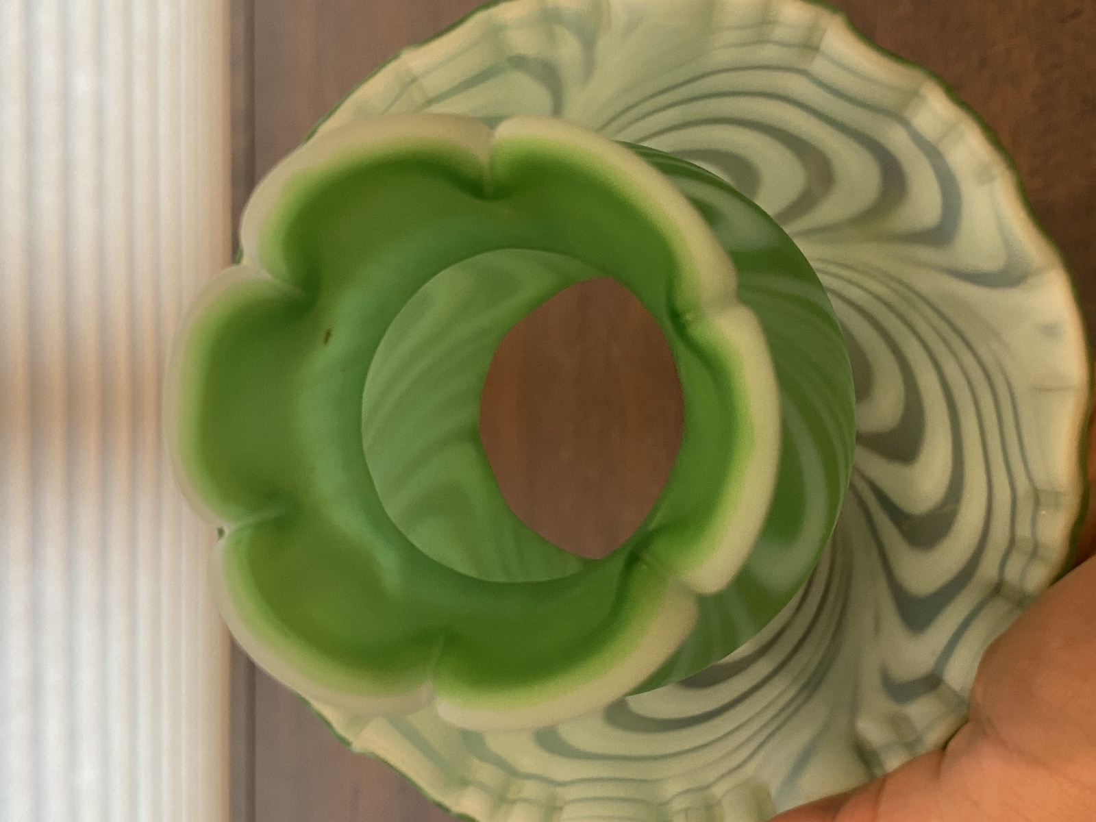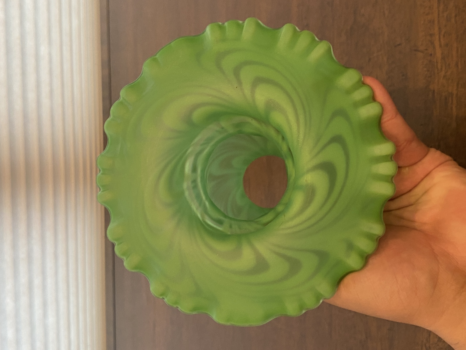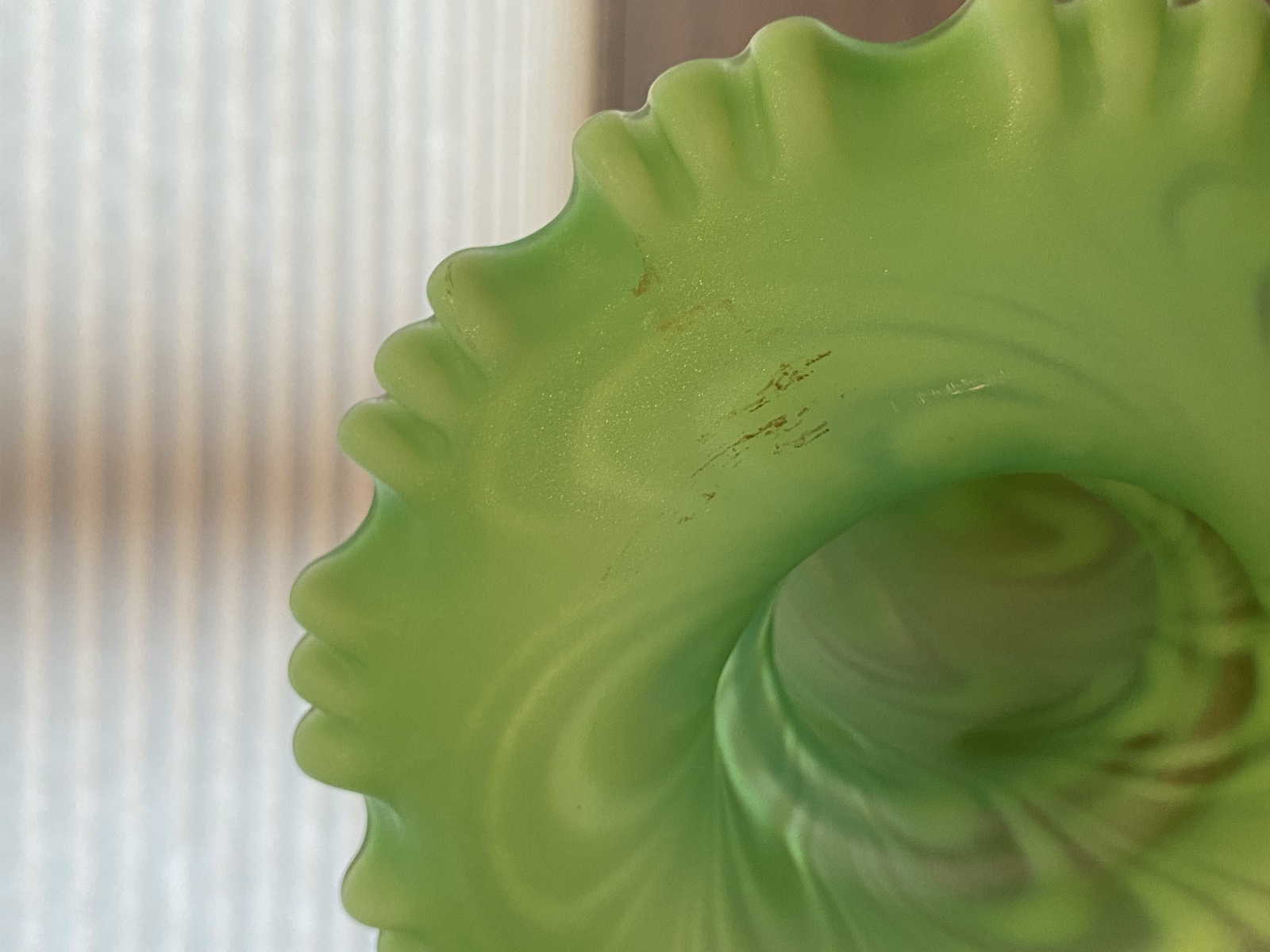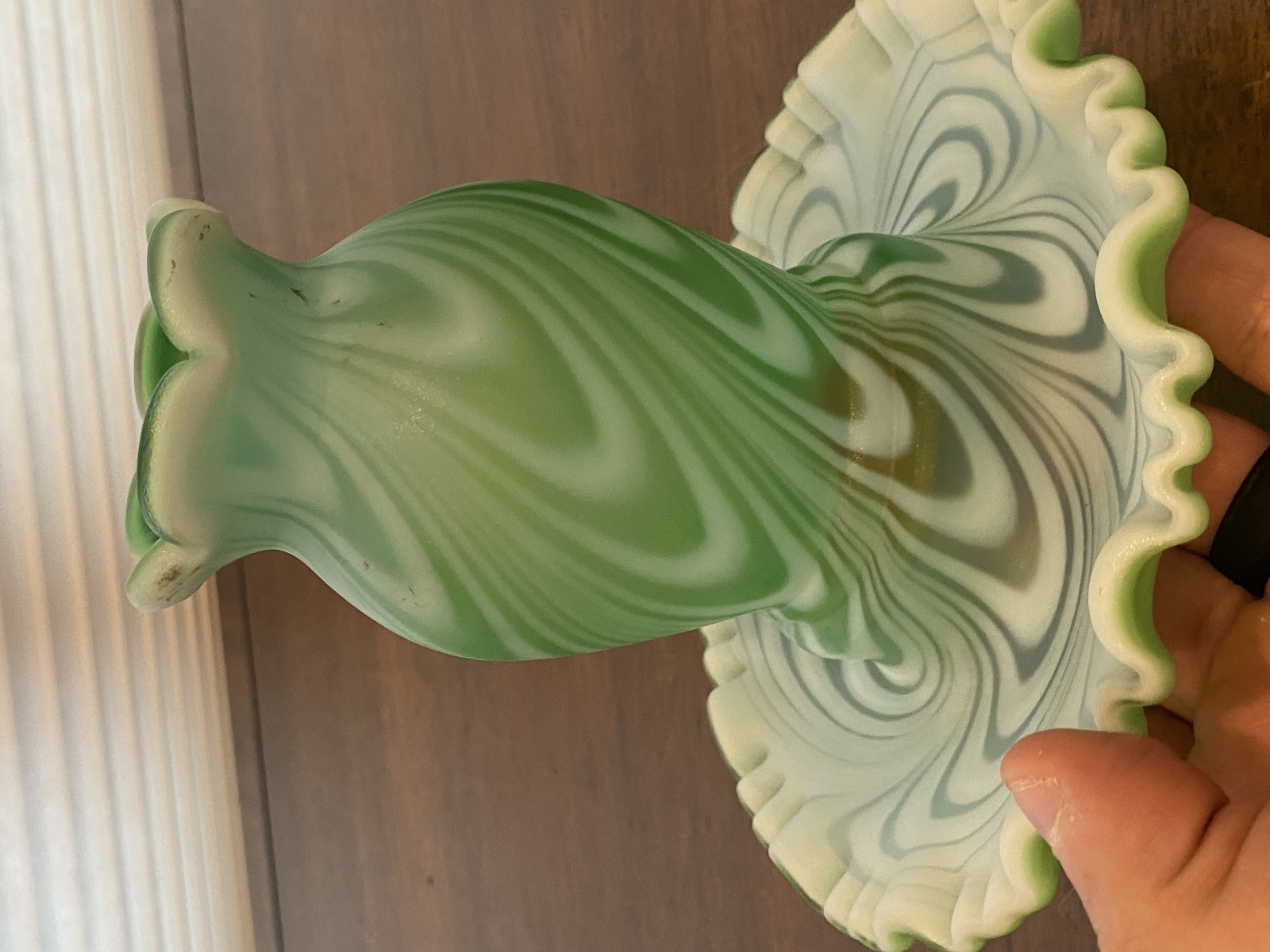RARE VTG FENTON Green Opalescent Satin SWIRLED FEATHER Fairy Lamps PAIR 5.75"H