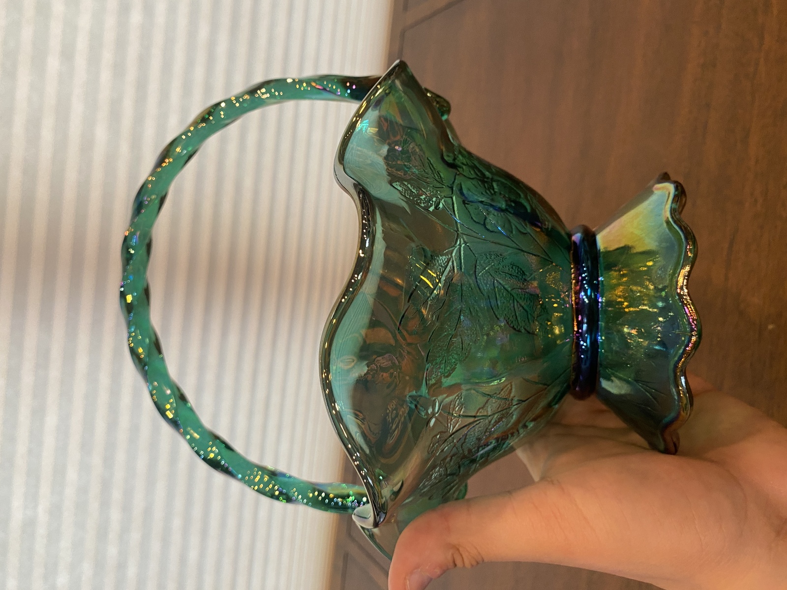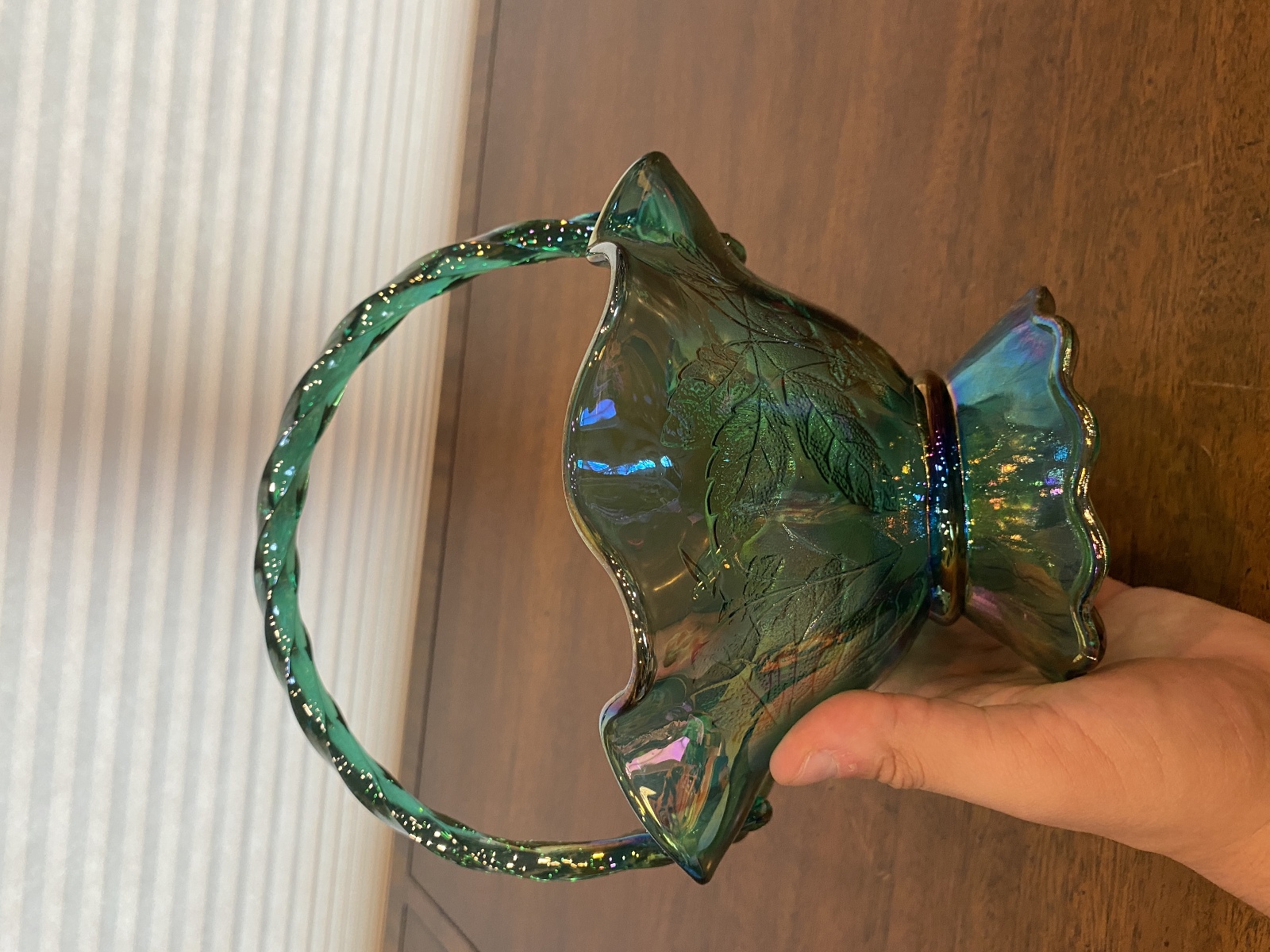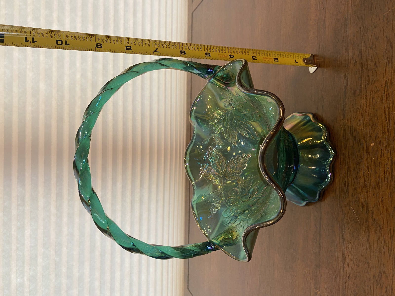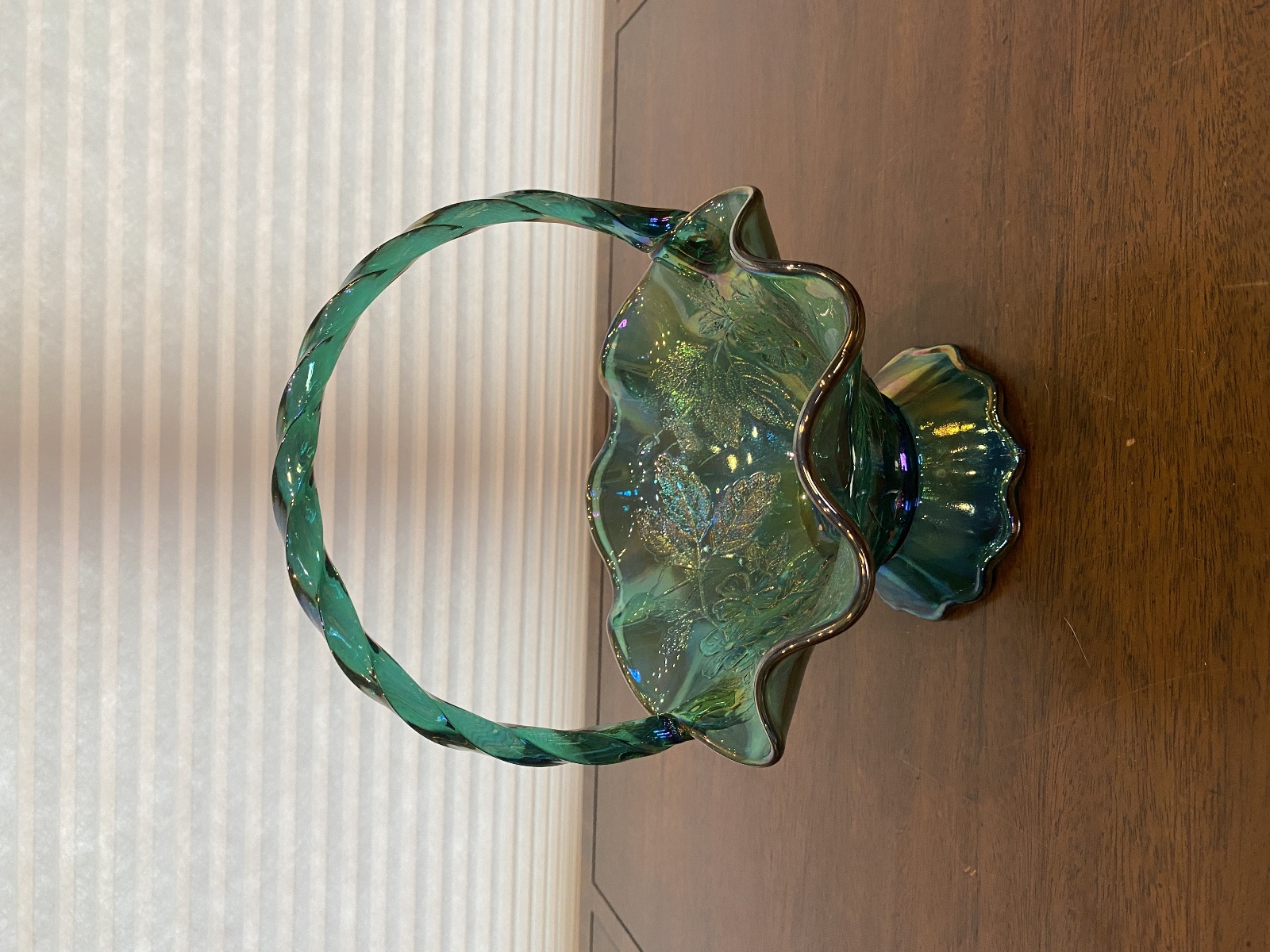 VTG FENTON Teal Iridescent Floral Pattern Art Glass Twisted Handle Basket 9.5"H
