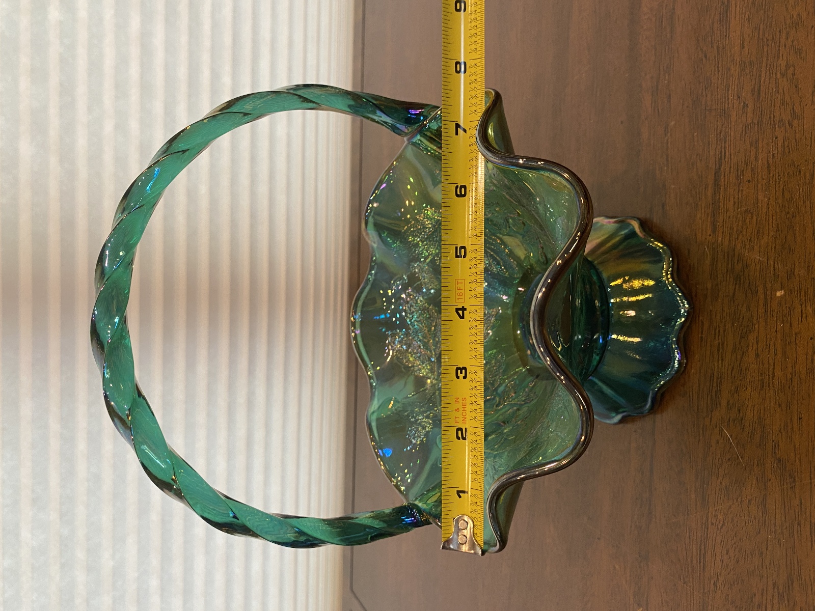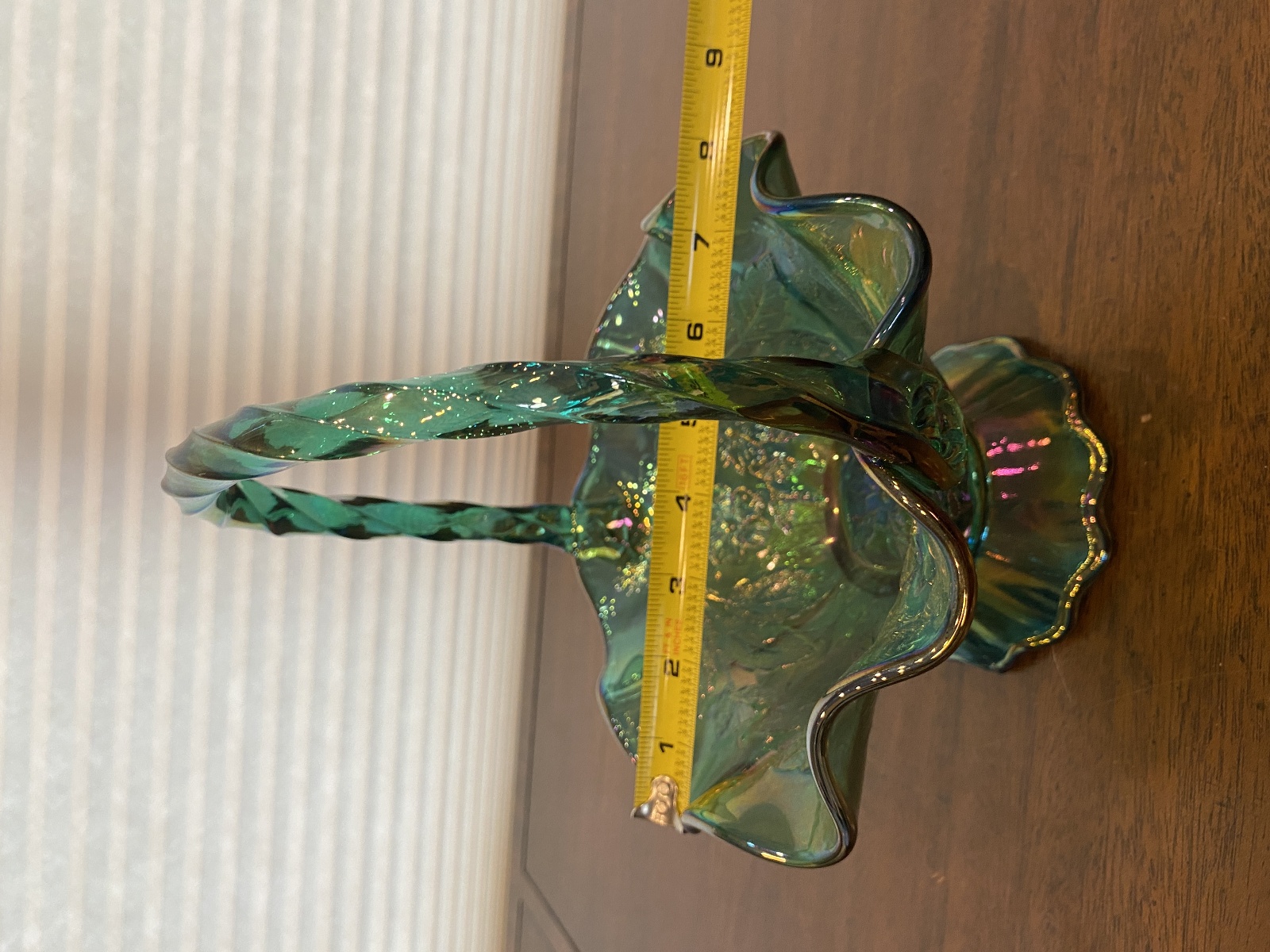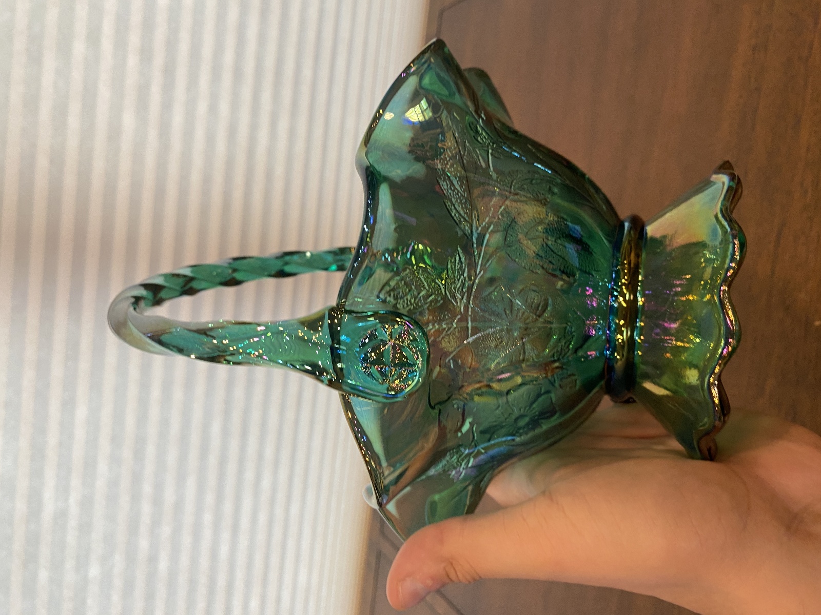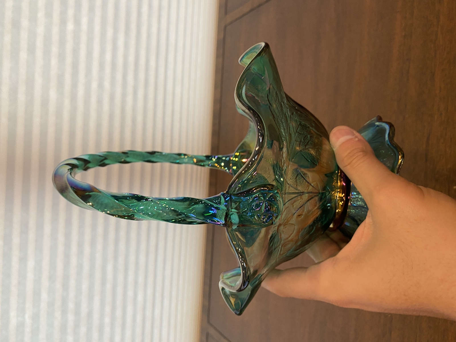 VTG FENTON Teal Iridescent Floral Pattern Art Glass Twisted Handle Basket 9.5"H