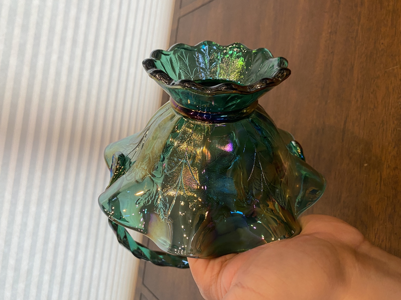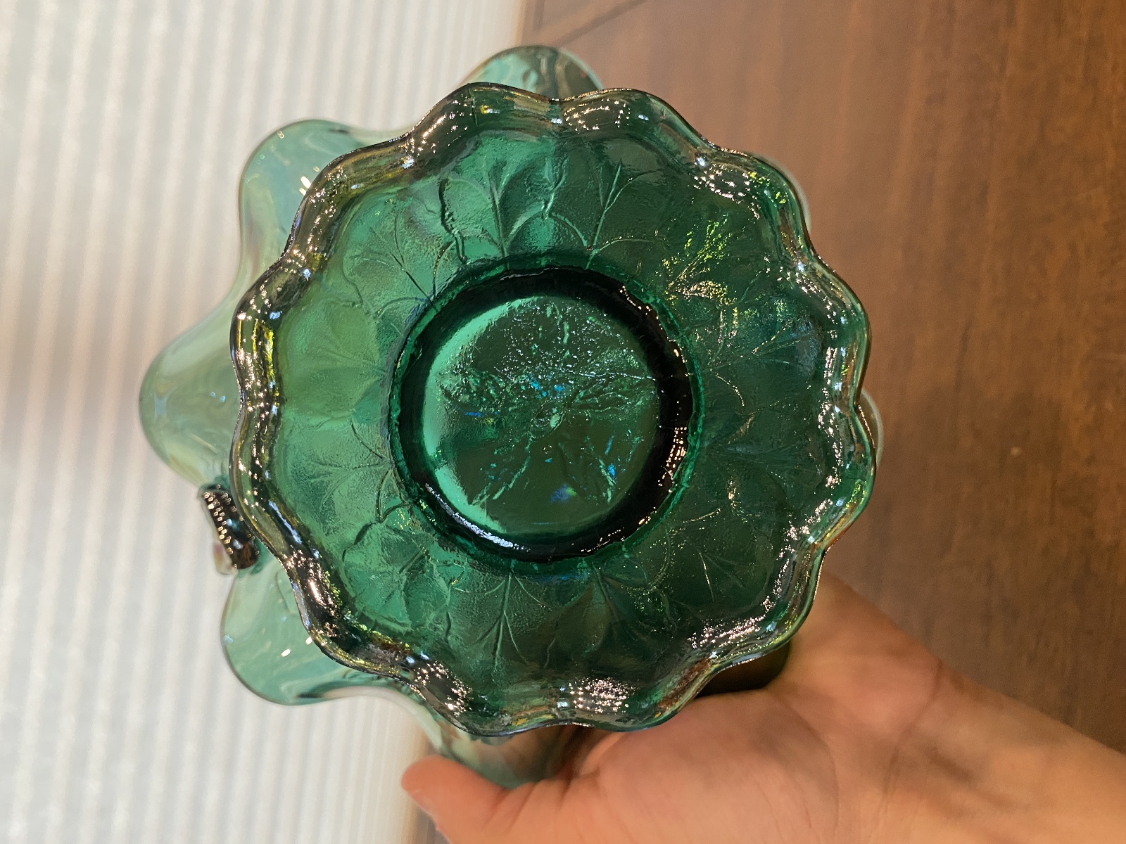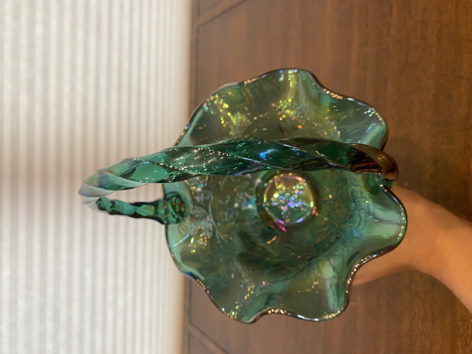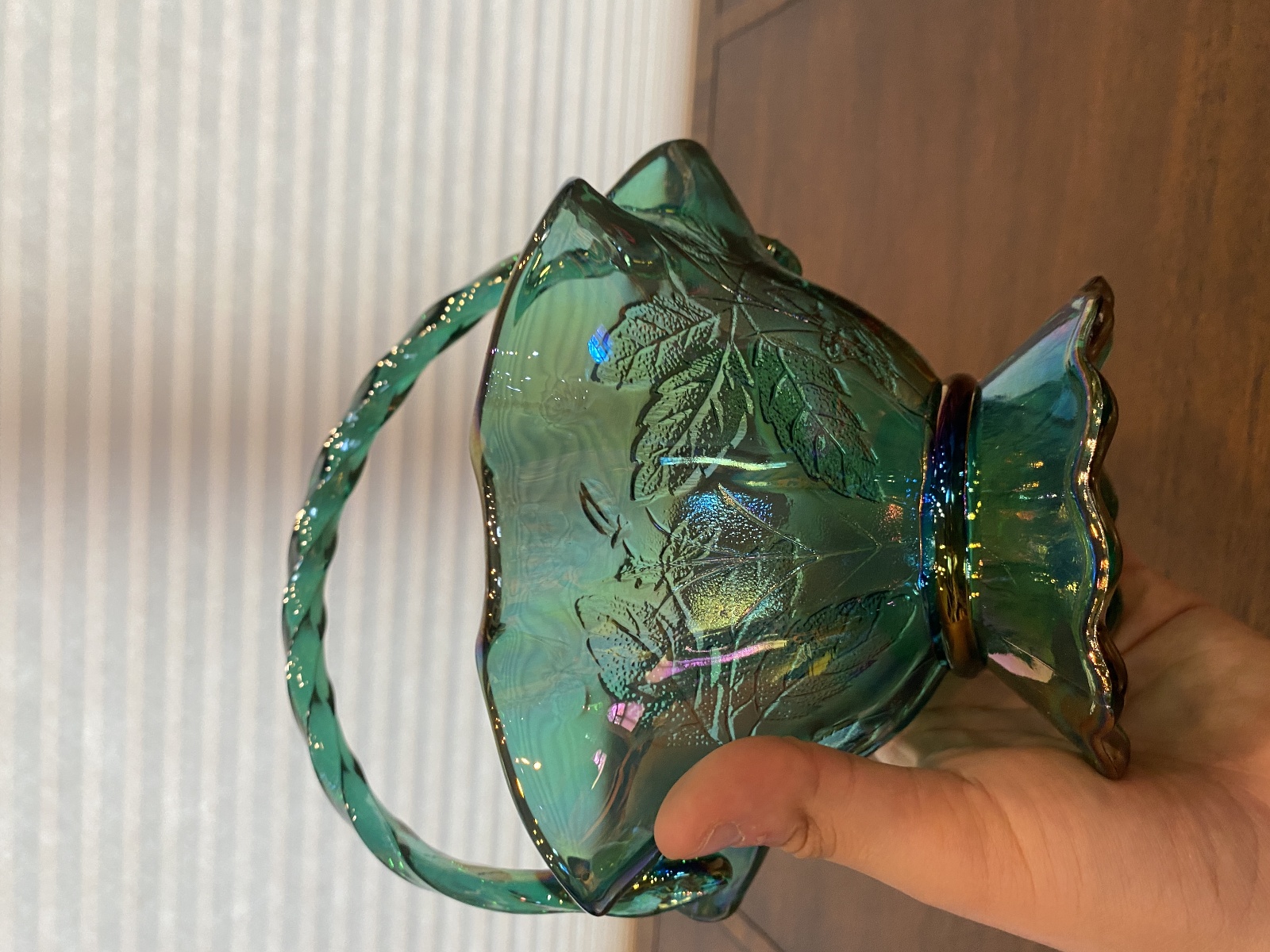 VTG FENTON Teal Iridescent Floral Pattern Art Glass Twisted Handle Basket 9.5"H