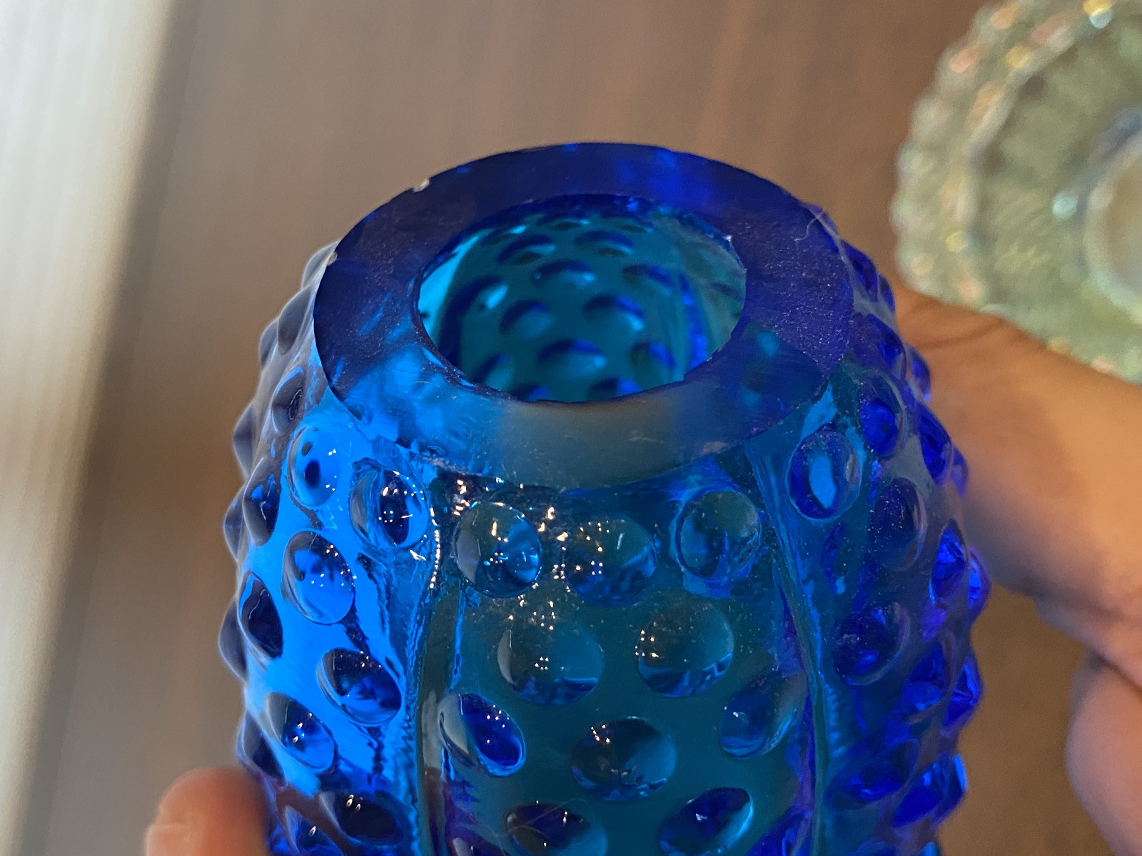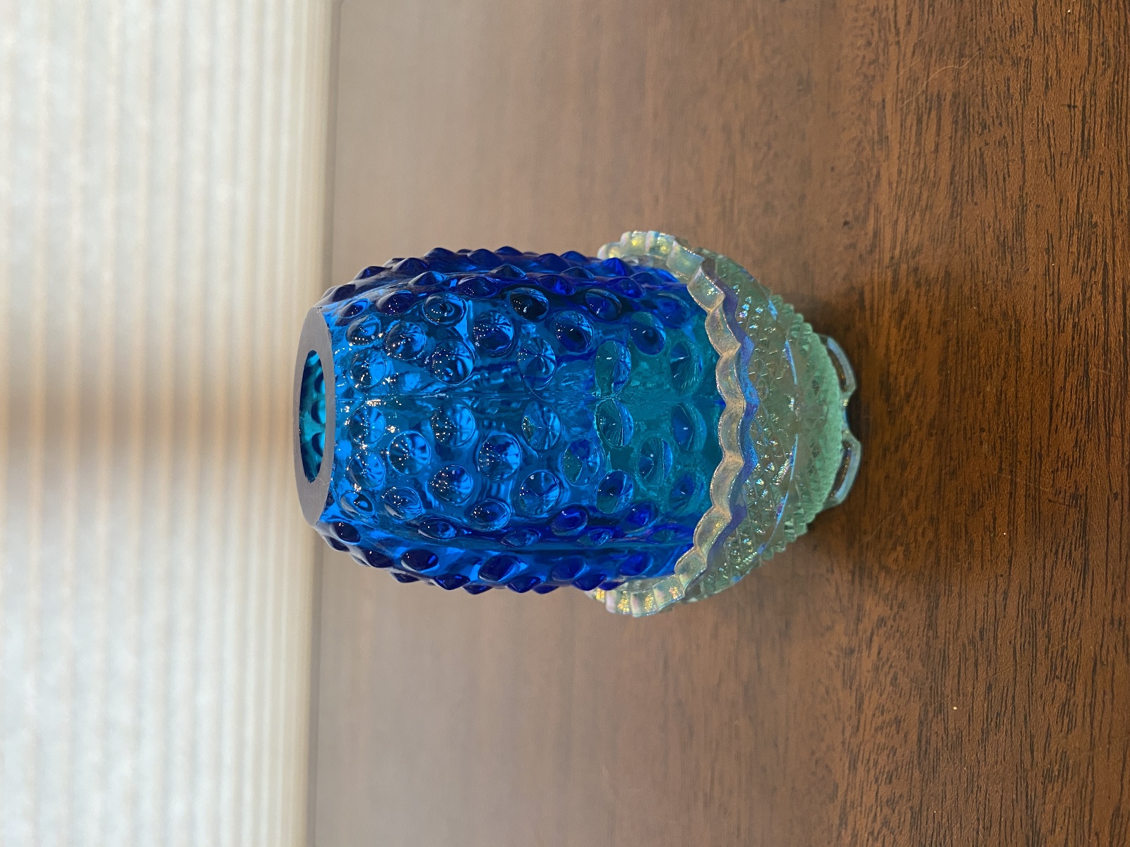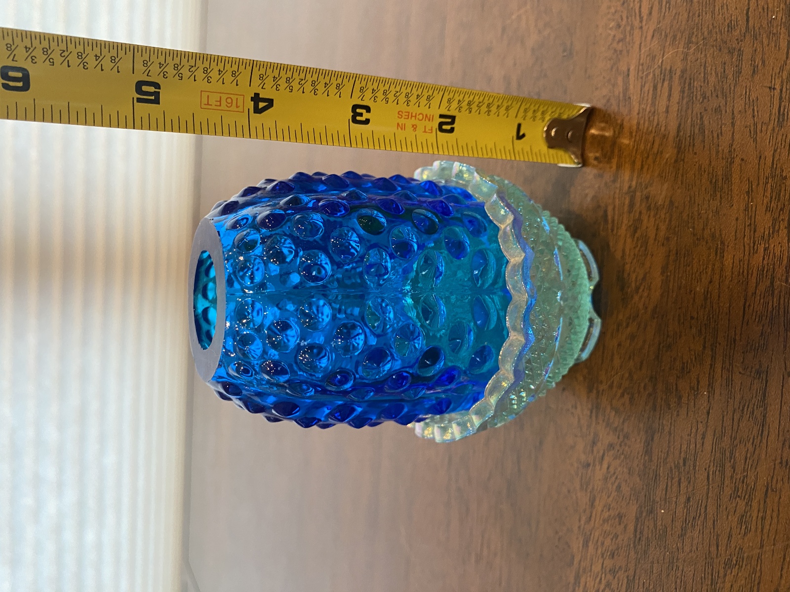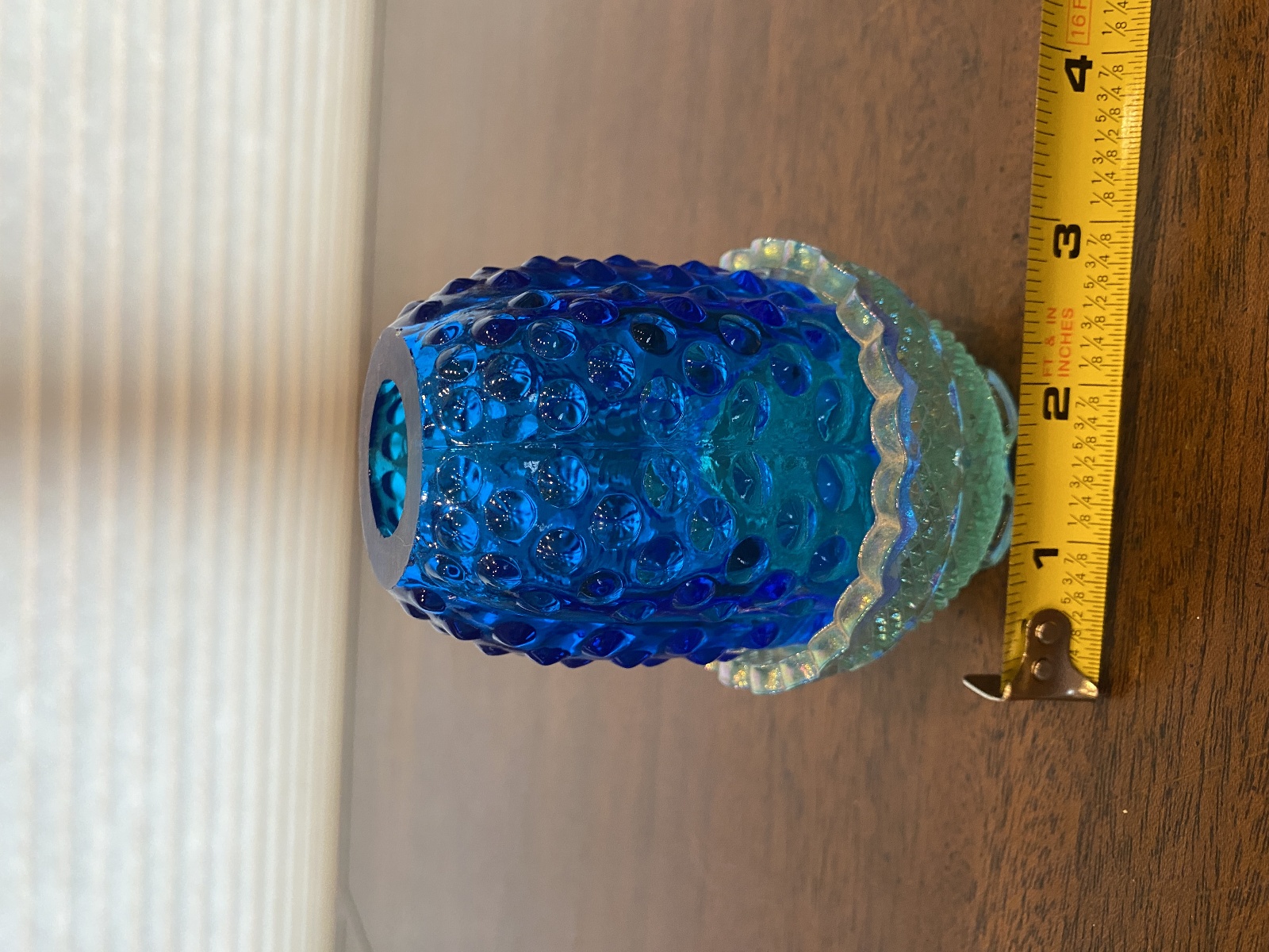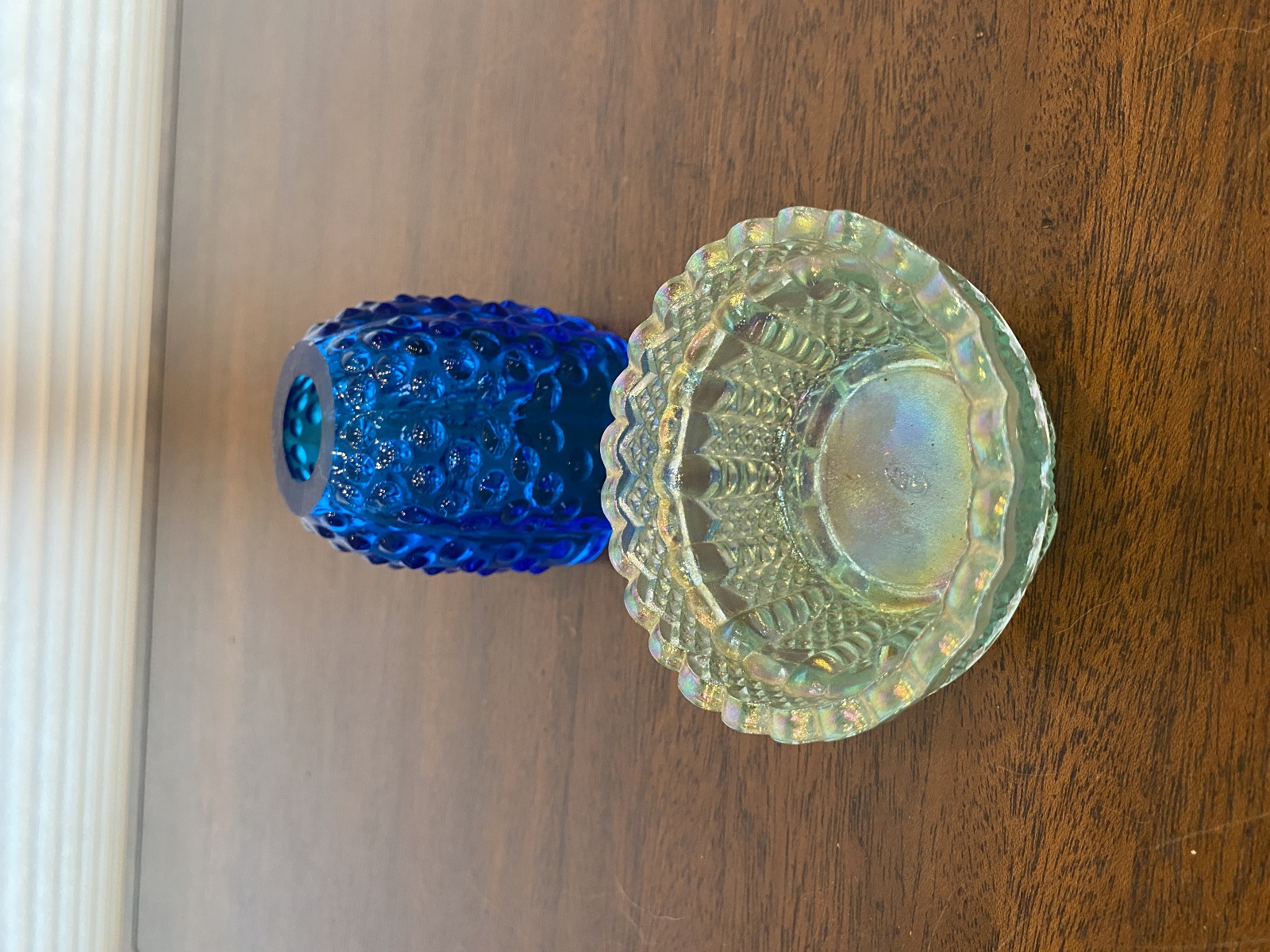 VTG FENTON Blue Top/Iridescent Base Glass Hobnail Fairy Lamp Candle Holder 4.25"