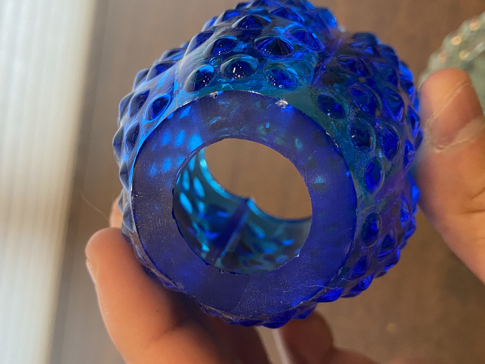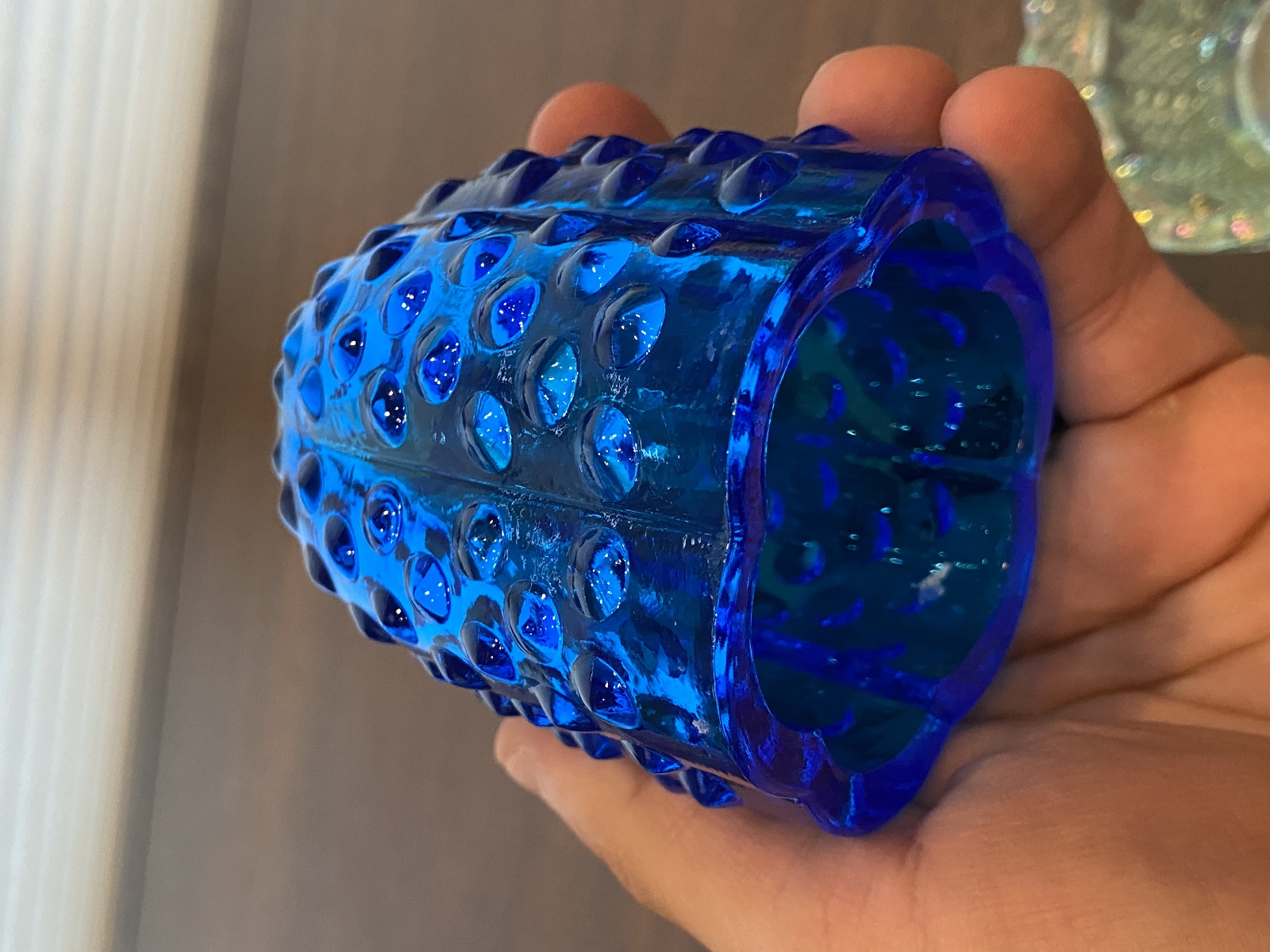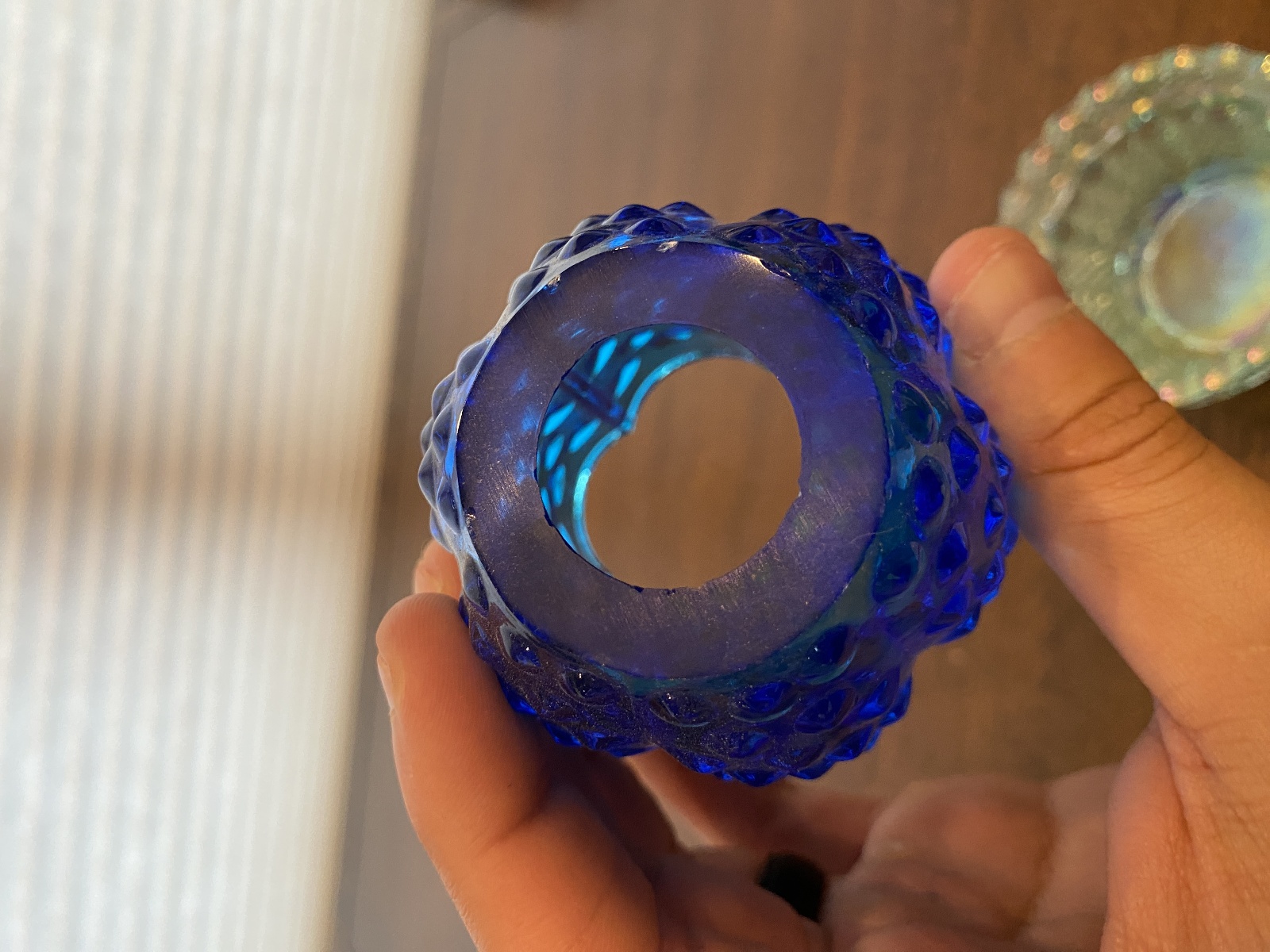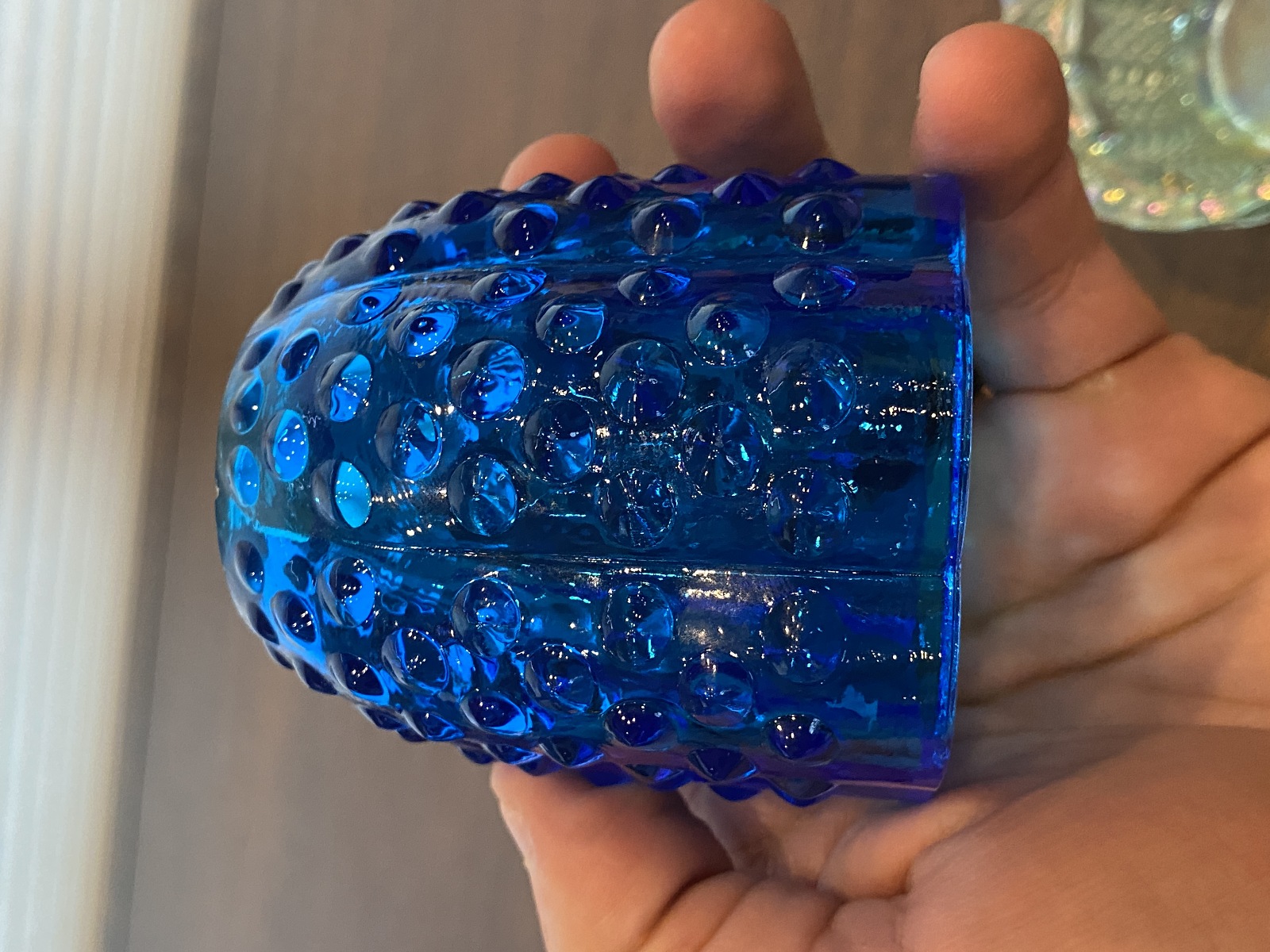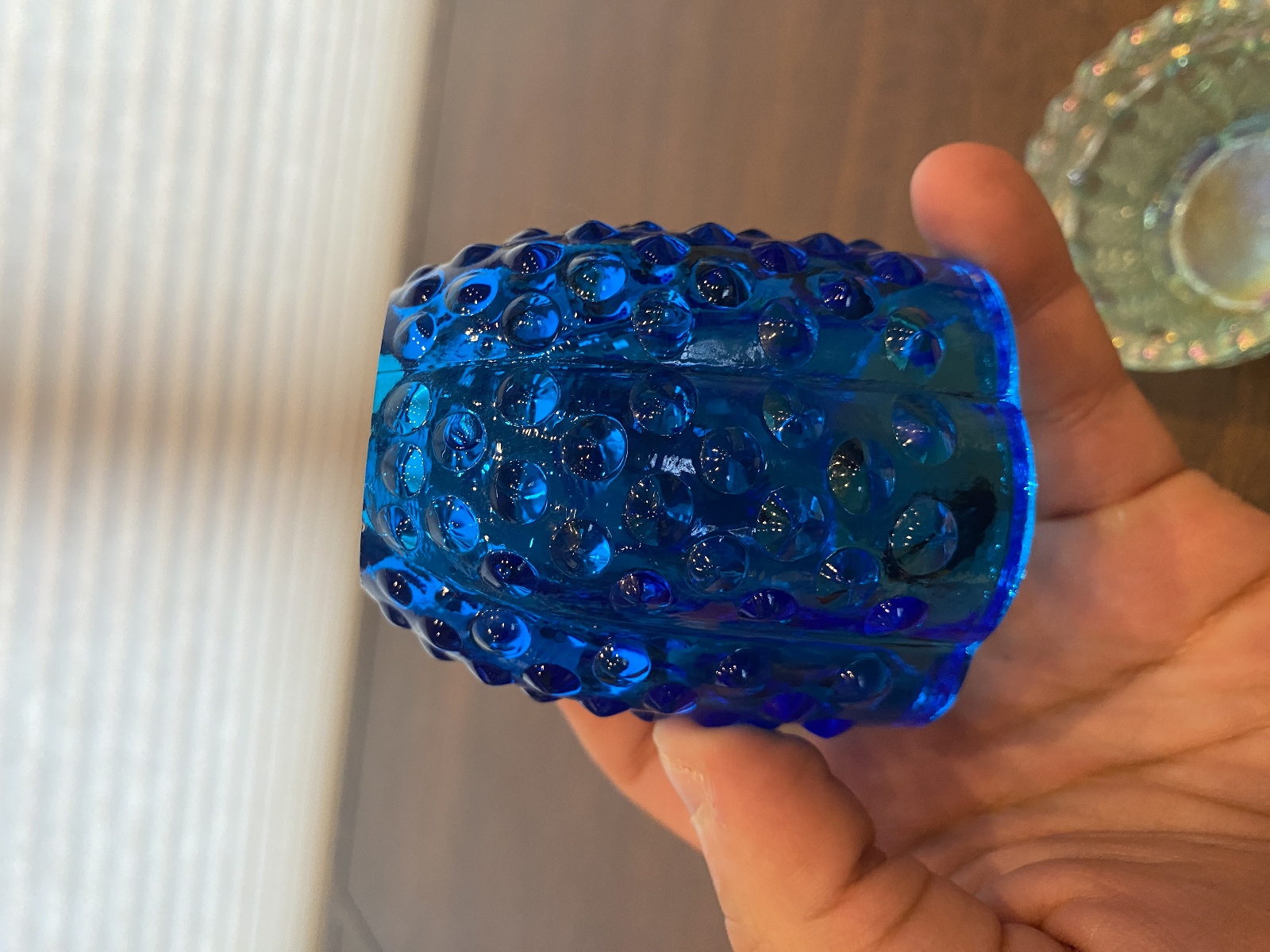 VTG FENTON Blue Top/Iridescent Base Glass Hobnail Fairy Lamp Candle Holder 4.25"