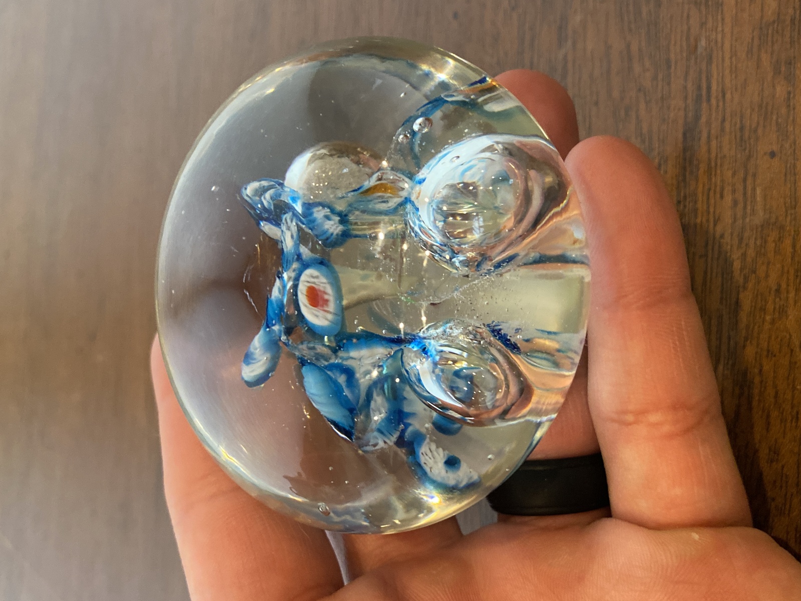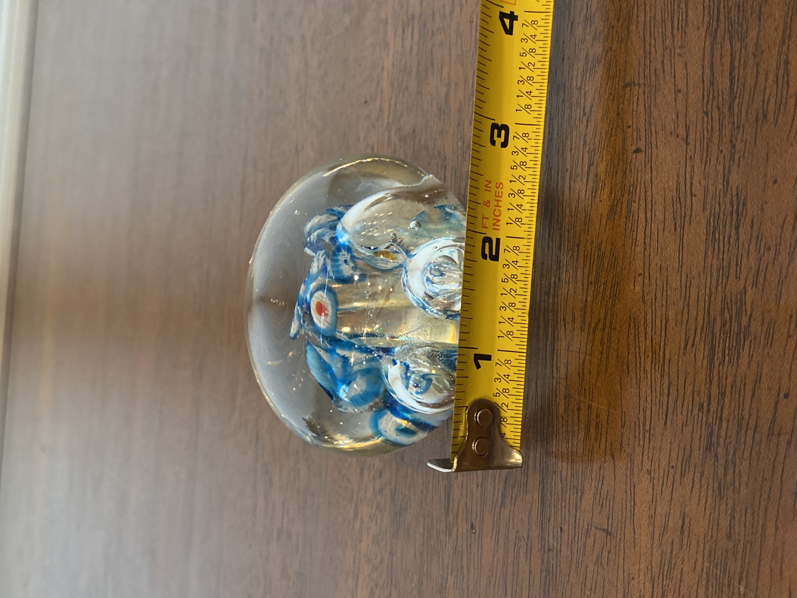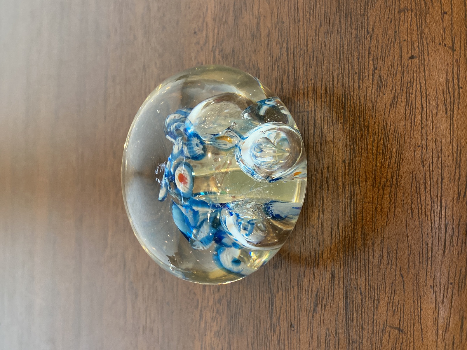 Blue, White & Red Multicolored Millefiori/Flower Art Glass Paperweight 1.75"H
