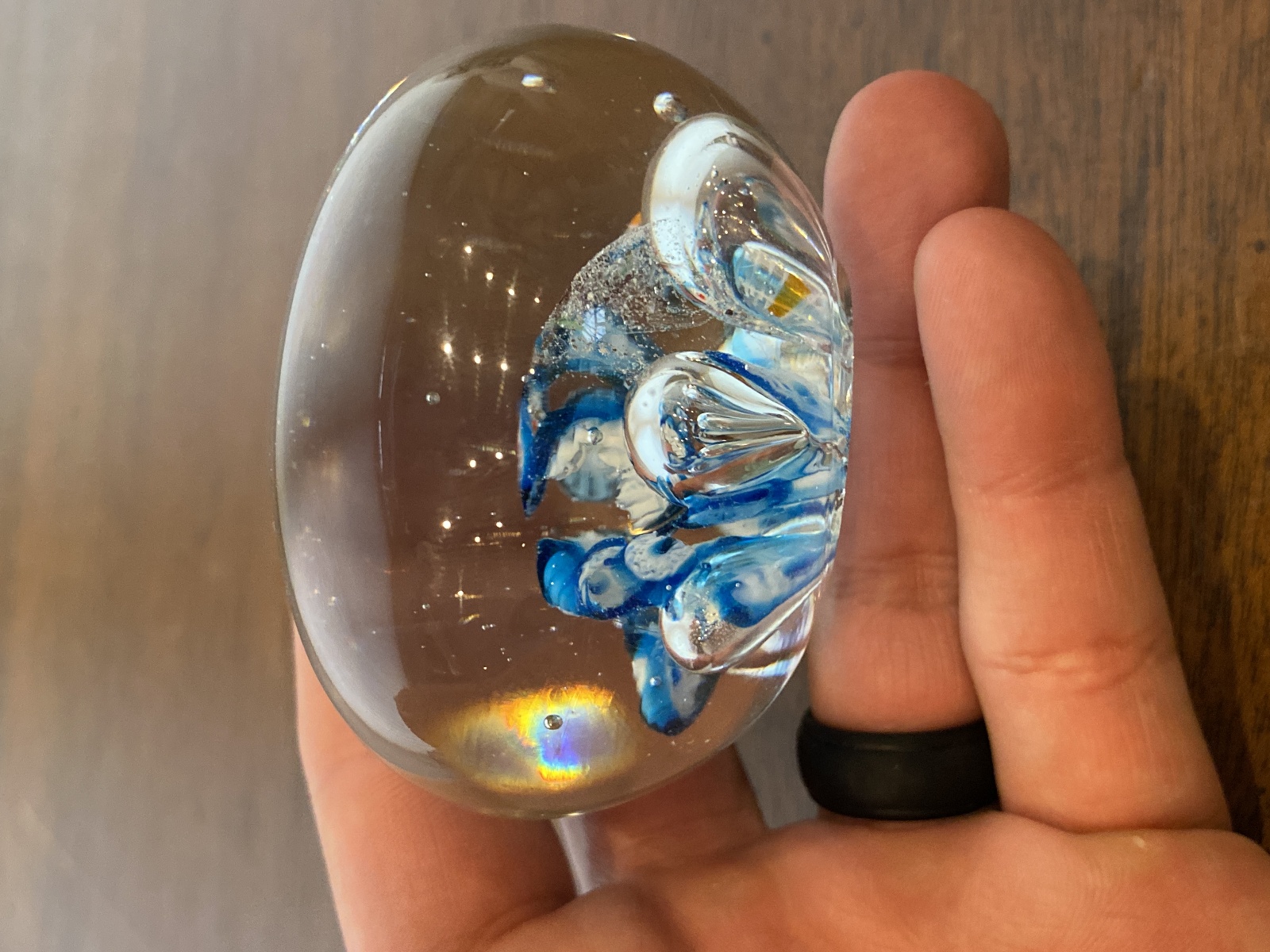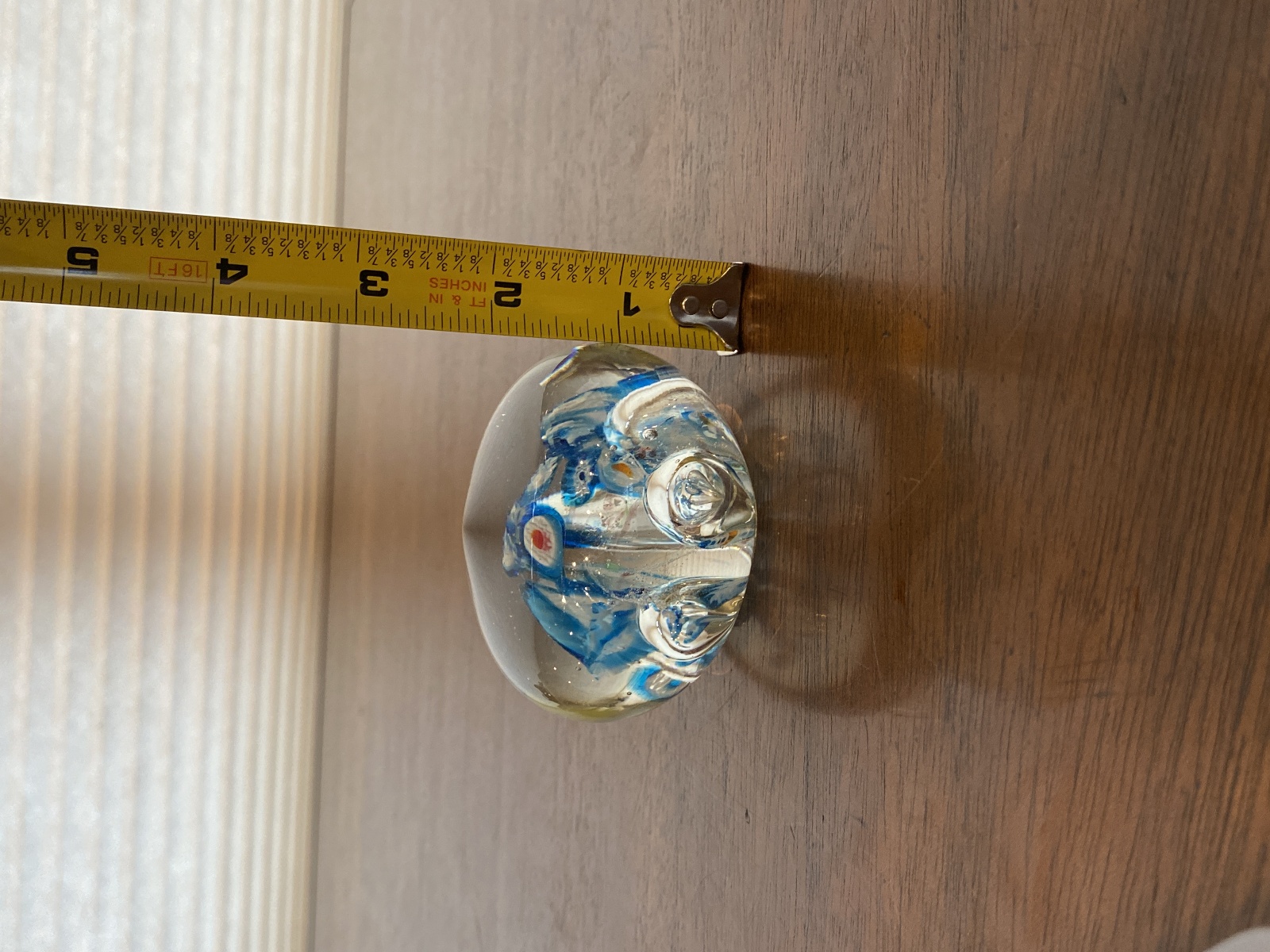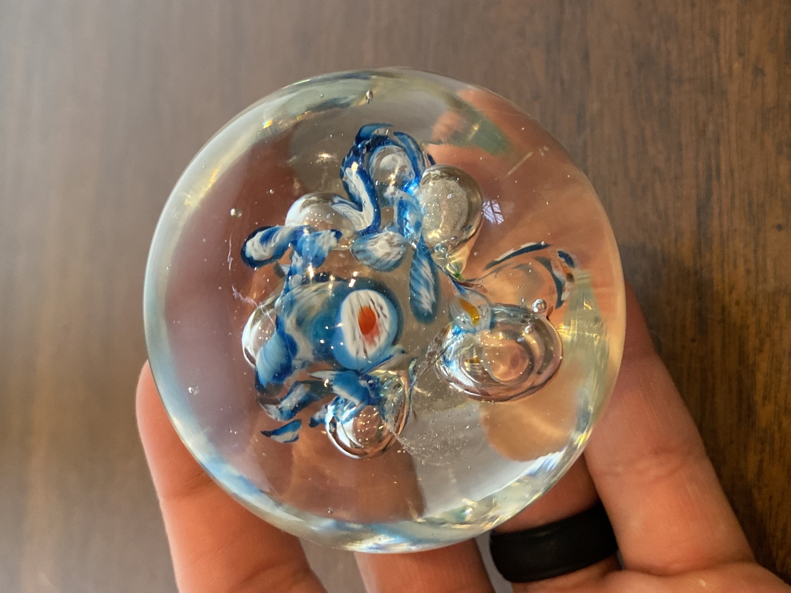 Blue, White & Red Multicolored Millefiori/Flower Art Glass Paperweight 1.75"H