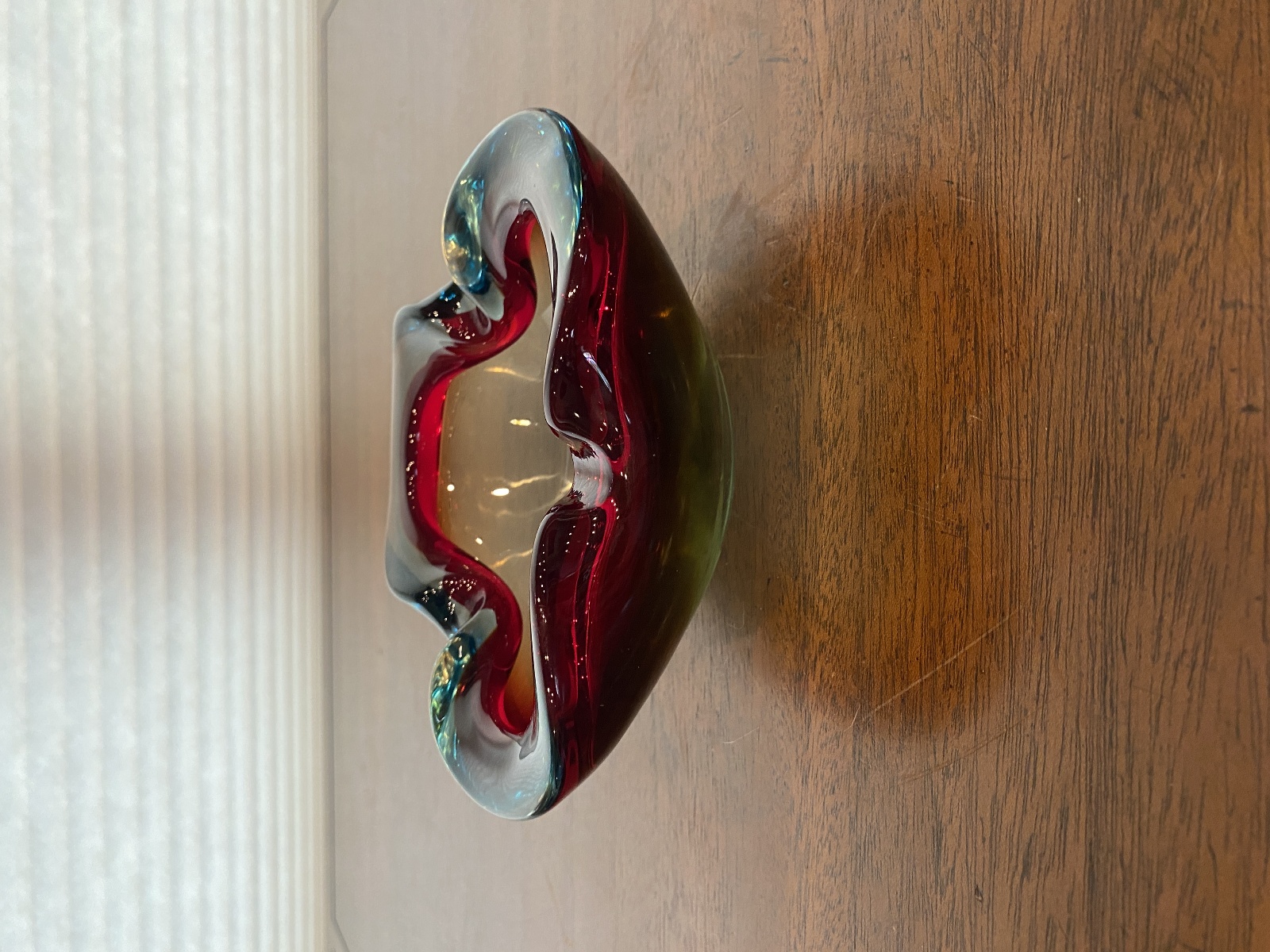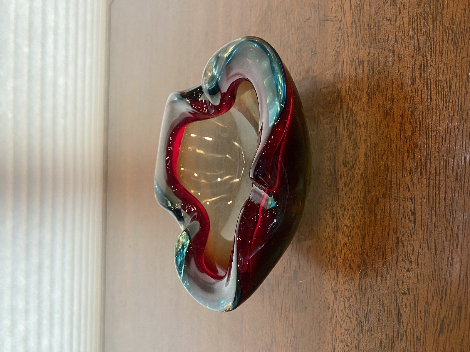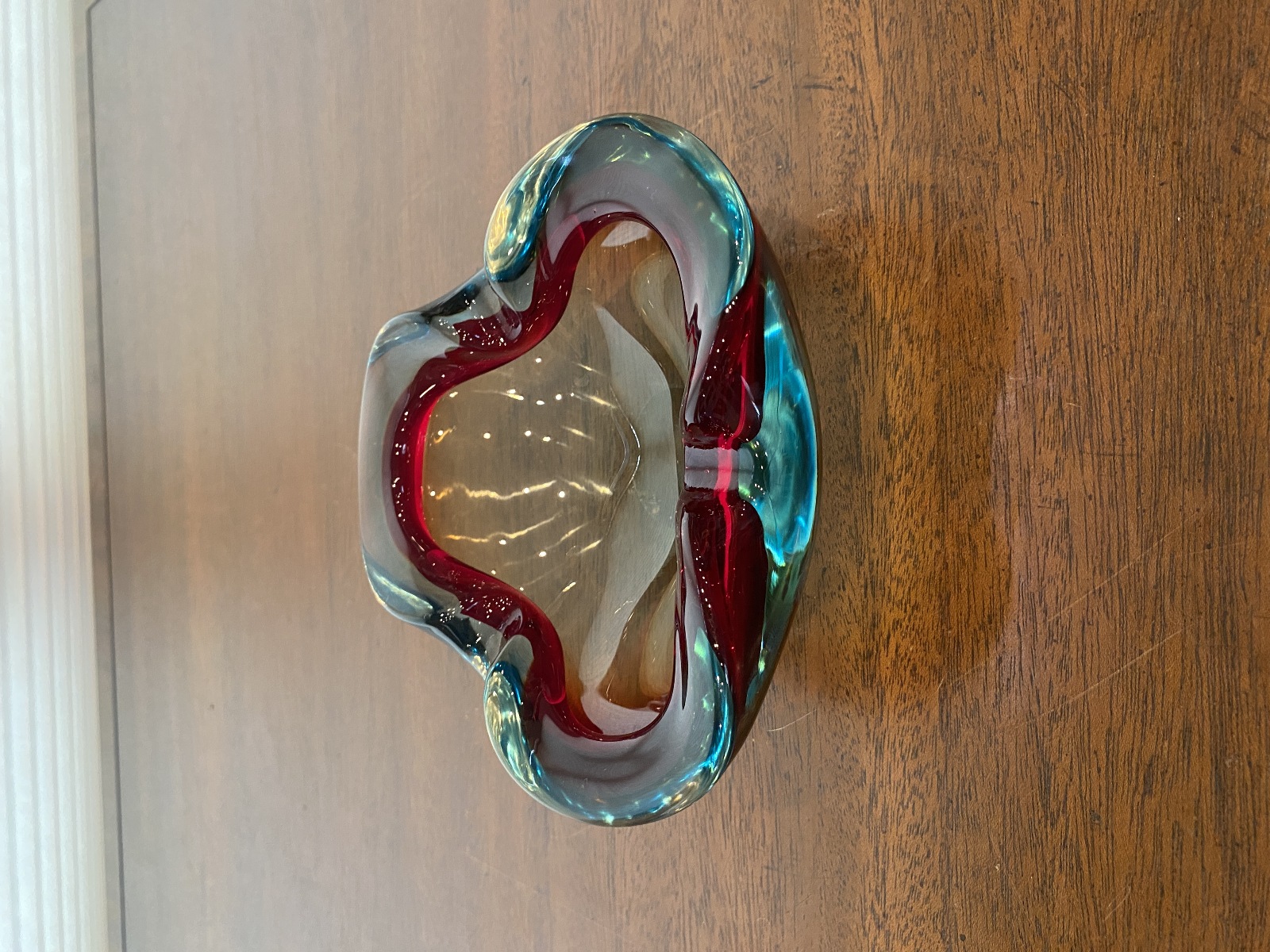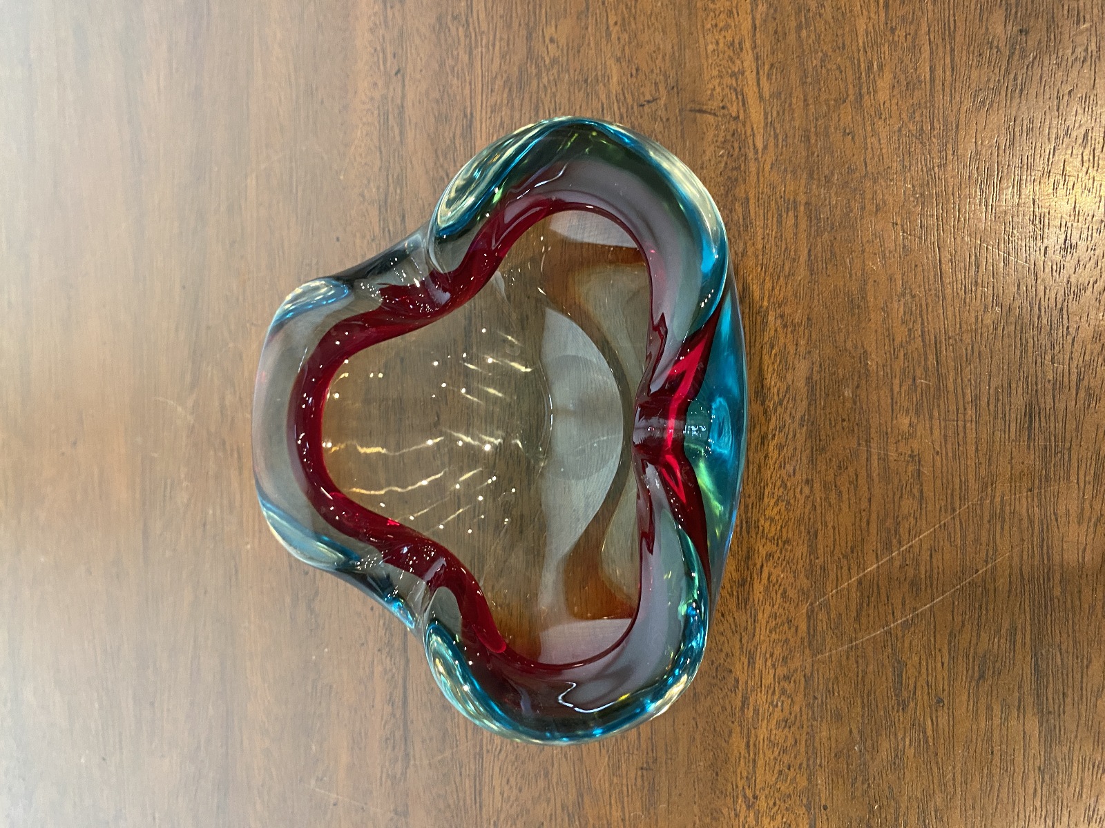 VTG MURANO Turquoise & Red Sommerso Art Glass Ashtray Bowl 6.5"L ITALY