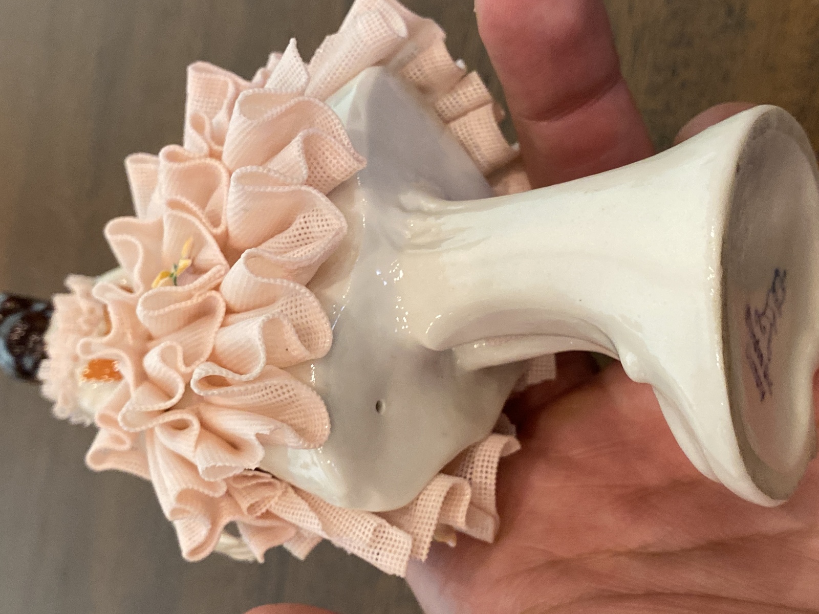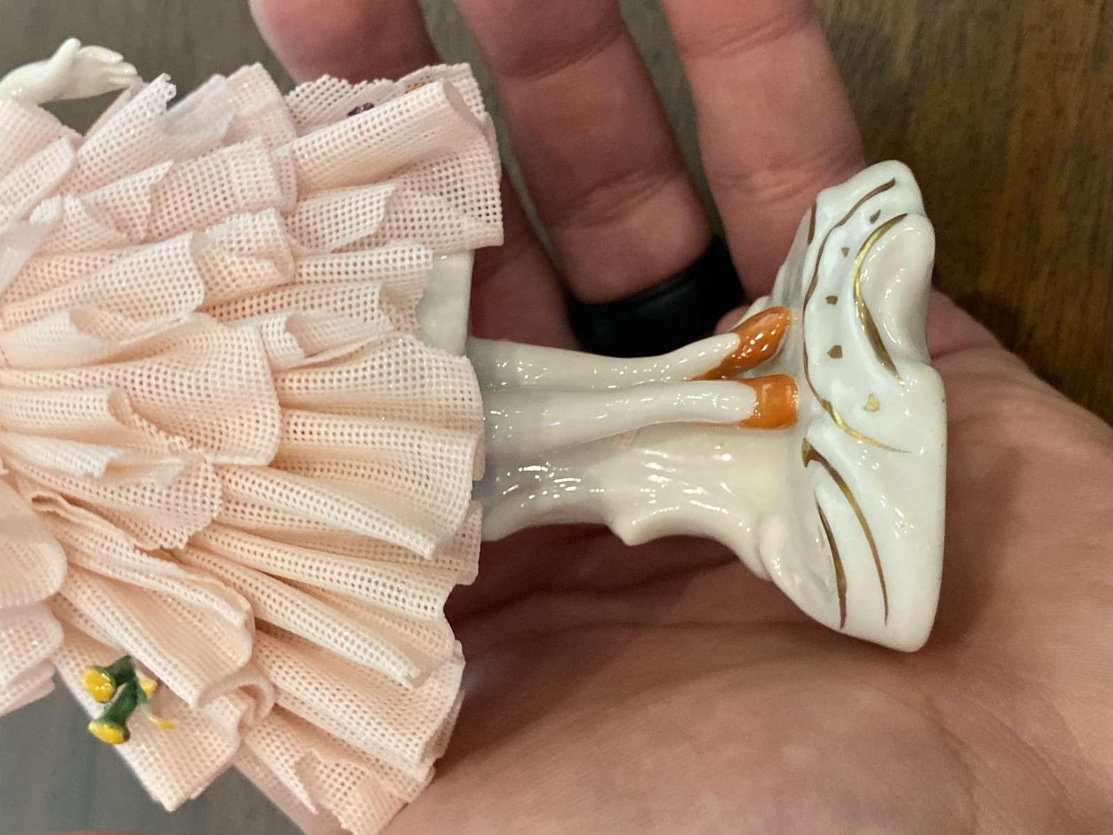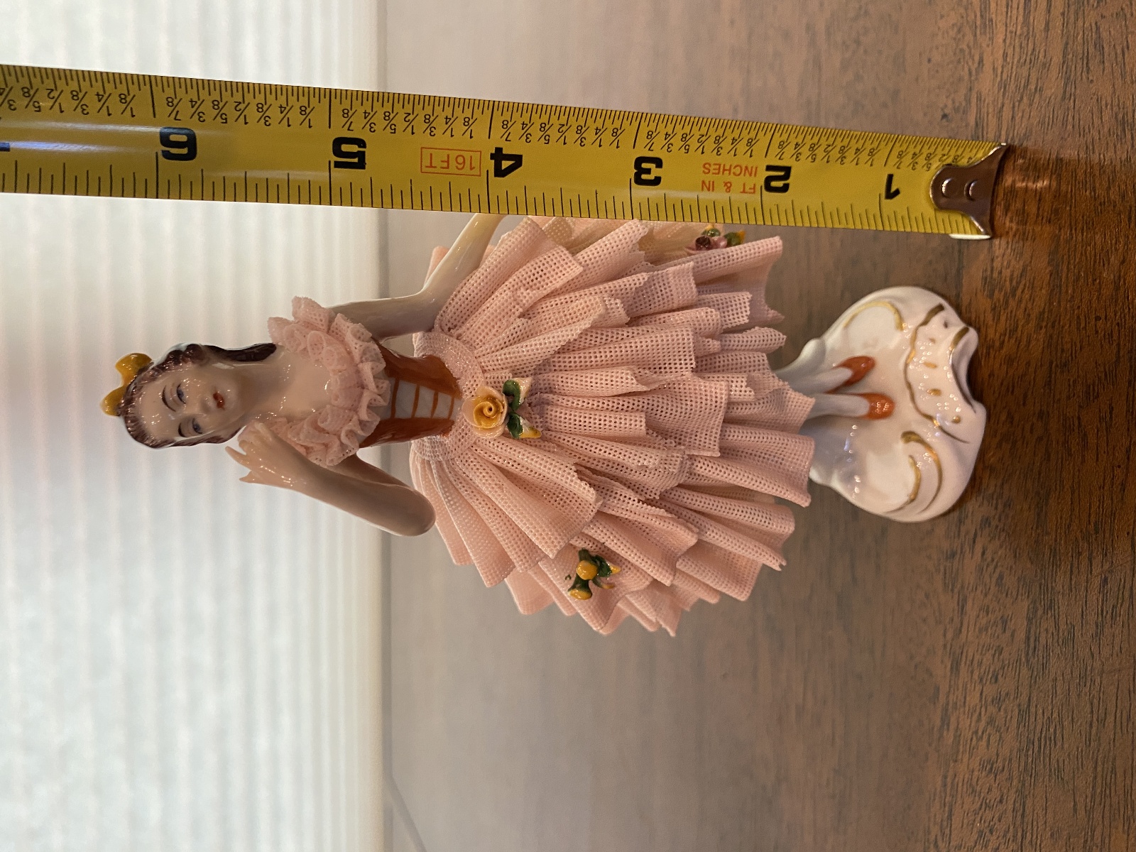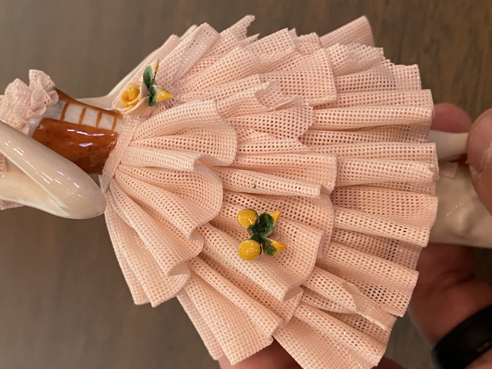 FAIR/DAMAGED used condition (PLEASE NOTE THERE IS SOME DAMAGE TO THE DRESS, NOTED IN THE PHOTOS, Also light scratching from its many years of love(age) and some minor wear to the dress as well as more severe damage to the dress(very common for these pieces) but overall still in good display shape for its age). (Please refer back to the photos for condition and feel free to message me if you have any questions. Thank you)!