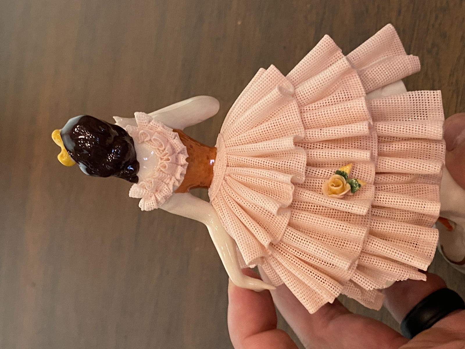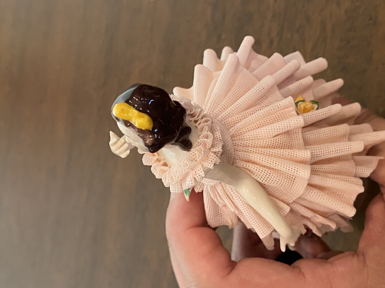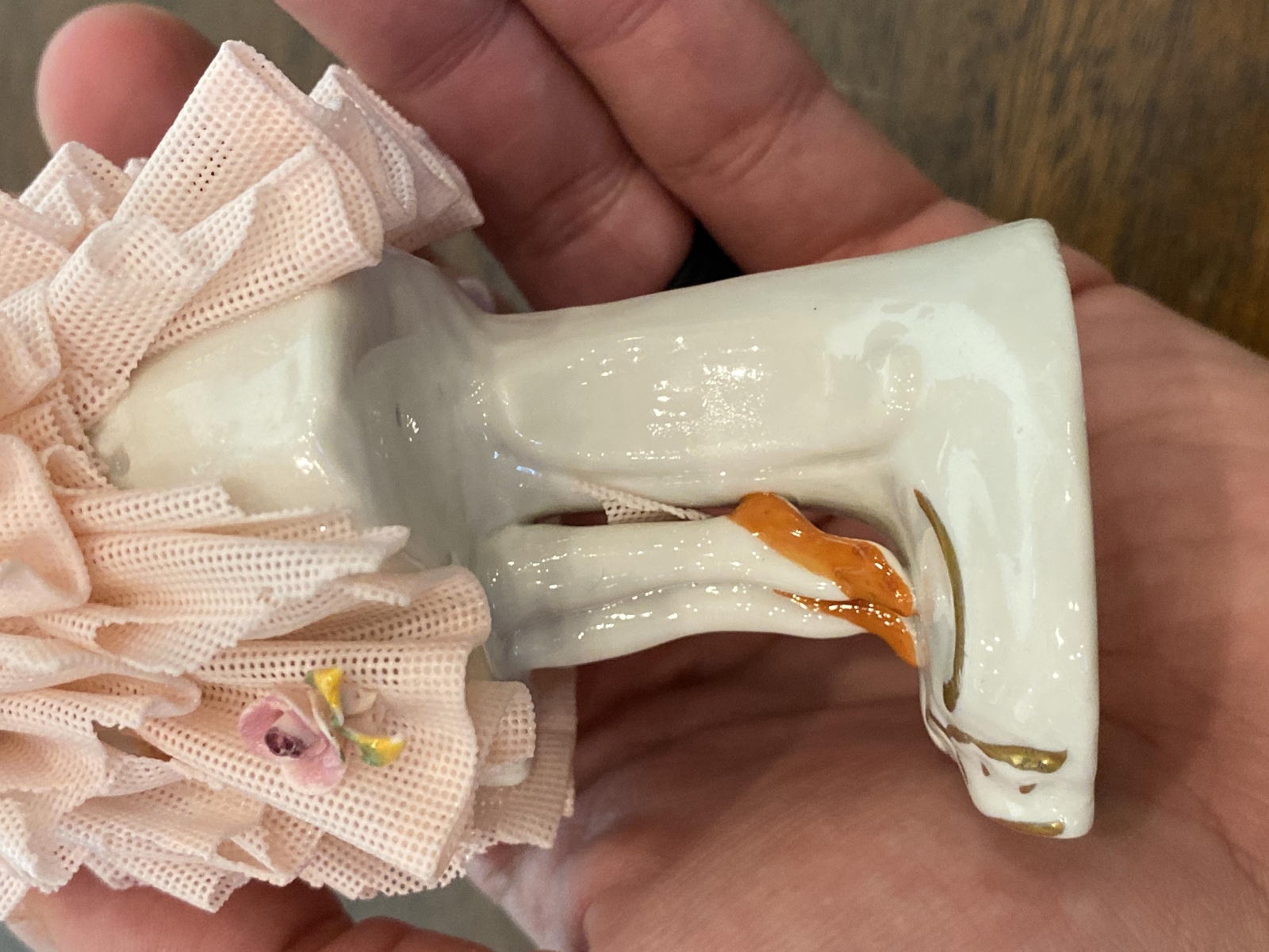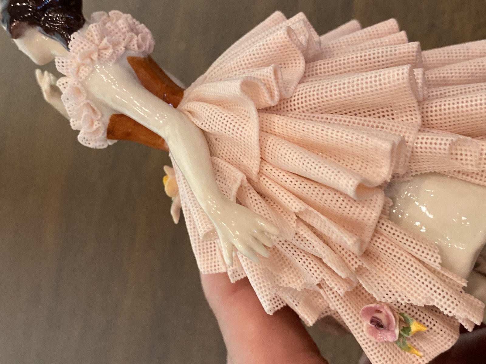 FAIR/DAMAGED used condition (PLEASE NOTE THERE IS SOME DAMAGE TO THE DRESS, NOTED IN THE PHOTOS, Also light scratching from its many years of love(age) and some minor wear to the dress as well as more severe damage to the dress(very common for these pieces) but overall still in good display shape for its age). (Please refer back to the photos for condition and feel free to message me if you have any questions. Thank you)!
