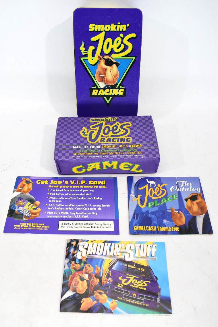 Complete 1994 Camel Smokin' Joe's Racing Tin Match Box 50 Matchbooks & Inserts 2.25"x7.25"x4" Tin contains sealed pack of 50 matchbooks, V.I.P. Card mailer, Joe's Place catalog Vol. 5, and Smokin' Stuff fold out brochure. No dents or scratches to tin. See photos for details.