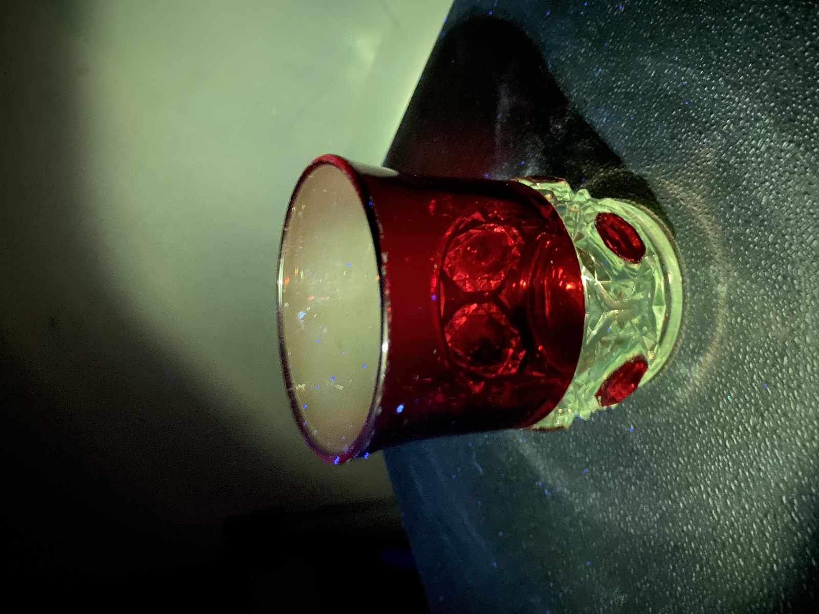 (Clear part of glass turns green when lit up with a 365nm frequency UV light)