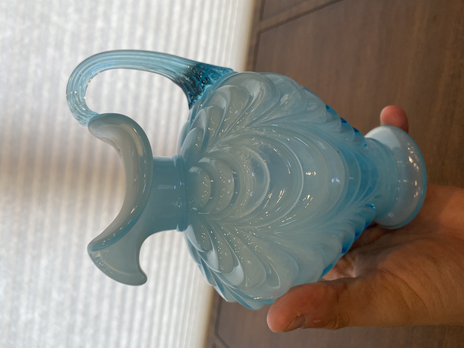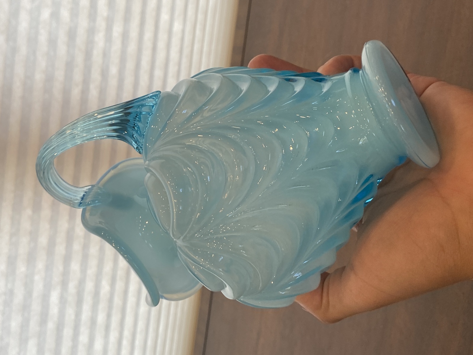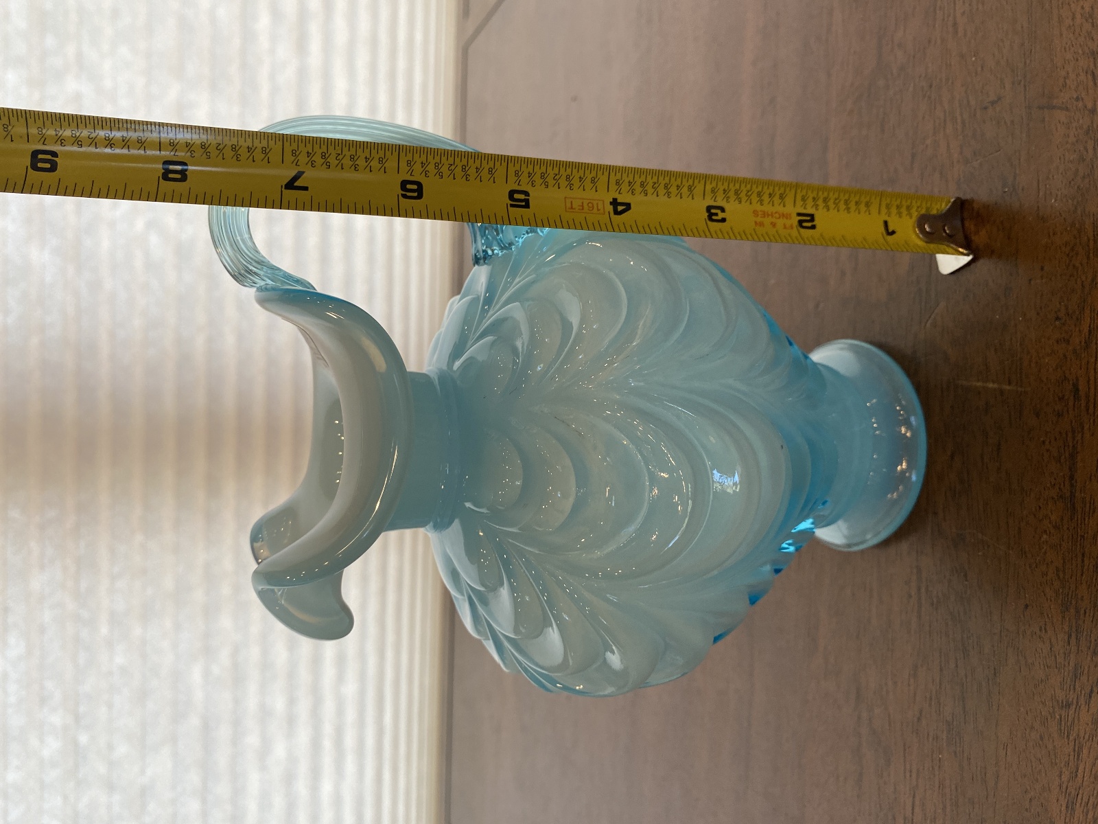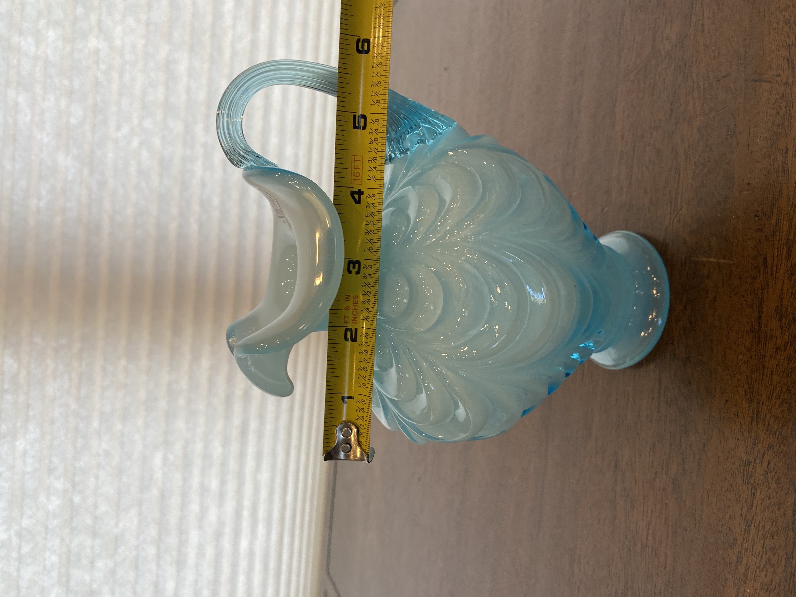 FENTON Light Blue On White Overlay DRAPERY Art Glass Pitcher W/LABEL 7.5"H