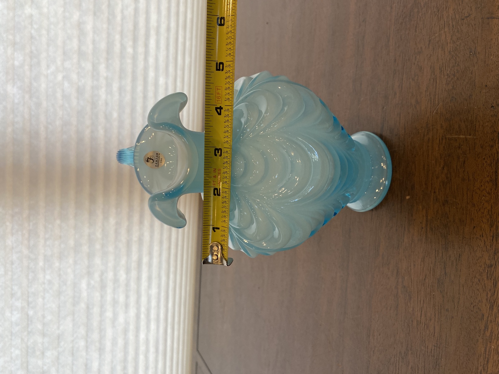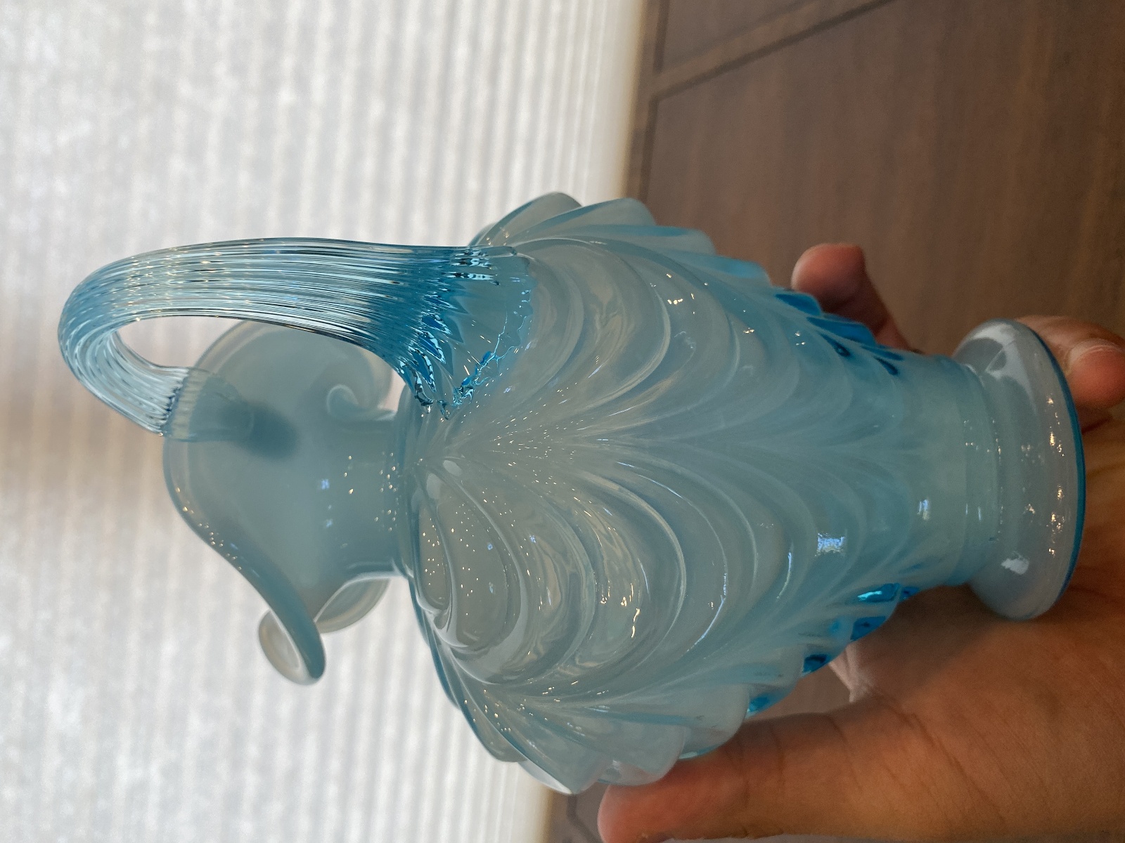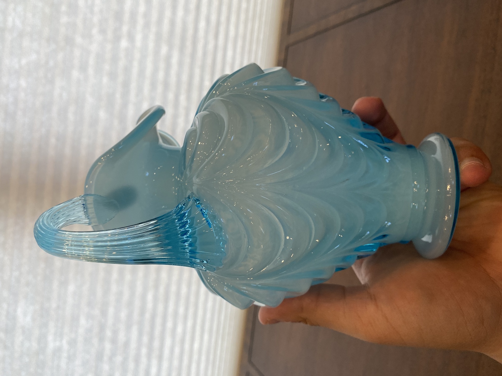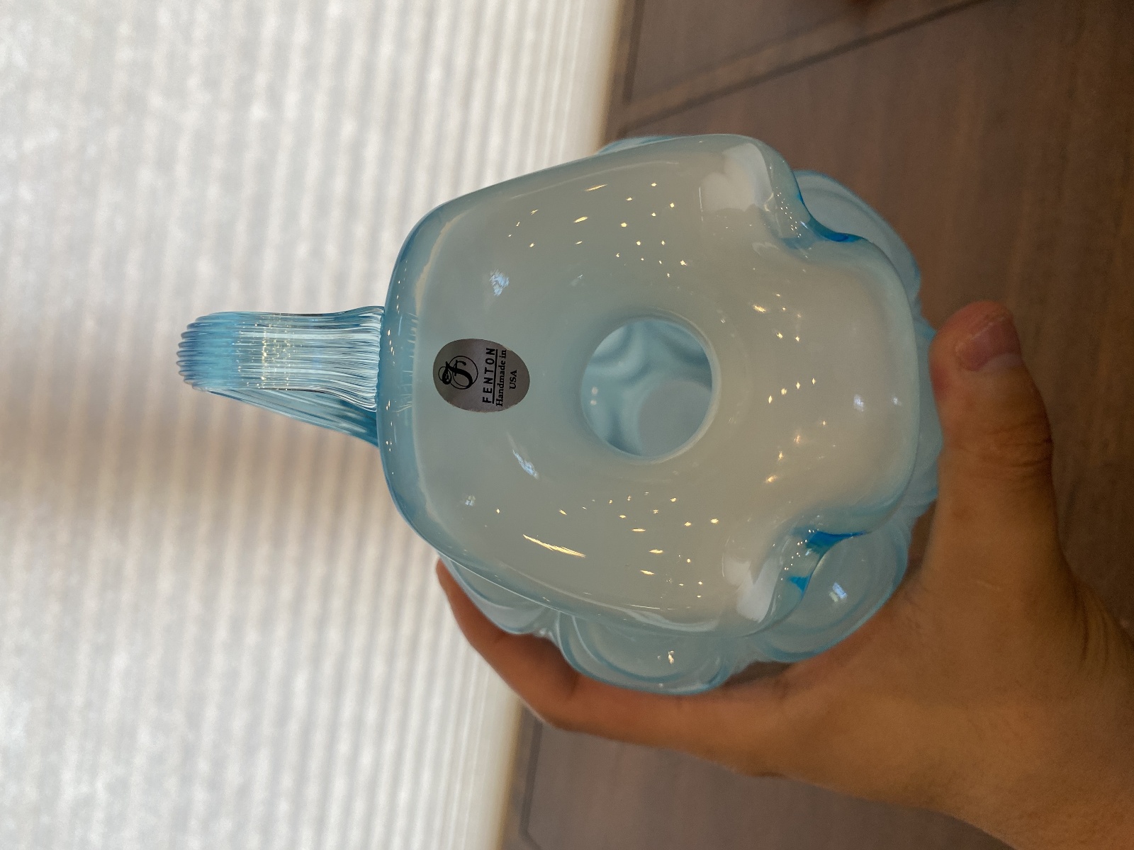 FENTON Light Blue On White Overlay DRAPERY Art Glass Pitcher W/LABEL 7.5"H