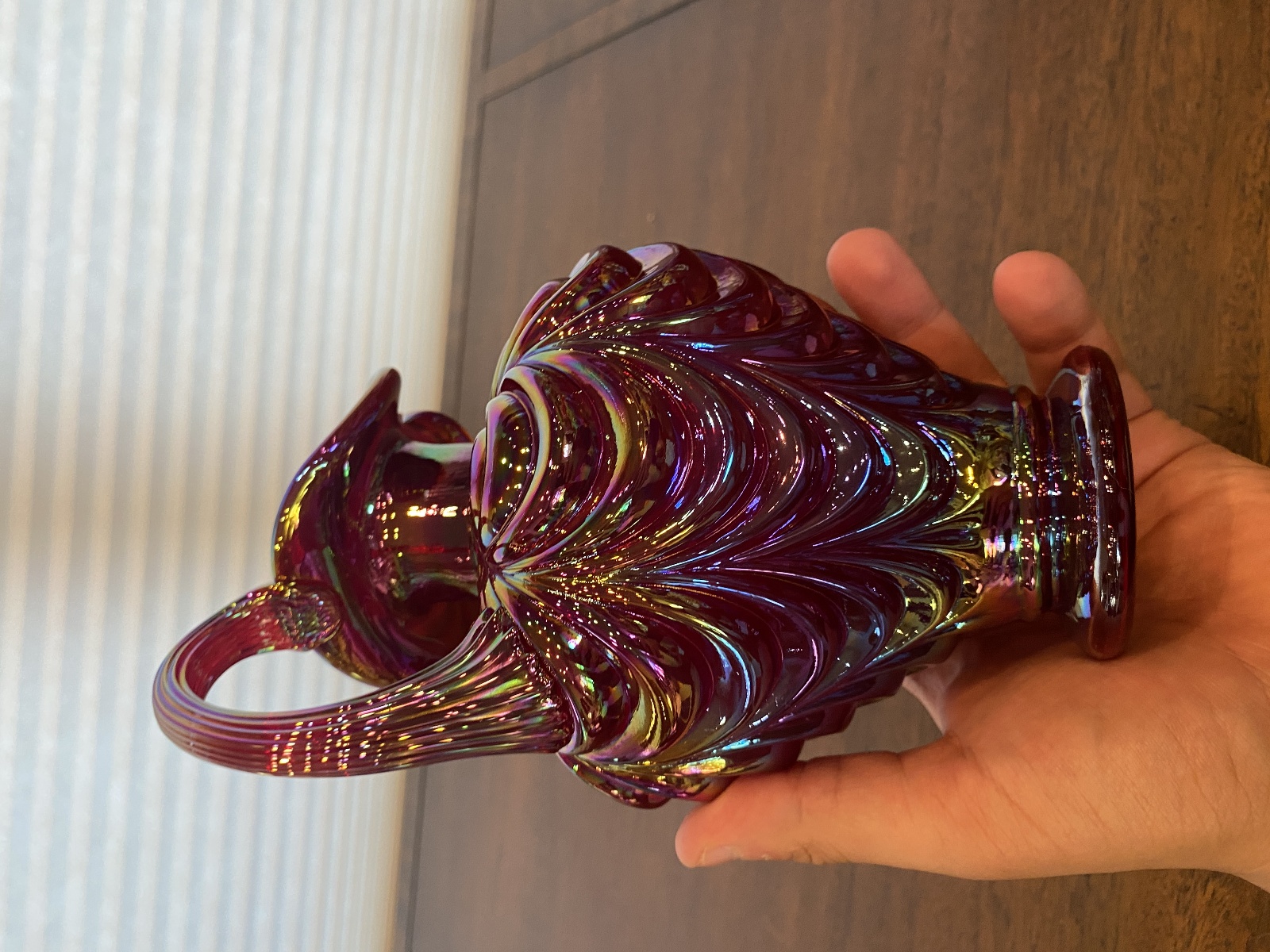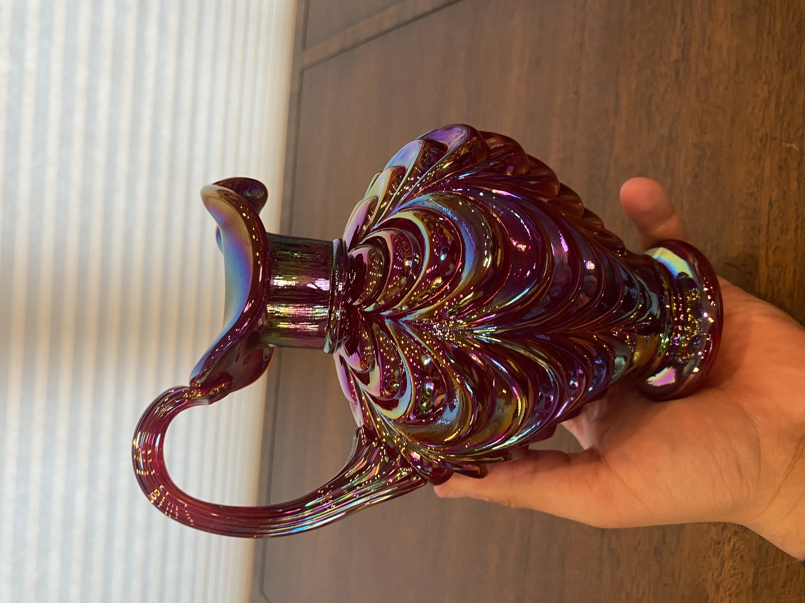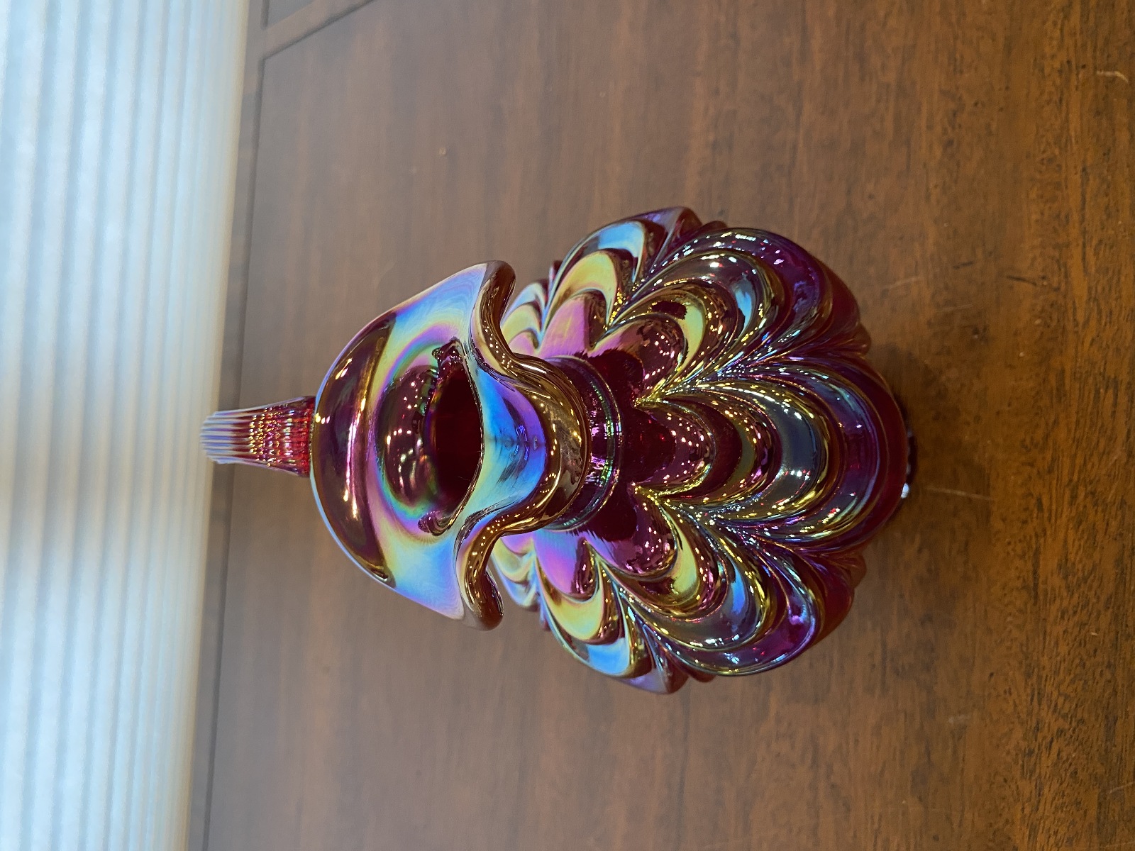 FENTON Red Iridescent DRAPERY Carnival Art Glass Pitcher 8"H
