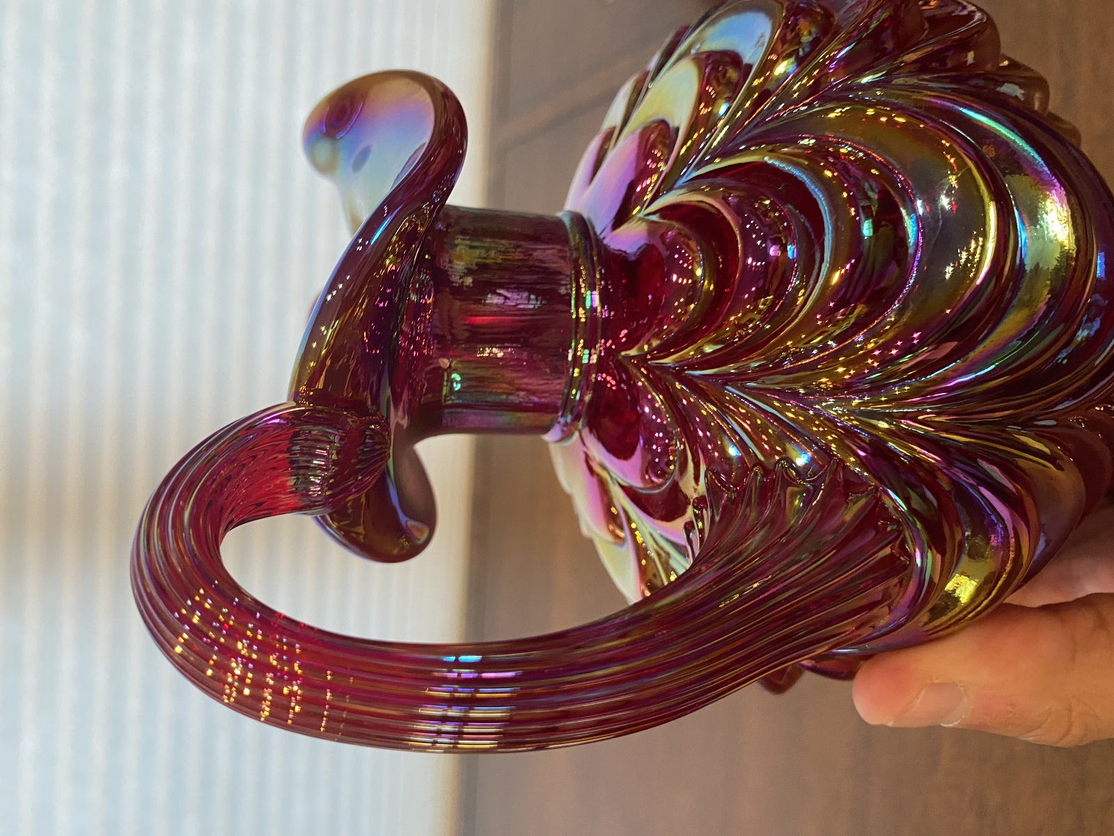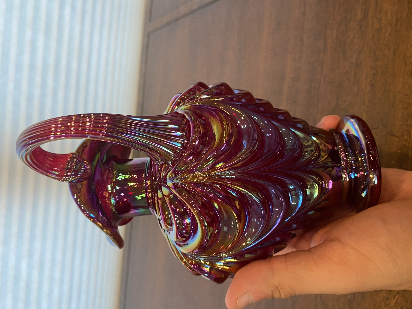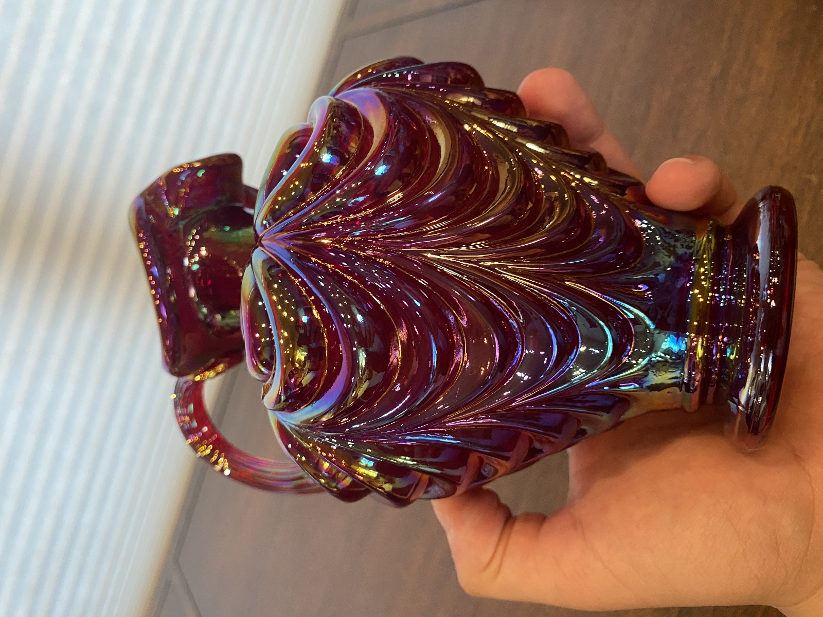FENTON Red Iridescent DRAPERY Carnival Art Glass Pitcher 8"H