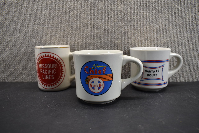 Vintage Missouri Pacific Lines Coffee Mug has a small black spot on mug and faint outline of coffee? mark below it, may come out with washing. The other two are blemish-free. See Photos For Details.