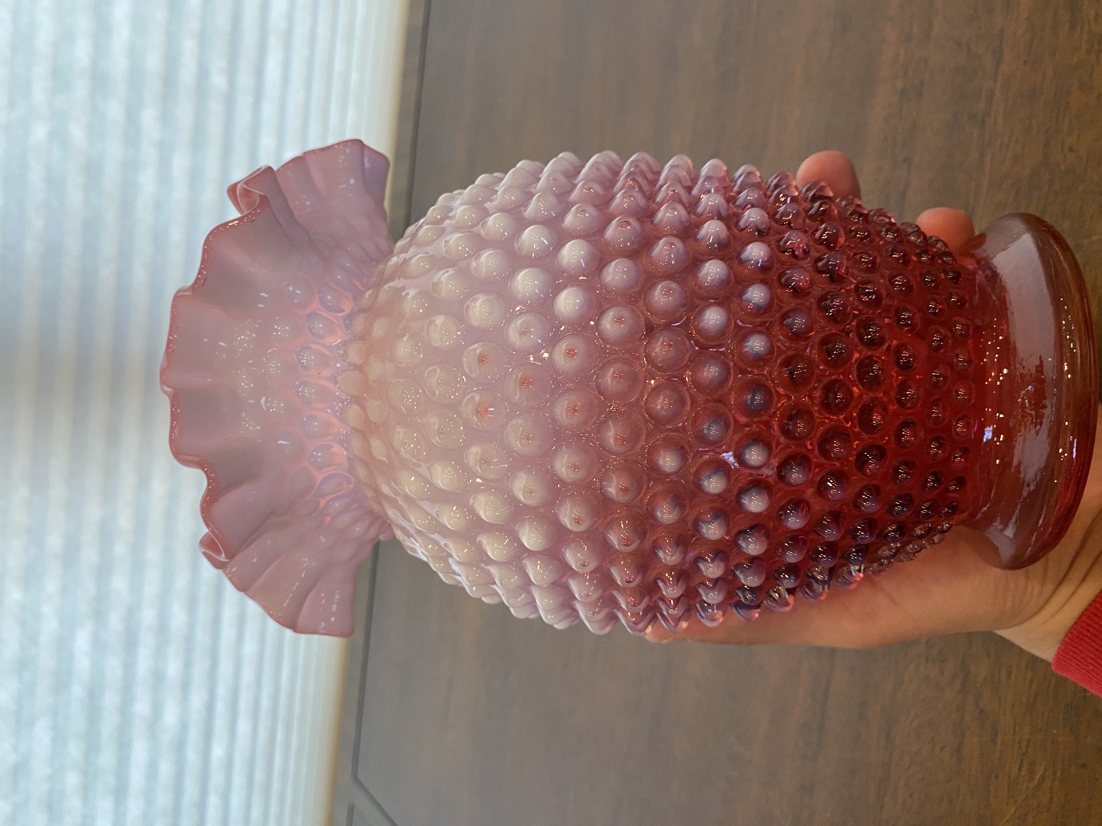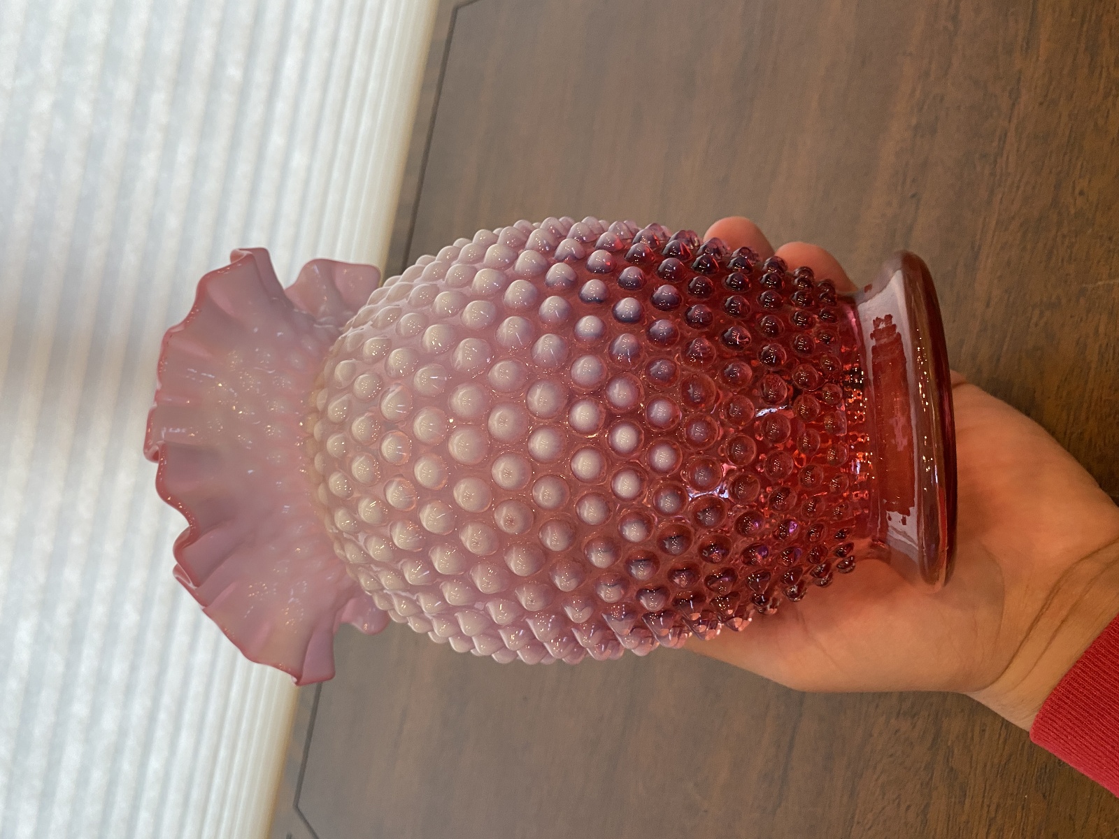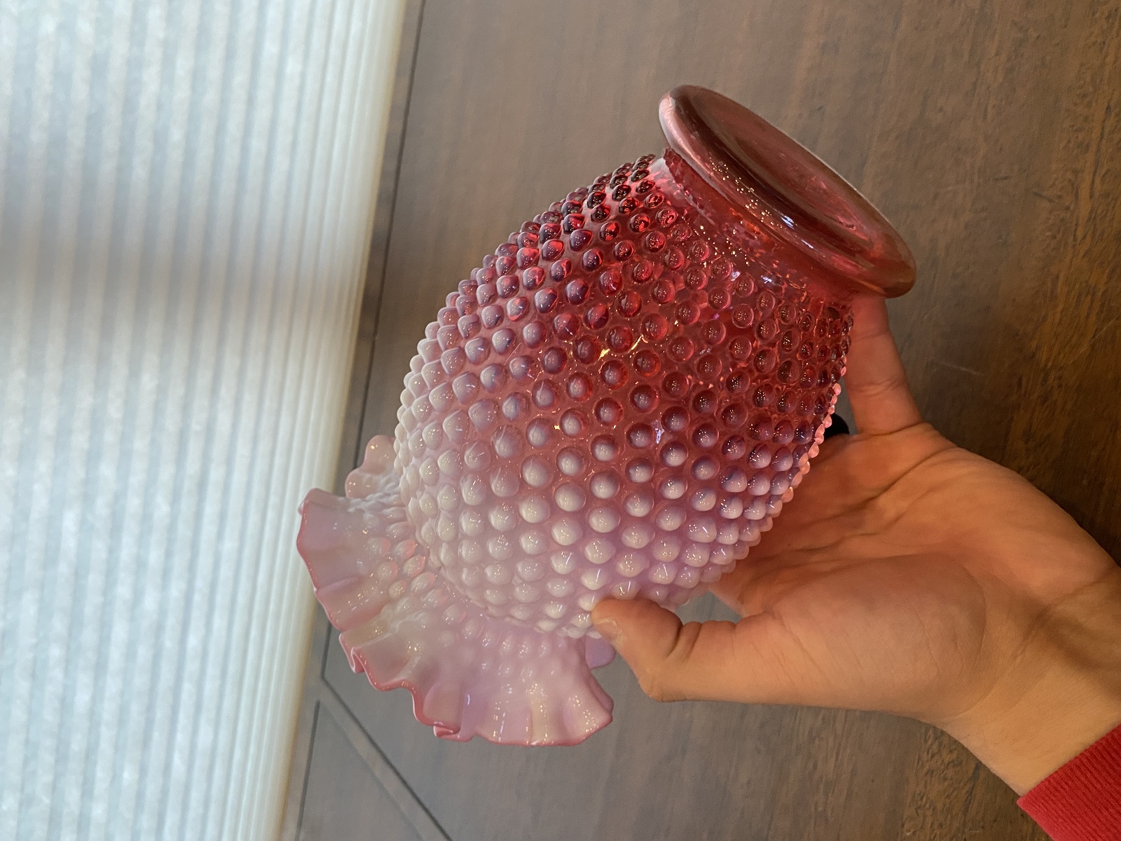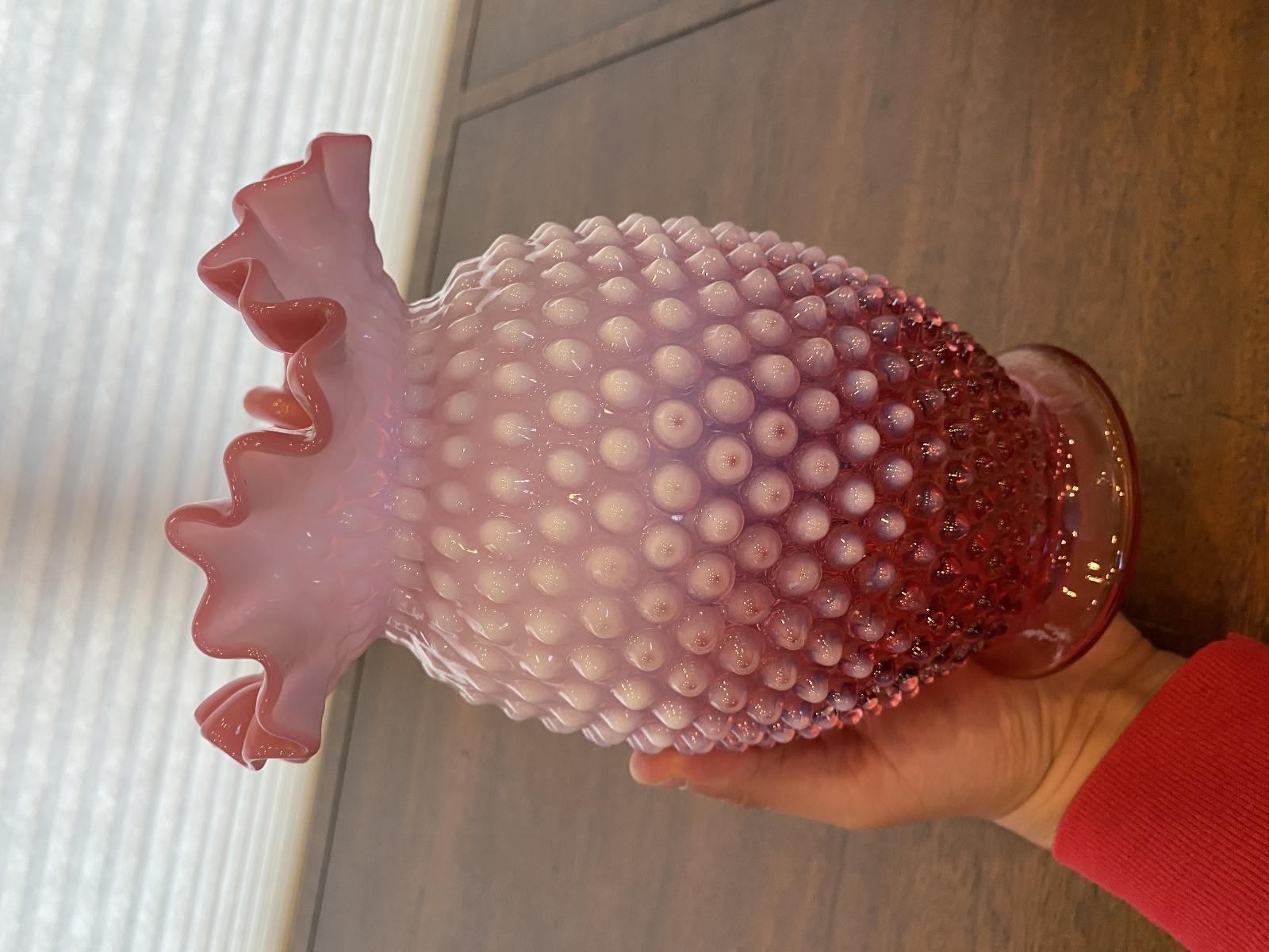 LARGE VTG FENTON Cranberry Opalescent Hobnail Ruffled Rim Art Glass Vase 8.5"H