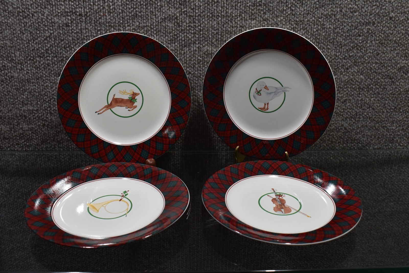 Includes; Stag, Horn, Violin, and Goose with Holly accent Salad Plate set. No chips, cracks, or scratches. Designed by Charles Roberts.