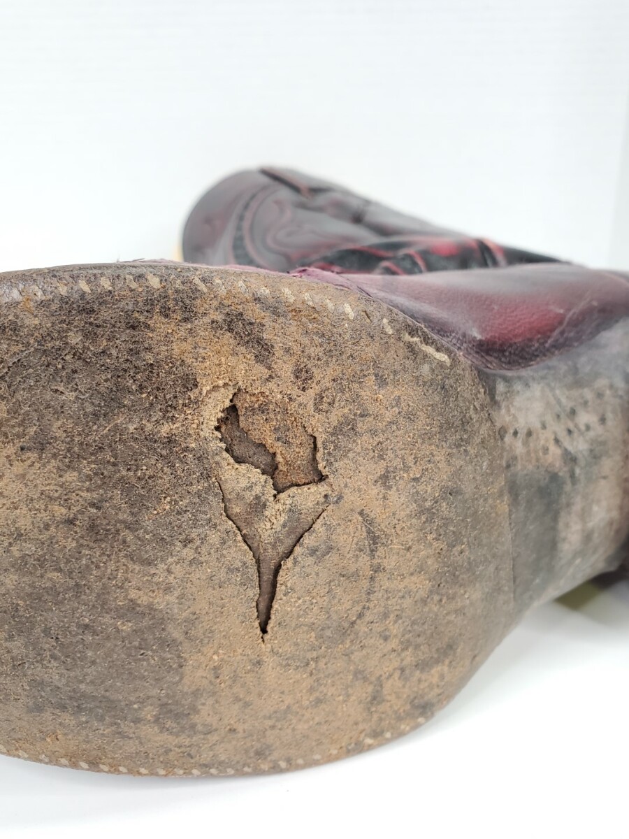 These burgandy boots have been well loved and show it! Includes original box and tags. There are holes in the soles, please see photos.