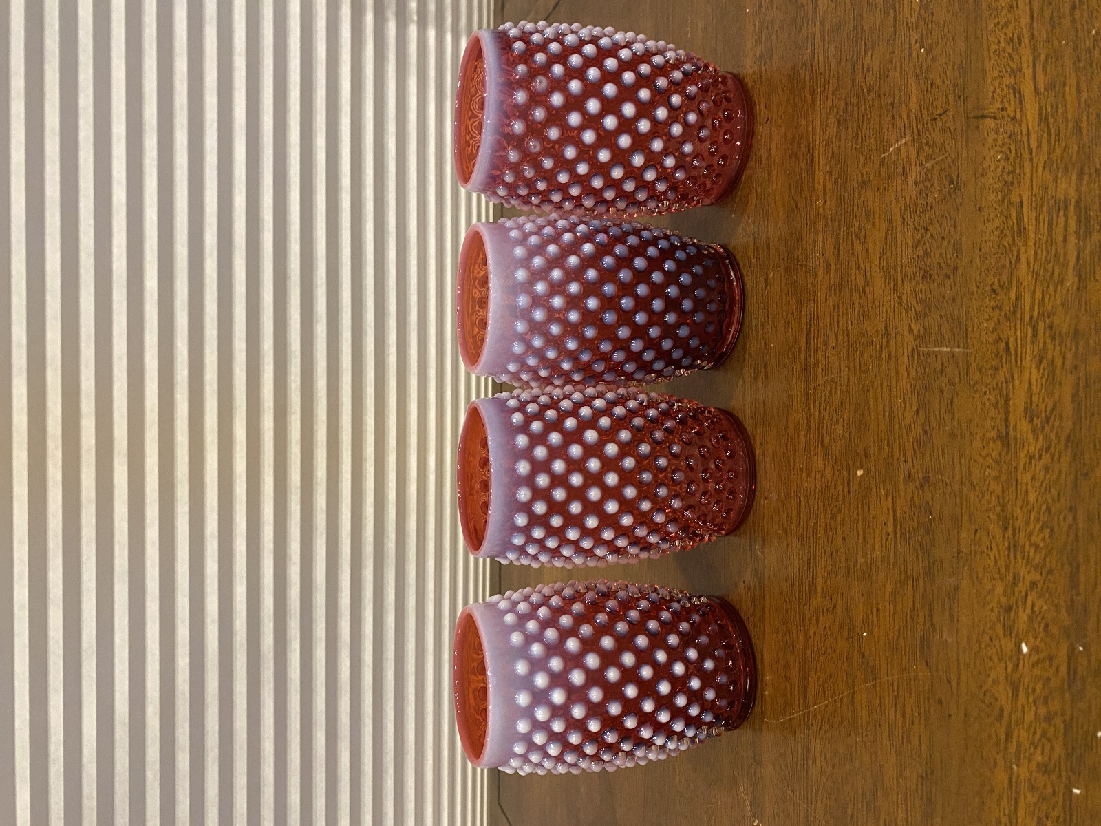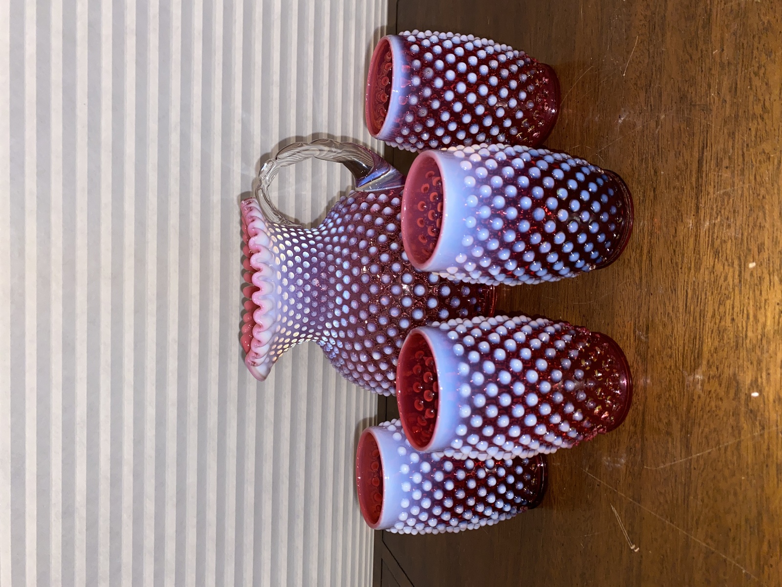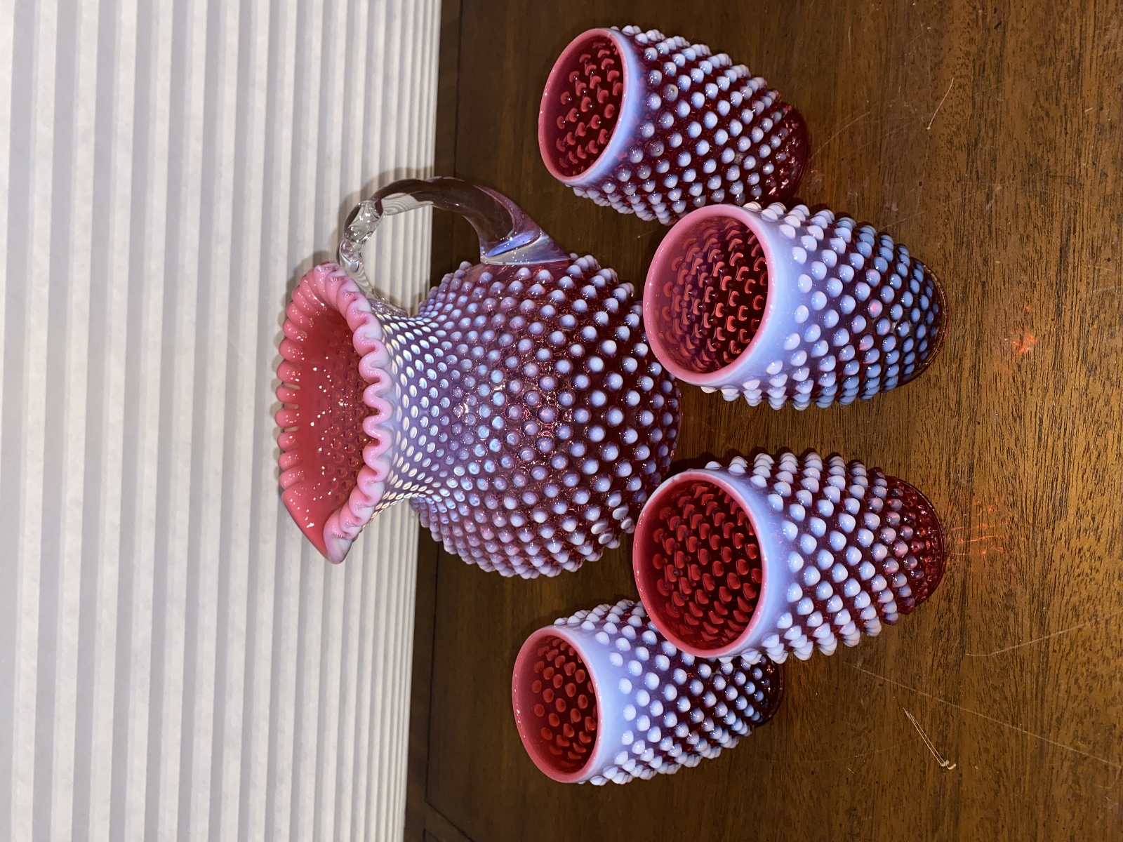 VTG FENTON Cranberry Opalescent Hobnail Glass Pitcher + 4 Tumblers SET(5)