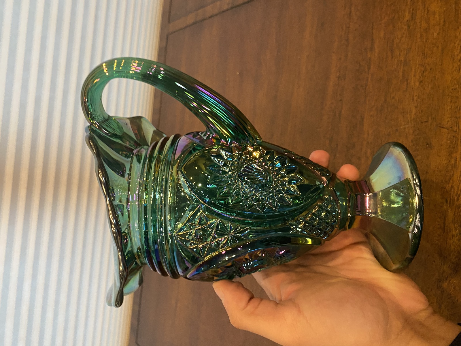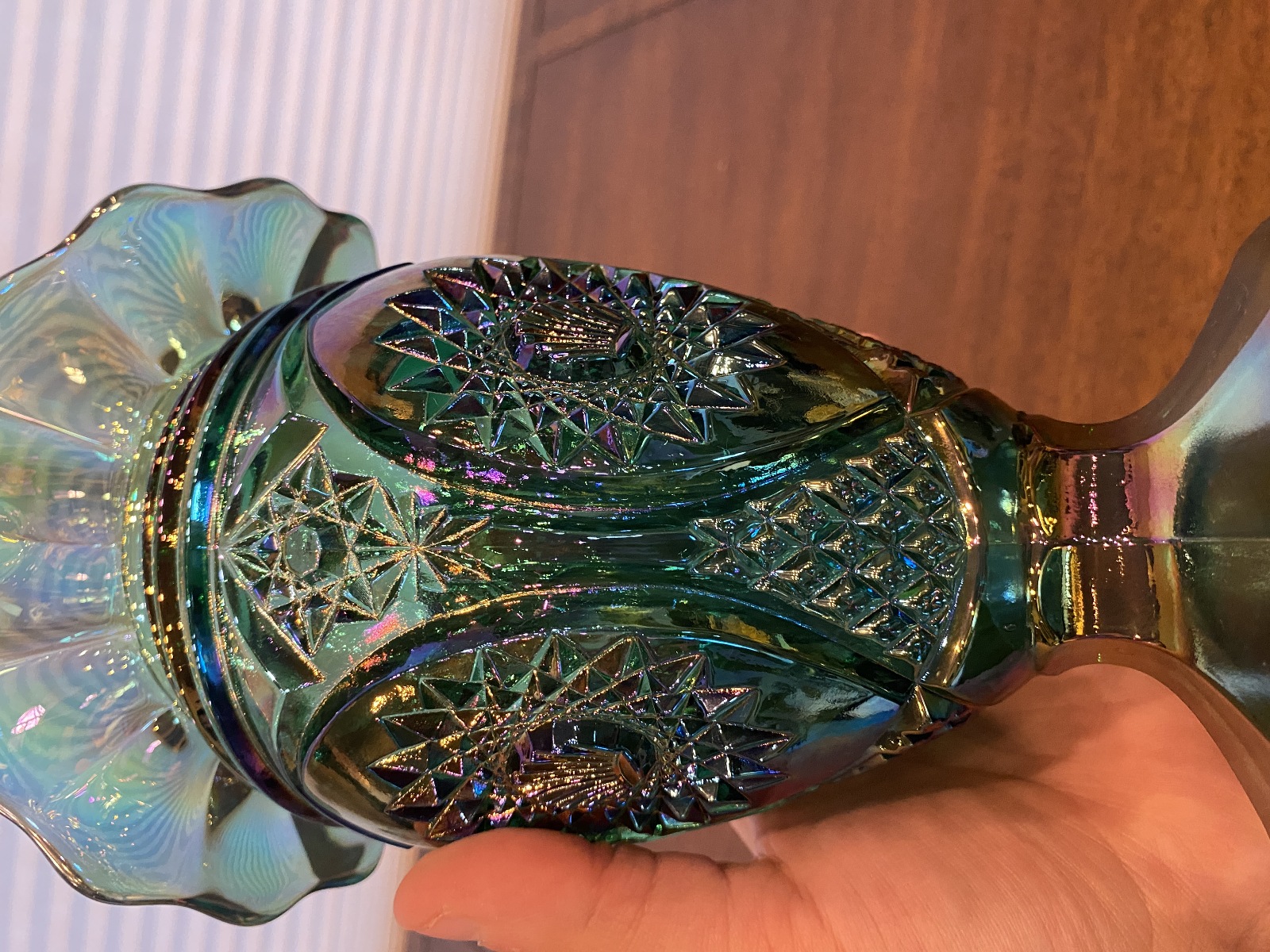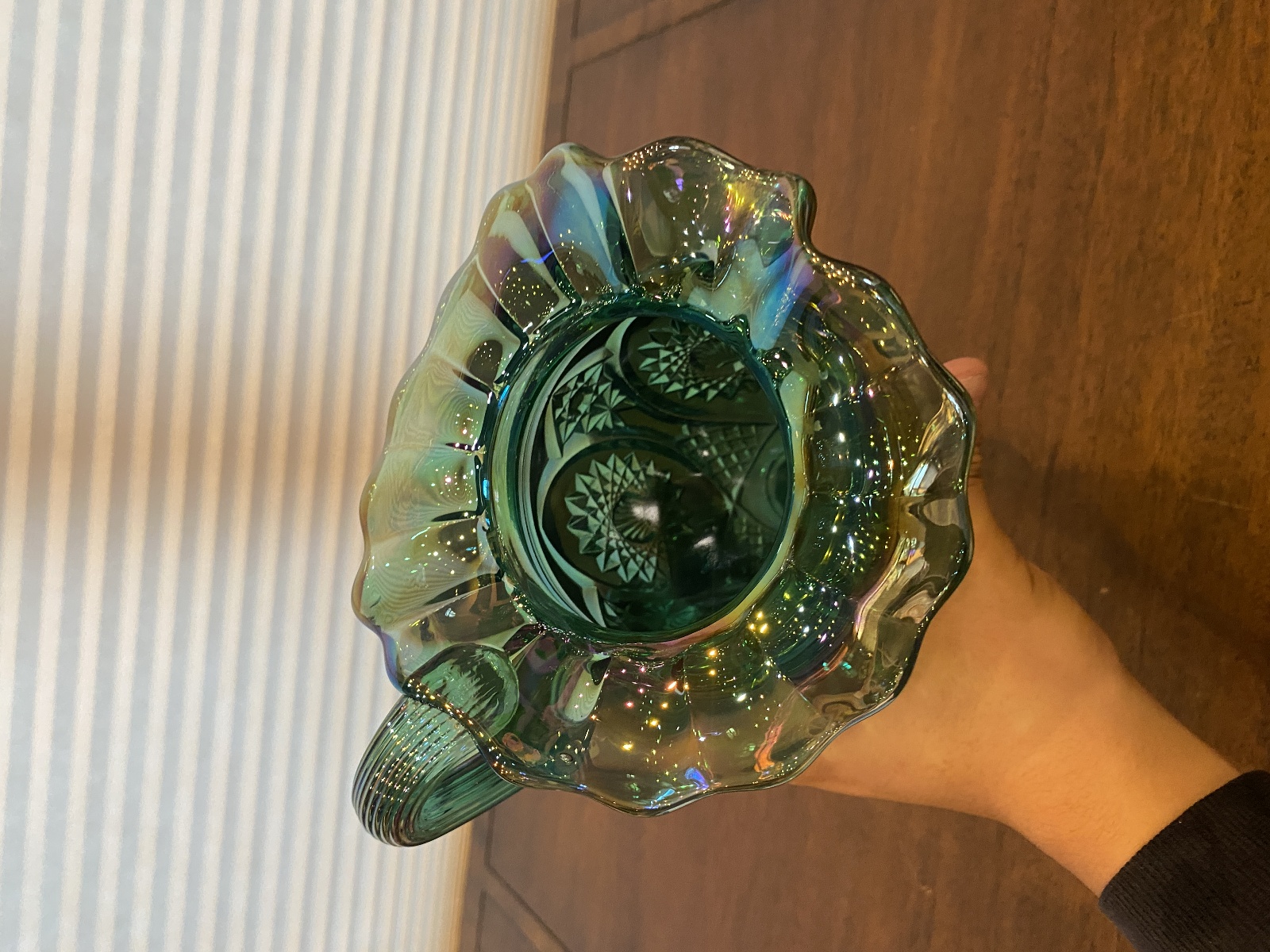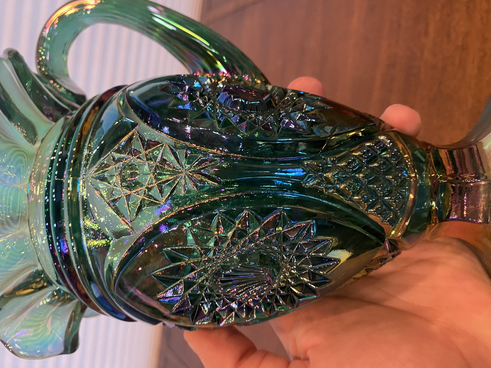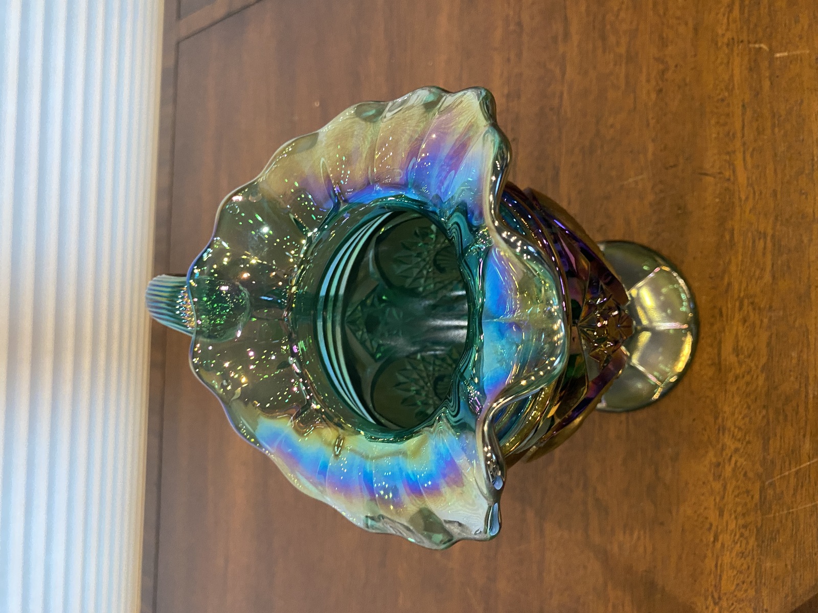VTG FENTON Teal/Green Iridescent Hobstar Carnival Glass Pitcher 9"H