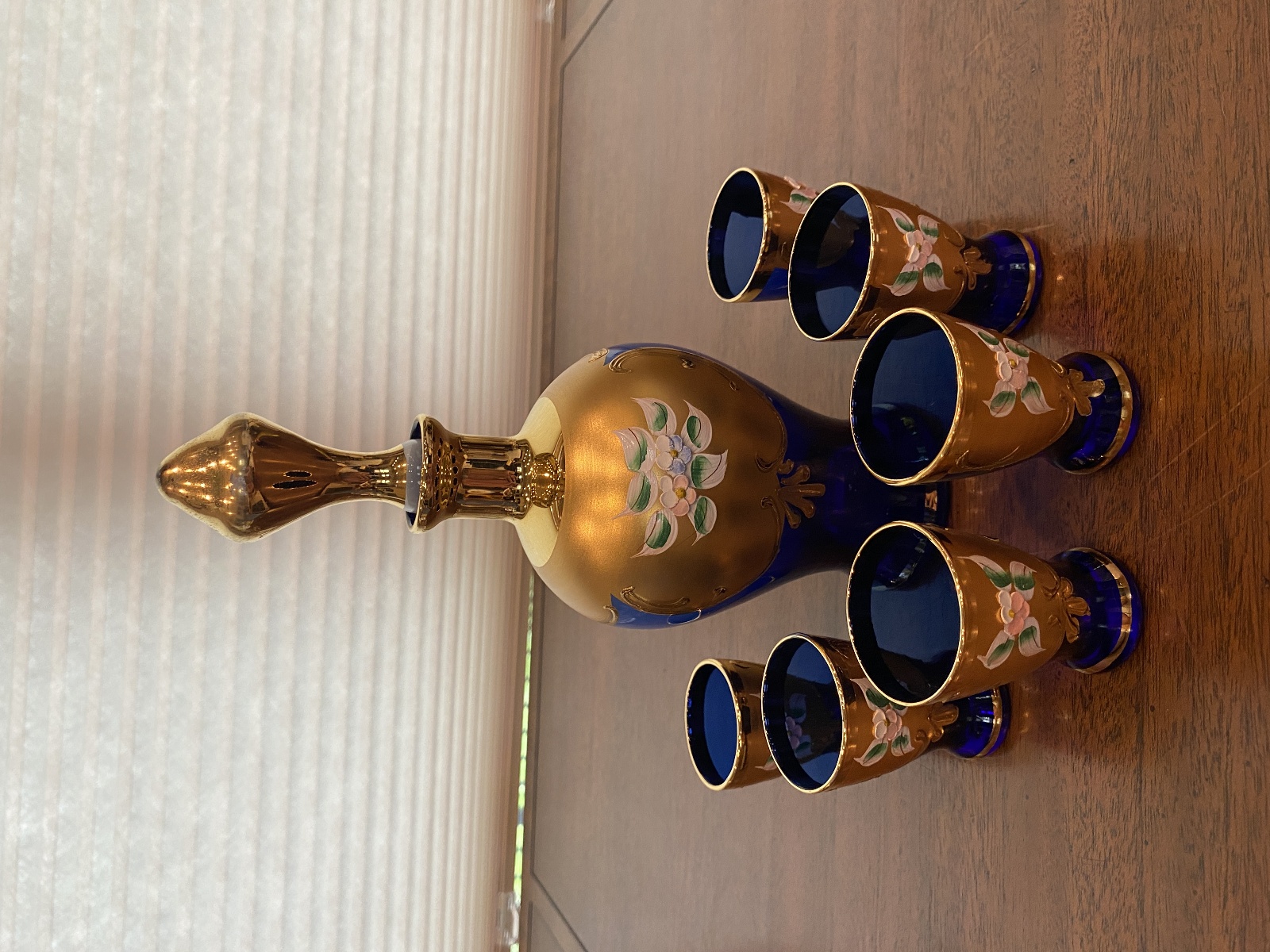 Approximate measurements 3.5"W x 10"H(7"H W/Out Stopper) 1.5"W x 2"H(6 Glasses). 100% of the proceeds go to the registered non profit Cards of Love Inc. and with your purchase you are helping raise money to fund scholarships for at risk youth. Thank you!