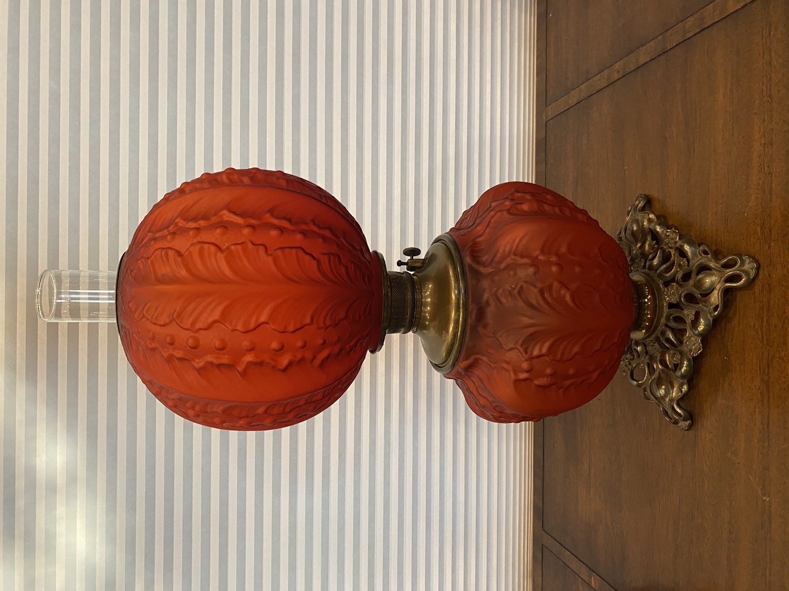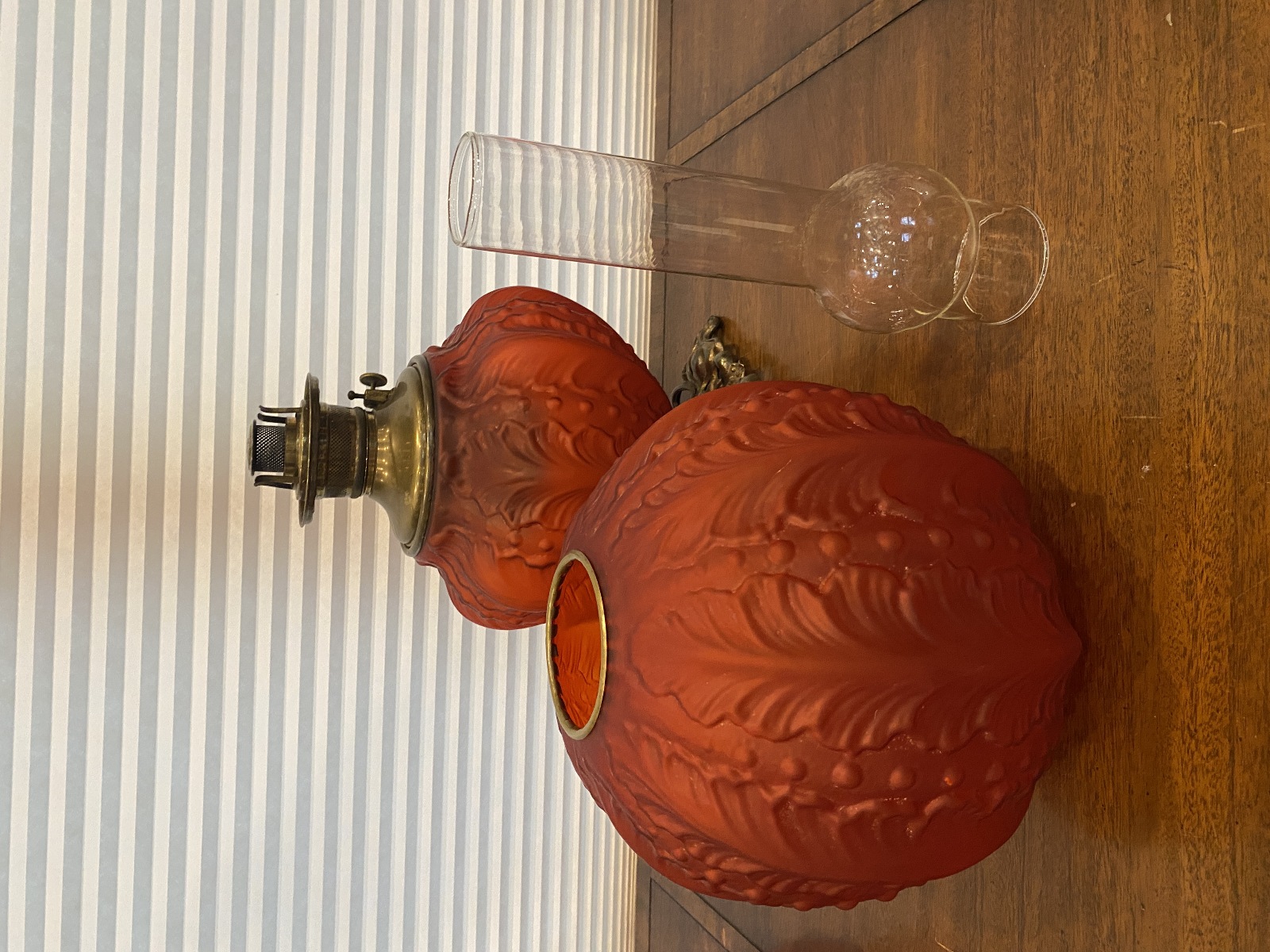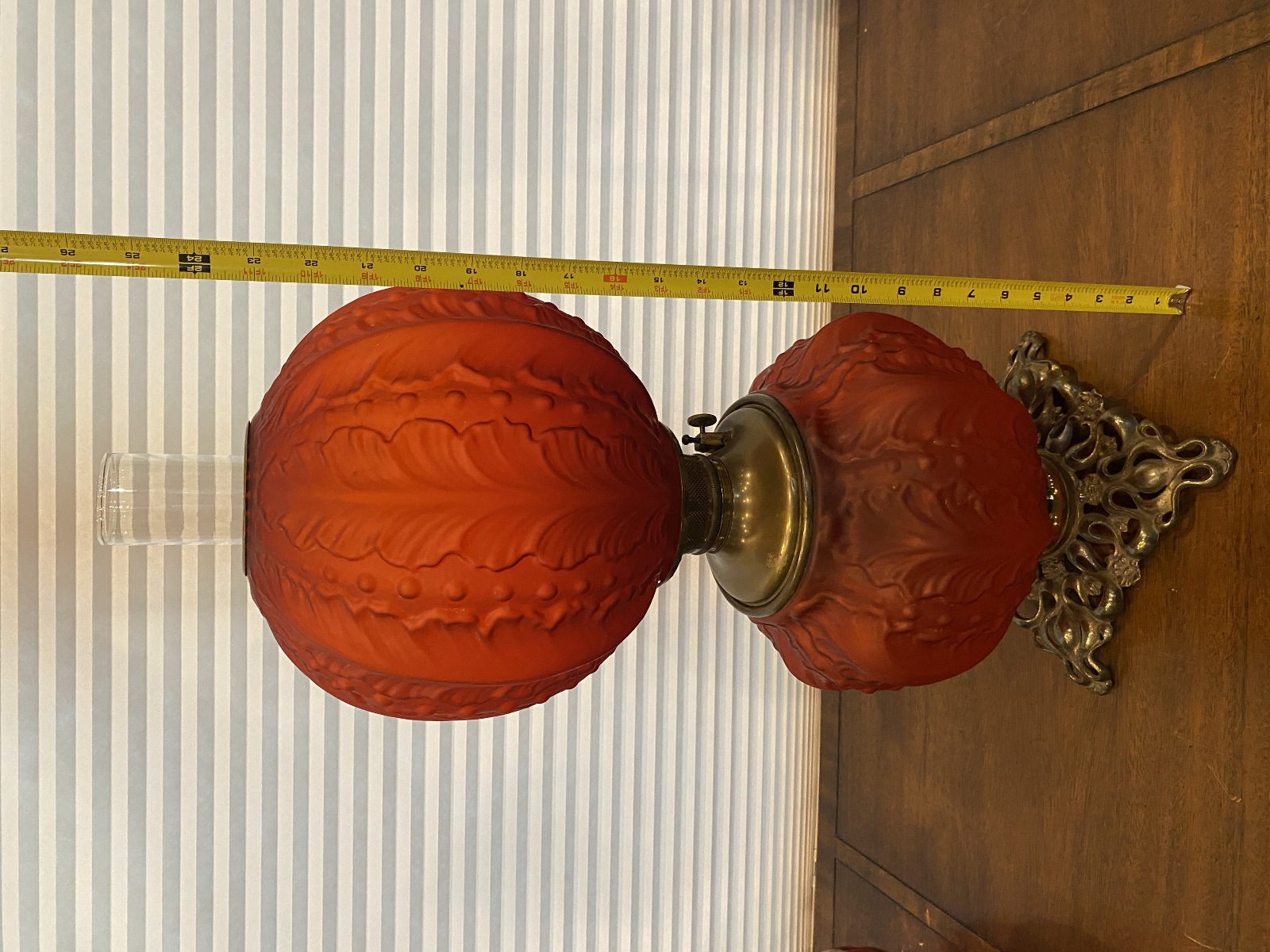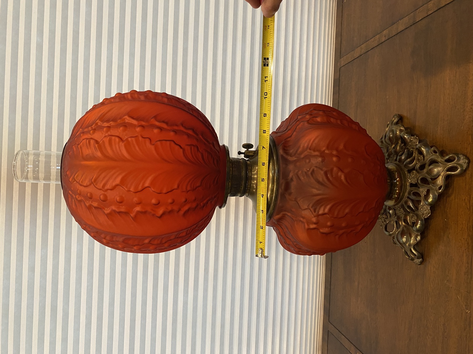 Good/fair used condition (PLEASE NOTE THAT THE BASE HAS A SMALL HARD TO SEE INTERNAL CRACK NOTED IN THE PHOTOS, THER IS ALSO SOME minor scratching to the glass and some slight wear to the metal from many years of love, also the shade has some chips on the bottom of the globe(very common for a piece this age) noted in the photos, but overall this gorgeous lamp is still in good shape for its age). Please refer back to the photos for condition and feel free to message me if you have any questions. Thank you)!